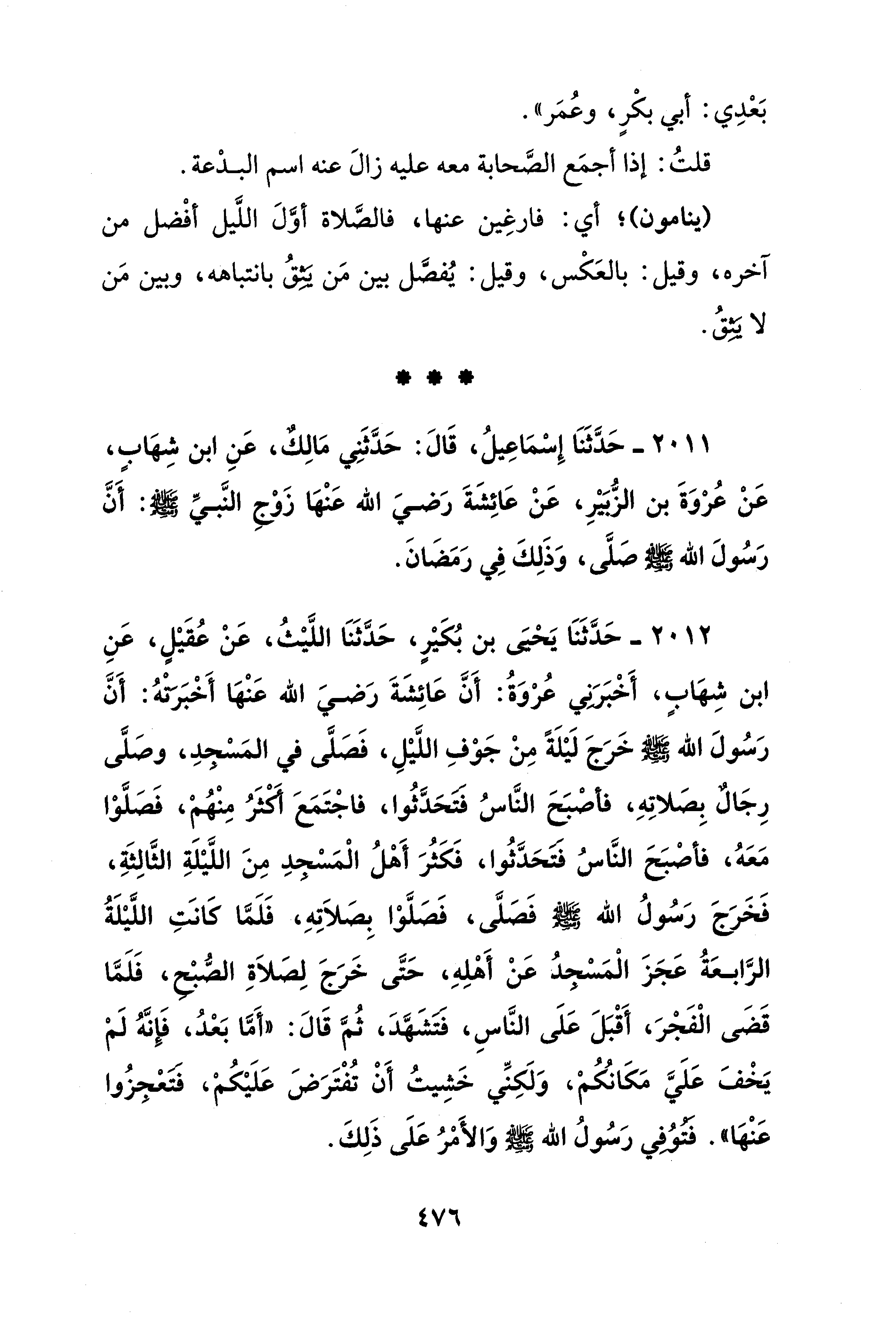 2012 - حَدَّثَنَا يَحْيَى بن بُكَيْرٍ، حَدَّثَنَا اللَّيْثُ، عَنْ عُقَيْلٍ، عَنِ ابن شِهابٍ، أَخْبَرَني عُرْوَةُ: أَنَّ عَائِشَةَ رَضيَ الله عَنْها أَخْبَرتْهُ: أَنَّ رَسُولَ الله - صلى الله عليه وسلم - خَرَجَ لَيْلَةً مِنْ جَوْفِ اللَّيْلِ، فَصَلَّى في المَسْجدِ، وصَلَّى رِجَالٌ بِصَلاتِهِ، فأصْبَحَ النَّاسُ فتحَدَّثُوا، فاجْتَمَعَ أكثَرُ مِنْهُم، فَصَلَّوْا مَعَهُ، فأصْبَحَ النَّاسُ فتحَدَّثُوا، فَكَثُرَ أَهْلُ الْمَسْجدِ مِنَ اللَّيْلَةِ الثَّالِثَةِ، فَخَرَجَ رَسُولُ الله - صلى الله عليه وسلم - فَصَلَّى، فَصَلَّوْا بِصَلاَتِهِ، فَلَمَّا كَانَتِ اللَّيْلَةُ الرَّابعَةُ عَجَزَ الْمَسْجدُ عَنْ أَهْلِهِ، حَتَّى خَرَجَ لِصَلاَةِ الصُّبْح، فَلَمَّا قَضَى الْفَجْرَ، أَقْبَلَ عَلَى النَّاسِ، فتشَهَّدَ، ثُمَّ قَالَ: "أَمَّا بَعْدُ، فَإِنَّهُ لَم يَخْفَ عَلَيَّ مَكَانُكُمْ، وَلَكِنِّي خَشِيتُ أَنْ تُفْتَرَضَ عَلَيْكُمْ، فتعْجزُوا عَنْها". فَتُوُفي رَسُولُ الله - صلى الله عليه وسلم - وَالأَمْرُ عَلَى ذَلِكَ.