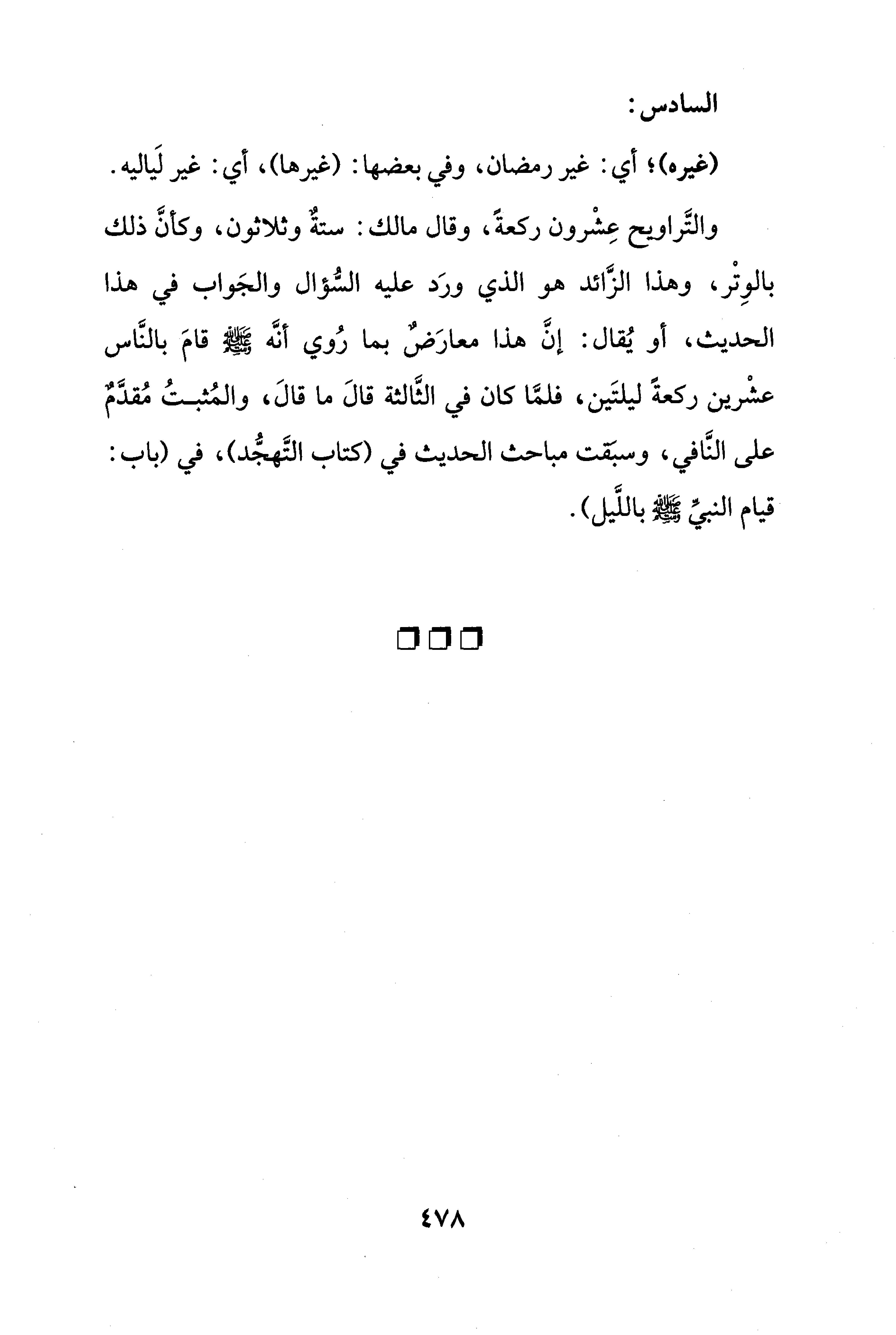 والتَّراويح عِشْرون ركعةً، وقال مالك: ستةٌ وثلاثون، وكأنَّ ذلك بالوِتْر، وهذا الزَّائد هو الذي ورَد عليه السُّؤال والجَواب في هذا الحديث، أو يُقال: إنَّ هذا معارَضٌ بما رُوي أنَّه - صلى الله عليه وسلم - قامَ بالنَّاس عشْرين ركعةً ليلتَين، فلمَّا كان في الثَّالثة قالَ ما قالَ، والمُثبتُ مُقدَّمٌ على النَّافي، وسبَقت مباحث الحديث في (كتاب التَّهجُّد)، في (باب: قيام النبي - صلى الله عليه وسلم - باللَّيل).