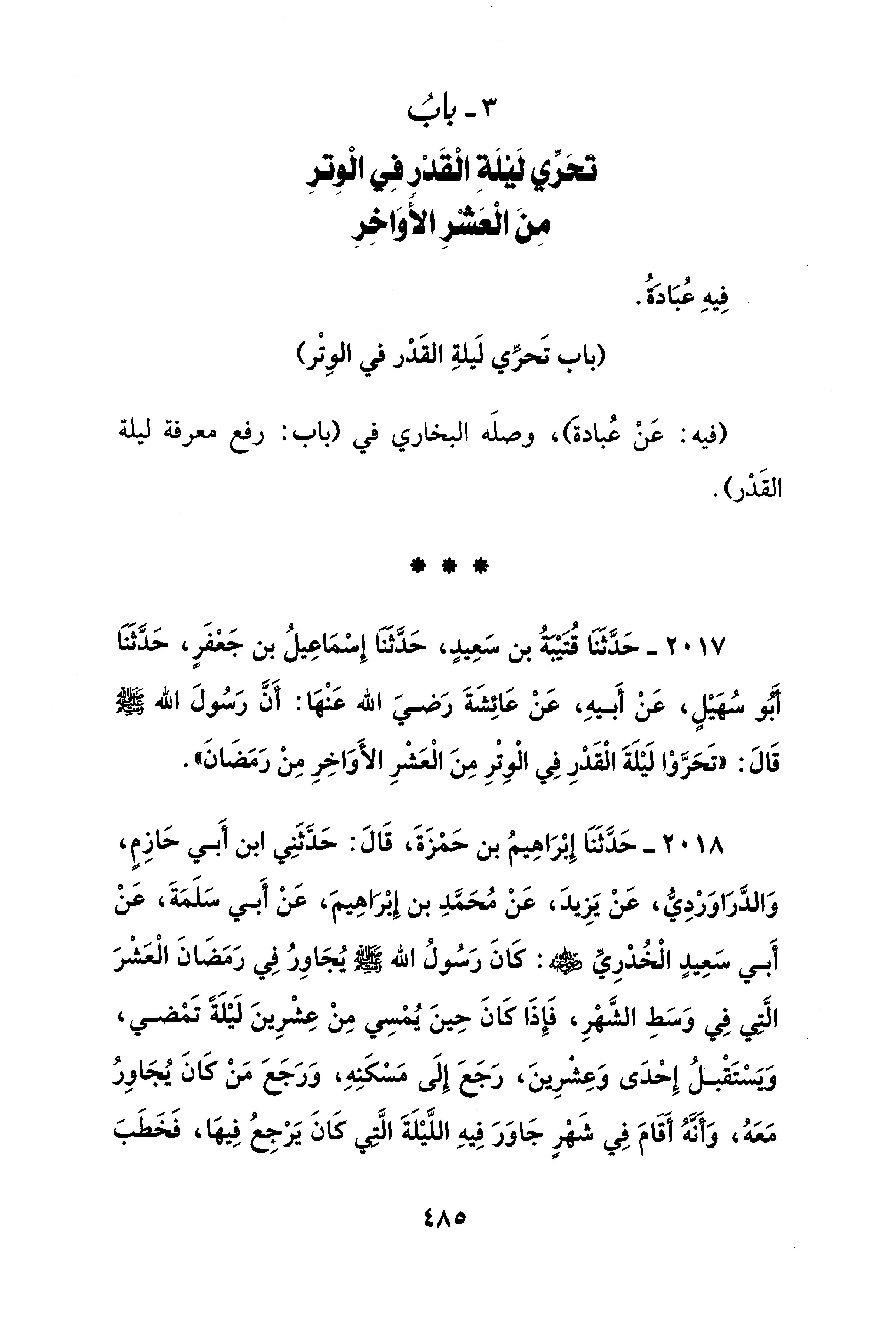 2017 - حَدَّثَنَا قتيْبةُ بن سَعِيدٍ، حَدَّثَنَا إِسْمَاعِيلُ بن جَعْفَرٍ، حَدَّثَنَا أبو سُهيْلٍ، عَنْ أَبيهِ، عَنْ عَائِشَةَ رَضيَ الله عَنْها: أَنَّ رَسُولَ الله - صلى الله عليه وسلم - قَالَ: "تَحَرَّوْا لَيْلَةَ الْقَدرِ فِي الْوِتْرِ مِنَ الْعَشْرِ الأَوَاخِرِ مِنْ رَمَضَانَ".