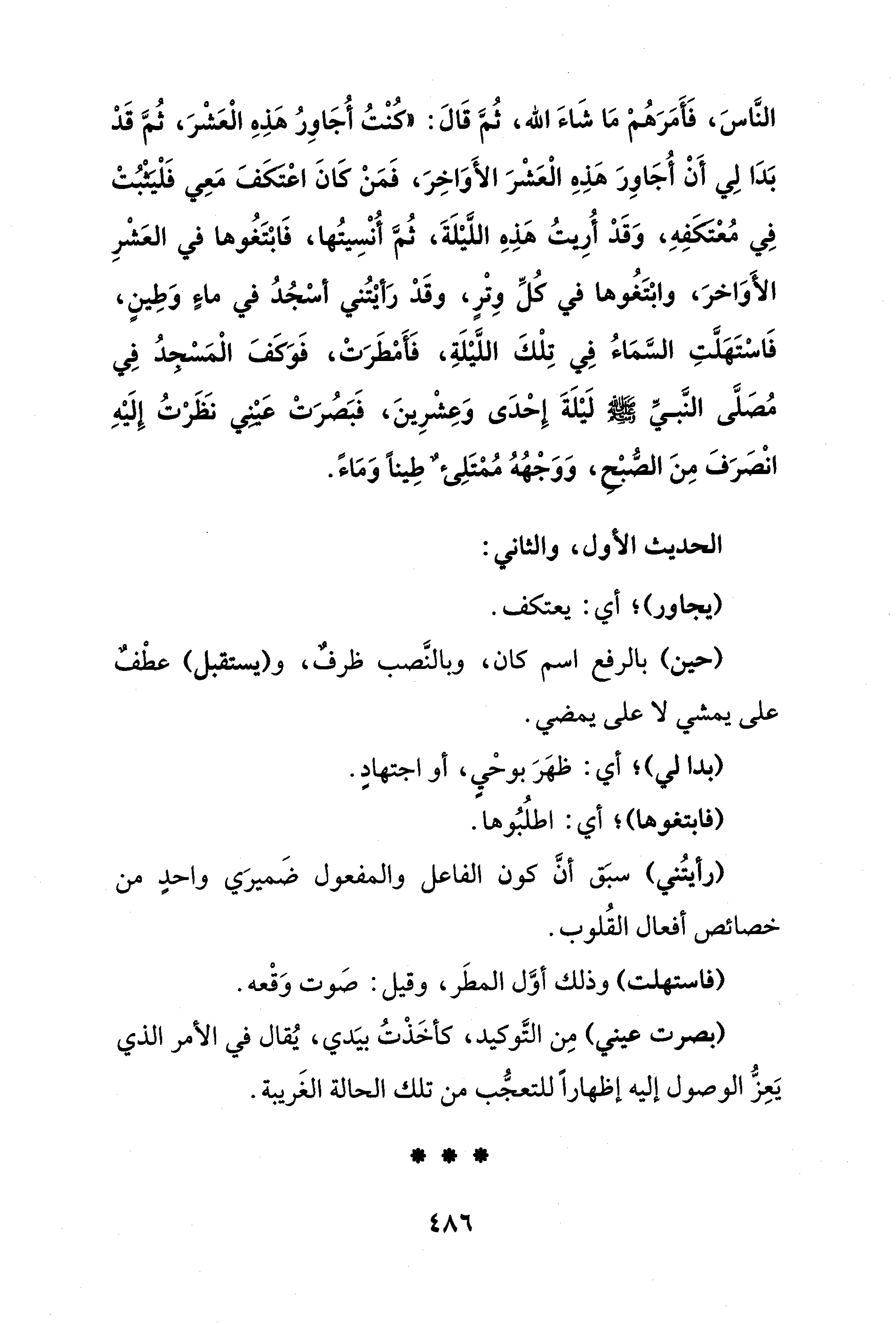 النَّاسَ، فَأَمَرَهم مَا شَاءَ الله، ثُمَّ قَالَ: "كُنْتُ أُجَاوِرُ هذِهِ الْعَشْرَ، ثُمَّ قدْ بَدَا لِي أَنْ أُجَاوِرَ هذِهِ الْعَشْرَ الأَوَاخِرَ، فَمَنْ كَانَ اعْتكَفَ مَعِي فَلْيثبُتْ فِي مُعْتكَفِهِ، وَقَد أُرِيتُ هذِهِ اللَّيْلَةَ، ثُمَّ أُنْسِيتُها، فَابْتغُوها في العَشْرِ الأَوَاخرَ، وابْتَغُوها في كُلِّ وِتْرٍ، وقَدْ رَأيْتُني أسْجُدُ في ماءٍ وَطِينٍ، فَاسْتَهلَّتِ السَّمَاءُ فِي تِلْكَ اللَّيْلَةِ، فَأمطَرَتْ، فَوَكَفَ الْمَسْجدُ فِي مُصَلَّى النَّبيِّ - صلى الله عليه وسلم - لَيْلَةَ إحْدَى وَعِشْرِينَ، فَبَصُرَتْ عَيني نَظَرتُ إِلَيْهِ انْصَرَفَ مِنَ الصُّبْح، وَوَجْهُهُ مُمتَلِئٌ طِينًا وَمَاءً.