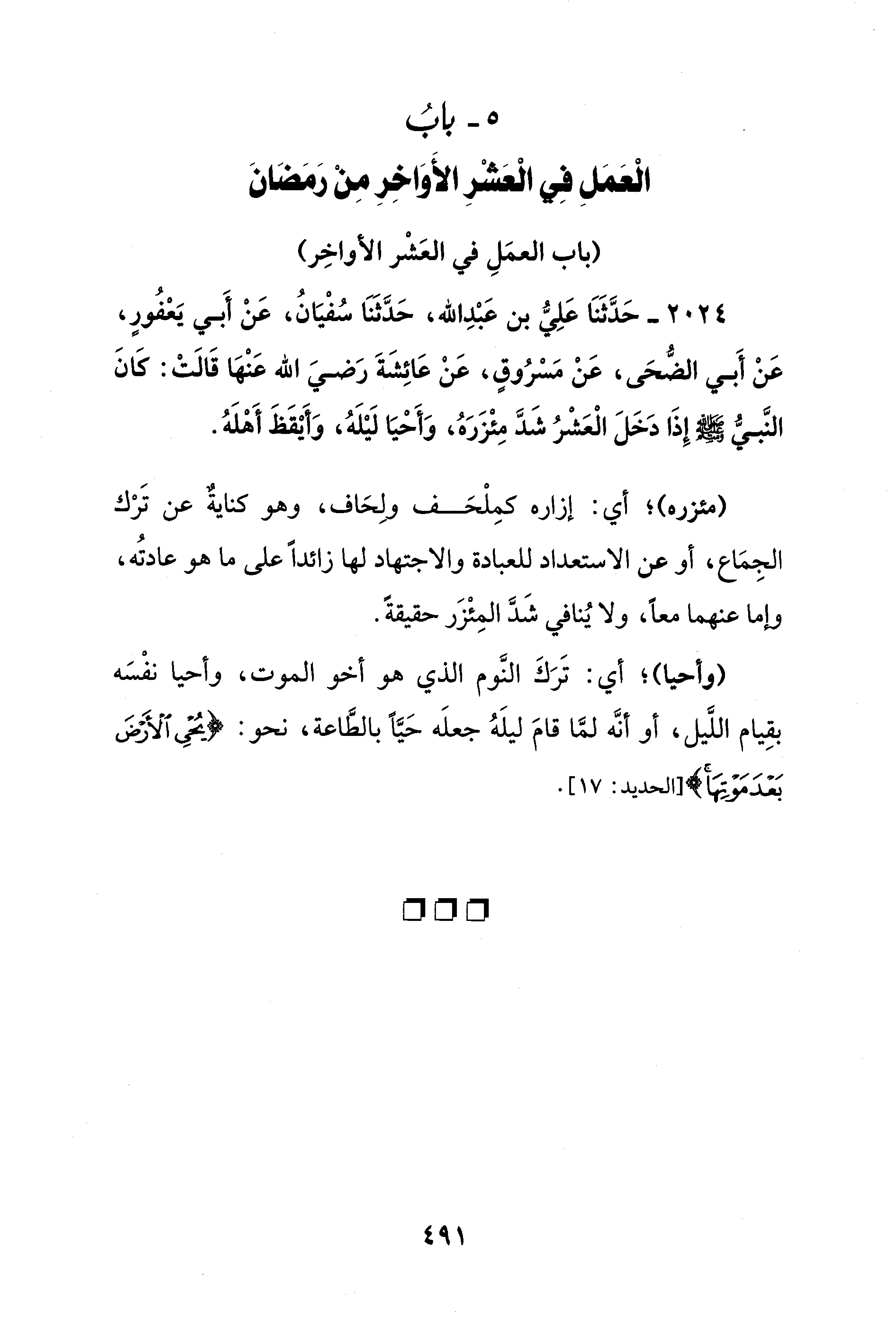 2024 - حَدَّثَنَا عَلِيُّ بن عَبْدِ الله، حَدَّثَنَا سُفْيَانُ، عَنْ أَبي يَعْفُورٍ، عَنْ أَبي الضُّحَى، عَنْ مَسْرُوقٍ، عَنْ عَائِشَةَ رَضيَ الله عَنْها قَالَتْ: كَانَ النَّبيُّ - صلى الله عليه وسلم - إِذَا دَخَلَ الْعَشْرُ شَدَّ مِئْزَرَهُ، وَأَحْيَا لَيْلَهُ، وَأَيْقَظَ أَهْلَهُ.