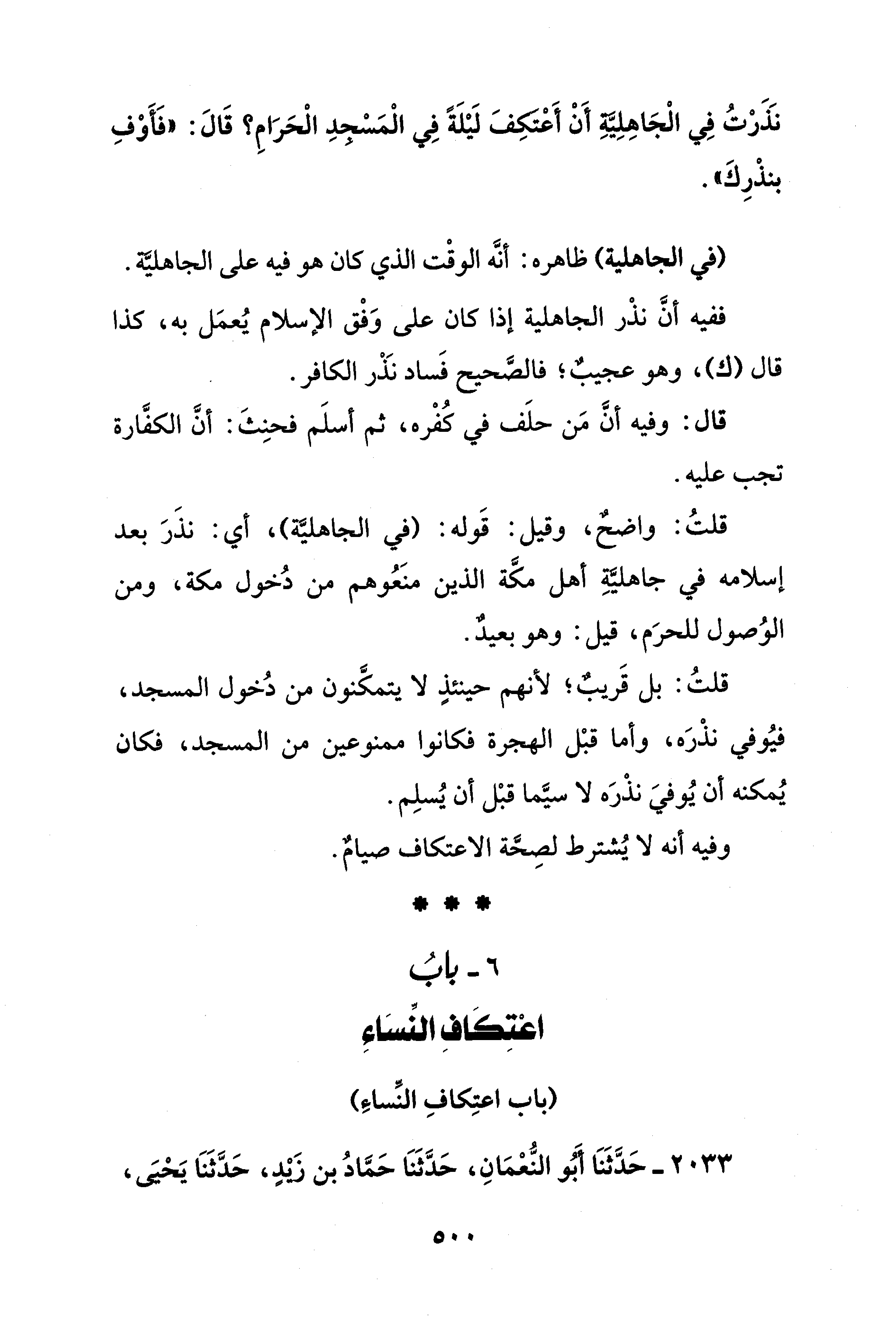 قلتُ: واضحٌ، وقيل: قَوله: (في الجاهلية)، أي: نذَرَ بعد إسلامه في جاهليَّةِ أهل مكَّة الذين منَعُوهم من دُخول مكة، ومن الوُصول للحرَم، قيل: وهو بعيدٌ.