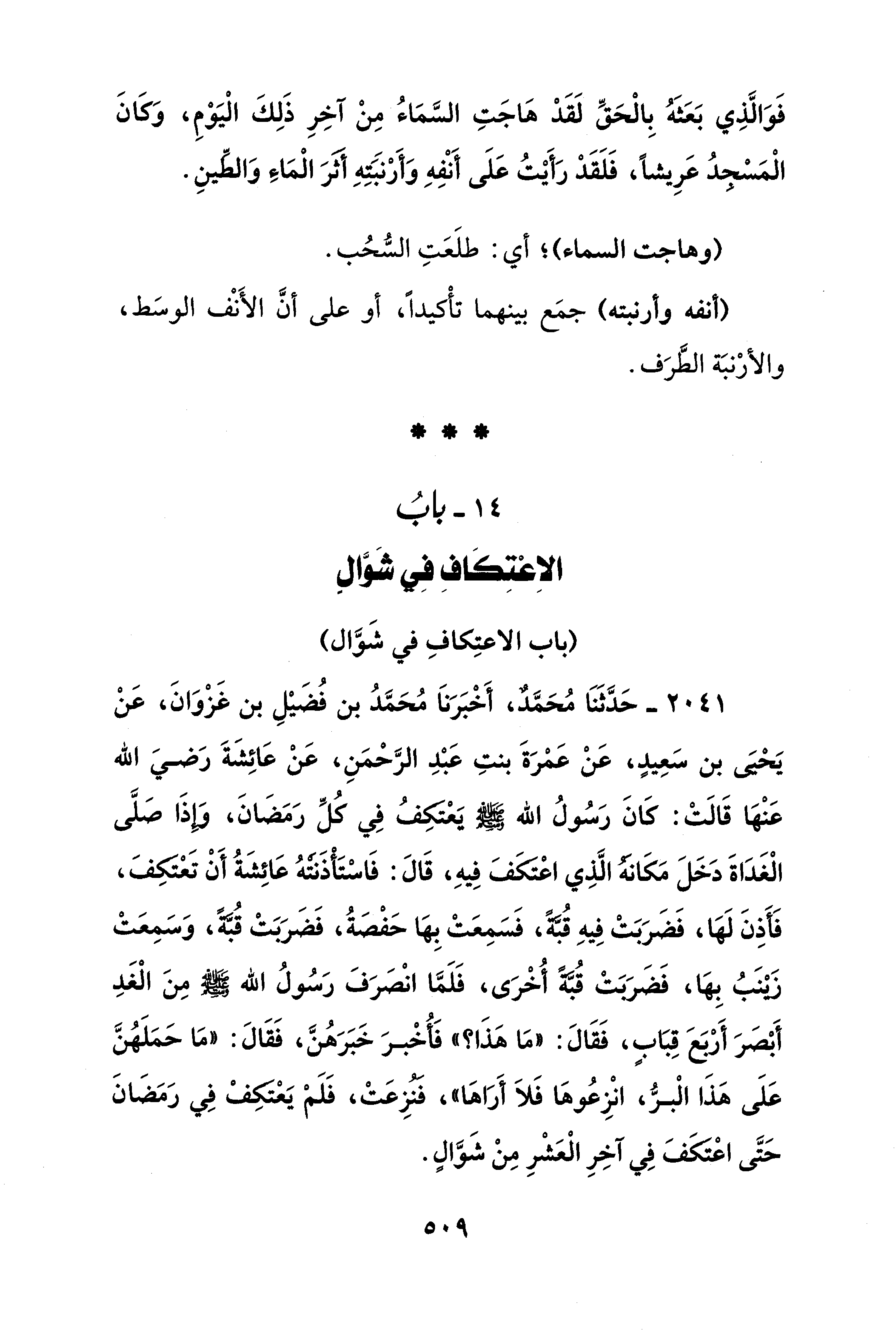 2041 - حَدَّثنا مُحَمَّدٌ، أَخْبَرَناَ مُحَمَّدُ بن فُضَيْلِ بن غَزْوَانَ، عَنْ يَحيَى بن سَعِيدٍ، عَنْ عَمْرَةَ بنتِ عَبْدِ الرَّحْمَنِ، عَنْ عَائِشَةَ رَضيَ الله عَنْها قَالَتْ: كَانَ رَسُولُ الله - صلى الله عليه وسلم - يَعْتكِفُ فِي كُلِّ رَمَضَانَ، وإذَا صَلَّى الْغَدَاةَ دَخَلَ مَكَانه الَّذِي اعْتكَفَ فِيهِ، قَالَ: فَاسْتَأذَنتهُ عَائِشَةُ أَنْ تعْتكِفَ، فَأَذِنَ لَها، فَضَرَبَتْ فِيهِ قُبَّةً، فَسَمِعَتْ بِها حَفْصَةُ، فَضَرَبَتْ قُبةً، وَسَمِعَتْ زَيْنَبُ بِها، فَضَرَبَتْ قُبَّةً أُخْرَى، فَلَمَّا انْصَرَفَ رَسُولُ الله - صلى الله عليه وسلم - مِنَ الْغَدِ أَبْصَرَ أَرْبَعَ قِبَابٍ، فَقَالَ: "مَا هذَا؟ " فَأُخْبرَ خَبَرَهُنَّ، فَقَالَ: "مَا حَمَلَهُنَّ عَلَى هذَا الْبرُّ، انْزِعُوها فَلاَ أَرَاها"، فنزِعَتْ، فَلَم يَعتكِفْ فِي رَمَضَانَ حَتَّى اعتكَفَ فِي آخِرِ الْعَشْرِ مِنْ شَوَّالٍ.