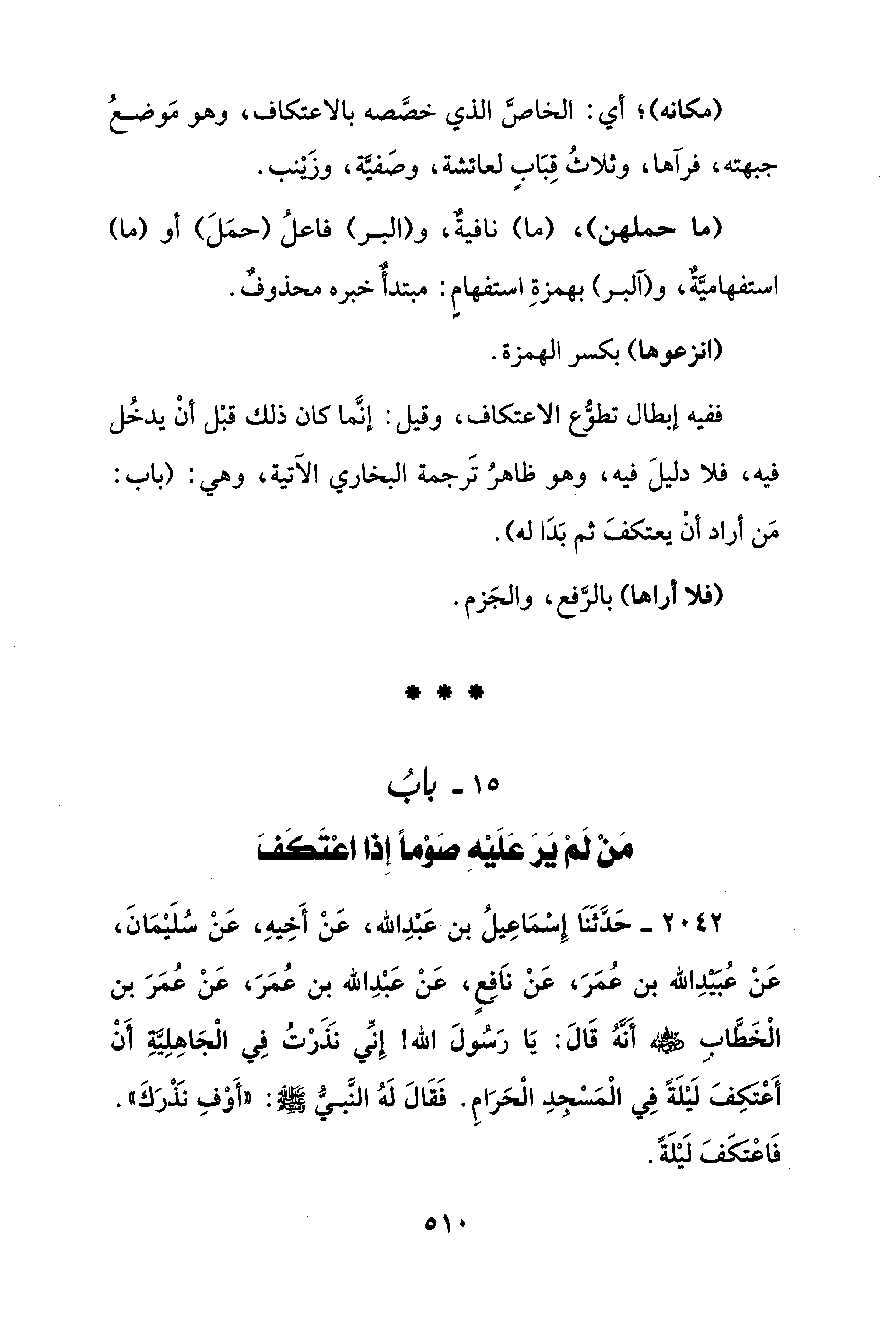 2042 - حَدَّثَنَا إِسْمَاعِيلُ بن عَبْدِ الله، عَنْ أَخِيهِ، عَنْ سُلَيْمَانَ، عَنْ عُبَيْدِ الله بن عُمَرَ، عَنْ ناَفِعٍ، عَنْ عَبْدِ الله بن عُمَرَ، عَنْ عُمَرَ بن الْخَطَّابِ - رضي الله عنه - أَنَّهُ قَالَ: يَا رَسُولَ الله! إِنِّي نَذَرْتُ فِي الْجَاهِلِيَّةِ أَنْ أعْتكِفَ لَيْلَةً فِي الْمَسْجدِ الْحَرَامِ. فَقَالَ لَهُ النَّبيُّ - صلى الله عليه وسلم -: "أَوْفِ نَذْرَكَ". فَاعتكَفَ لَيْلَةً.