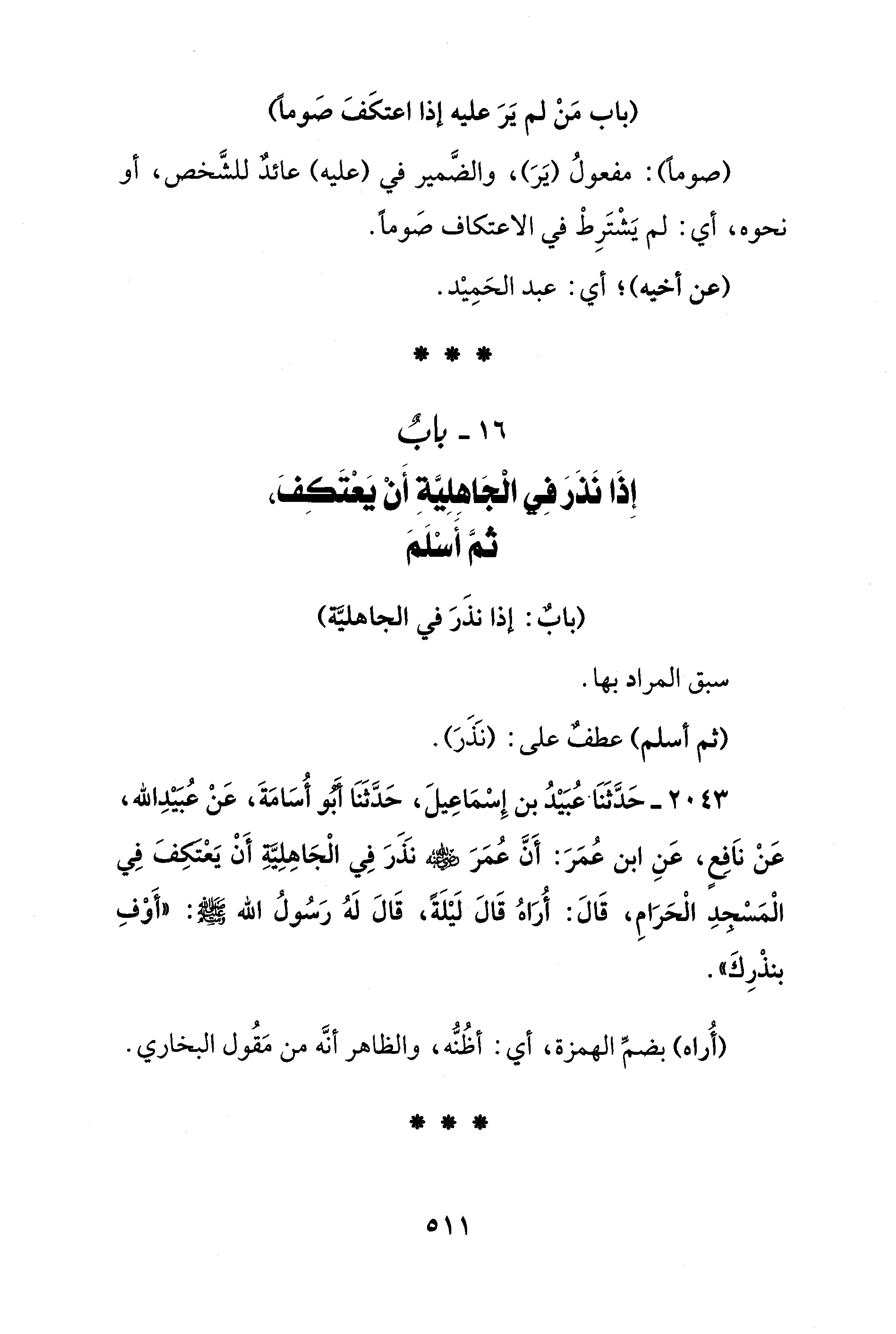 2043 - حَدَّثَنَا عُبَيْدُ بن إِسْمَاعِيلَ، حَدَّثَنَا أبو أُسَامَةَ، عَنْ عُبَيْدِ الله، عَنْ ناَفِعٍ، عَنِ ابن عُمَرَ: أَنَّ عُمَر - رضي الله عنه - نَذَرَ فِي الْجَاهِلِيةِ أَنْ يعْتكِفَ فِي الْمَسْحدِ الْحَرَامِ، قَالَ: أُرَاهُ قَالَ لَيْلَةً، قَالَ لَهُ رَسُولُ الله - صلى الله عليه وسلم -: "أَوْفِ بنذْرِكَ".