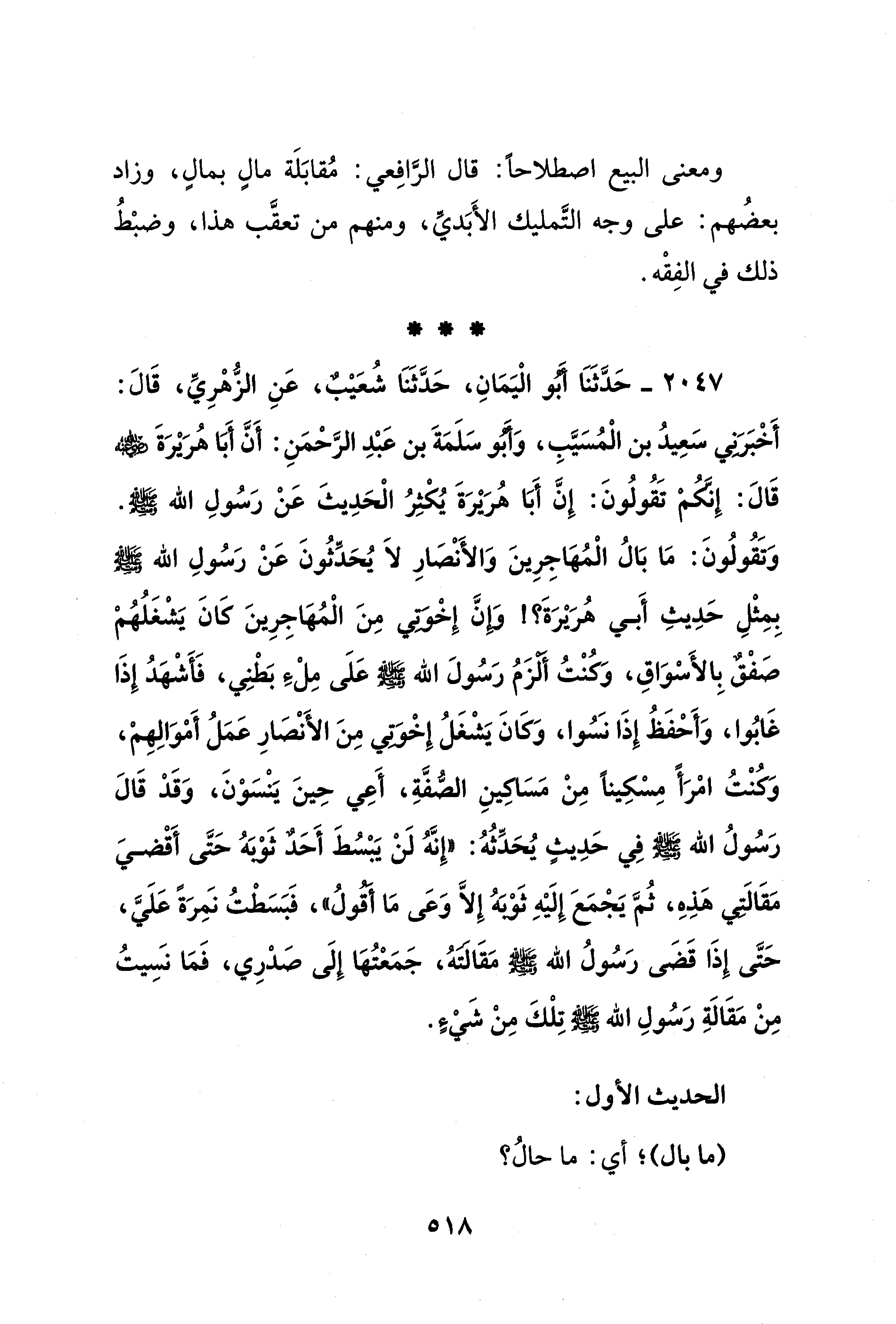 2047 - حَدَّثَنَا أبو الْيَمَانِ، حَدَّثَنَا شُعَيْبٌ، عَنِ الزُّهْرِيِّ، قَالَ: أَخْبَرَني سَعِيدُ بن الْمُسَيَّبِ، وَأبُو سَلَمَةَ بن عَبْدِ الرَّحْمَنِ: أَنَّ أبا هُرَيْرَةَ - رضي الله عنه - قَالَ: إِنَّكم تَقُولُونَ: إِنَّ أَبَا هُرَيْرَةَ يُكْثِرُ الْحَدِيثَ عَنْ رَسُولِ الله - صلى الله عليه وسلم -. وَتَقُولُونَ: مَا بَالُ الْمُهاجِرِينَ وَالأَنْصَارِ لاَ يُحَدِّثُونَ عَنْ رَسُولِ الله - صلى الله عليه وسلم - بِمِثْلِ حَدِيثِ أَبي هُرَيْرَةَ؟! وَإِنَّ إِخْوَتي مِنَ الْمُهاجِرِينَ كَانَ يَشْغَلُهُم صَفْق بِالأَسْوَاقِ، وَكنْتُ ألزمُ رَسُولَ الله - صلى الله عليه وسلم - عَلَى مِلْءِ بَطْنِي، فَأَشْهدُ إِذَا غَابُوا، وَأَحْفَظُ إِذَا نسُوا، وَكَانَ يَشْغَلُ إِخْوتي مِنَ الأَنْصَارِ عَمَلُ أَموَالِهِم، وكُنْتُ امرَأً مِسْكِينًا مِنْ مَسَاكِينِ الصُّفَّةِ، أَعِي حِينَ يَنْسَوْنَ، وَقَد قَالَ رَسُولُ الله - صلى الله عليه وسلم - فِي حَدِيثٍ يُحَدِّثُهُ: "إِنَّهُ لَنْ يبسُطَ أَحدٌ ثَوْبَهُ حَتَّى أَقْضيَ مَقَالَتي هذِهِ، ثُمَّ يَجْمَعَ إِلَيْهِ ثَوْبَهُ إِلَّا وَعَى مَا أَقُولُ"، فَبَسَطْتُ نَمِرَةً عَلَيَّ، حَتَّى إِذَا قَضَى رَسُولُ الله - صلى الله عليه وسلم - مَقَالتهُ، جَمَعْتُها إِلَى صَدرِي، فَمَا نَسِيتُ مِنْ مَقَالَةِ رَسُولِ الله - صلى الله عليه وسلم - تِلْكَ مِنْ شَيْءٍ.