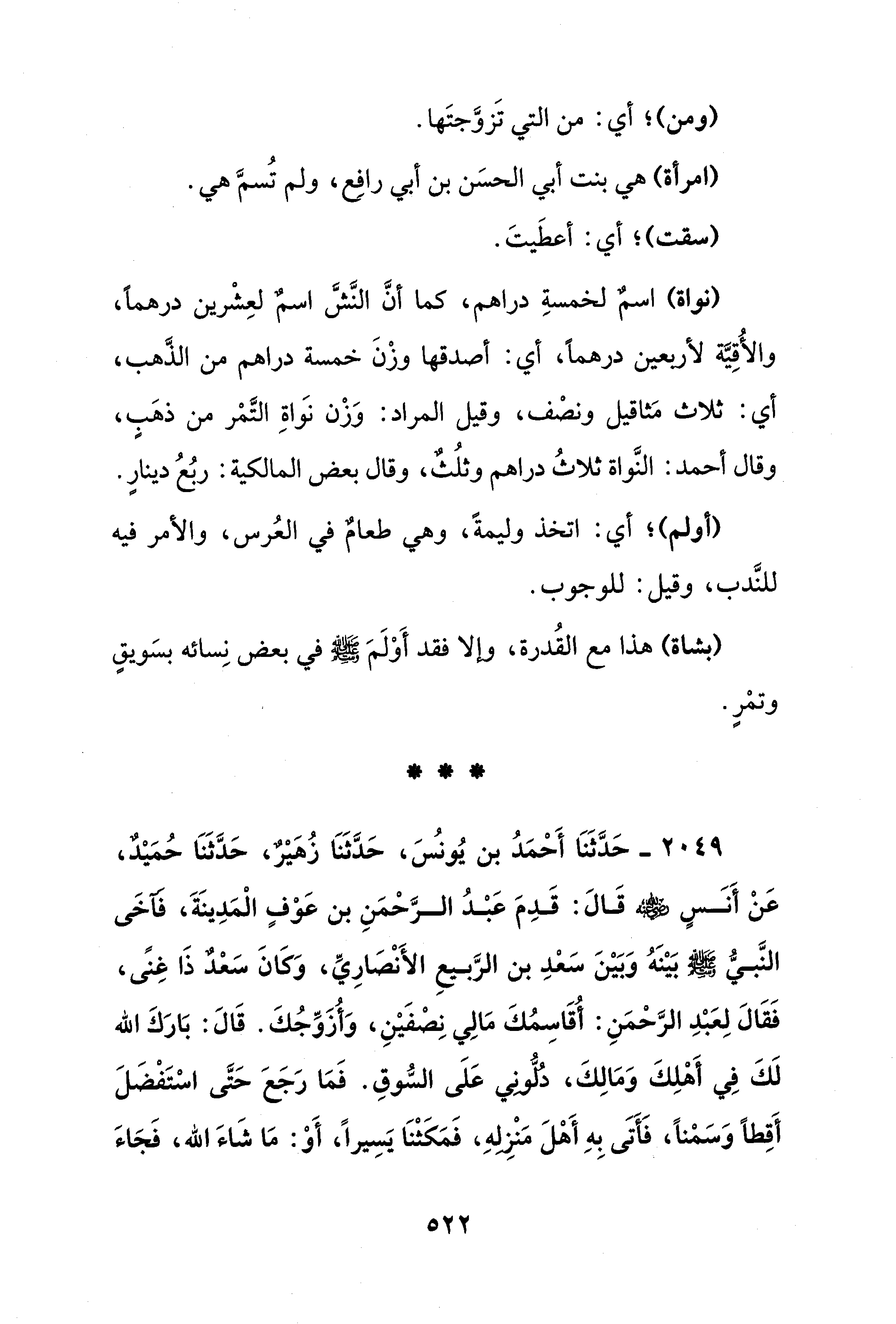 2049 - حَدَّثَنَا أَحْمَدُ بن يُونس، حَدَّثَنَا زُهيْرٌ، حَدَّثَنَا حُمَيدٌ، عَنْ أَنَسٍ - رضي الله عنه - قَالَ: قَدِمَ عَبْدُ الرَّحْمَنِ بن عَوْفٍ الْمَدِينَةَ، فآخَى النَّبيُّ - صلى الله عليه وسلم - بَيْنَهُ وَبَيْنَ سَعدِ بن الرَّبيعِ الأَنْصَارِيِّ، وَكَانَ سَعدٌ ذَا غنًى، فَقَالَ لِعَبْدِ الرَّحْمَنِ: أُقَاسِمُكَ مَالِي نِصفَيْنِ، وَأُزَوِّجُكَ. قَالَ: بَارَكَ الله لَكَ فِي أَهْلِكَ وَمَالِكَ، دُلُّونِي عَلَى السُّوقِ. فَمَا رَجَعَ حَتَّى اسْتَفْضَلَ أَقِطًا وَسَمنًا، فَأَتَى بِهِ أَهْلَ مَنْزِلِهِ، فَمَكَثْنَا يَسِيرًا، أَوْ: مَا شَاءَ الله، فَجَاءَ