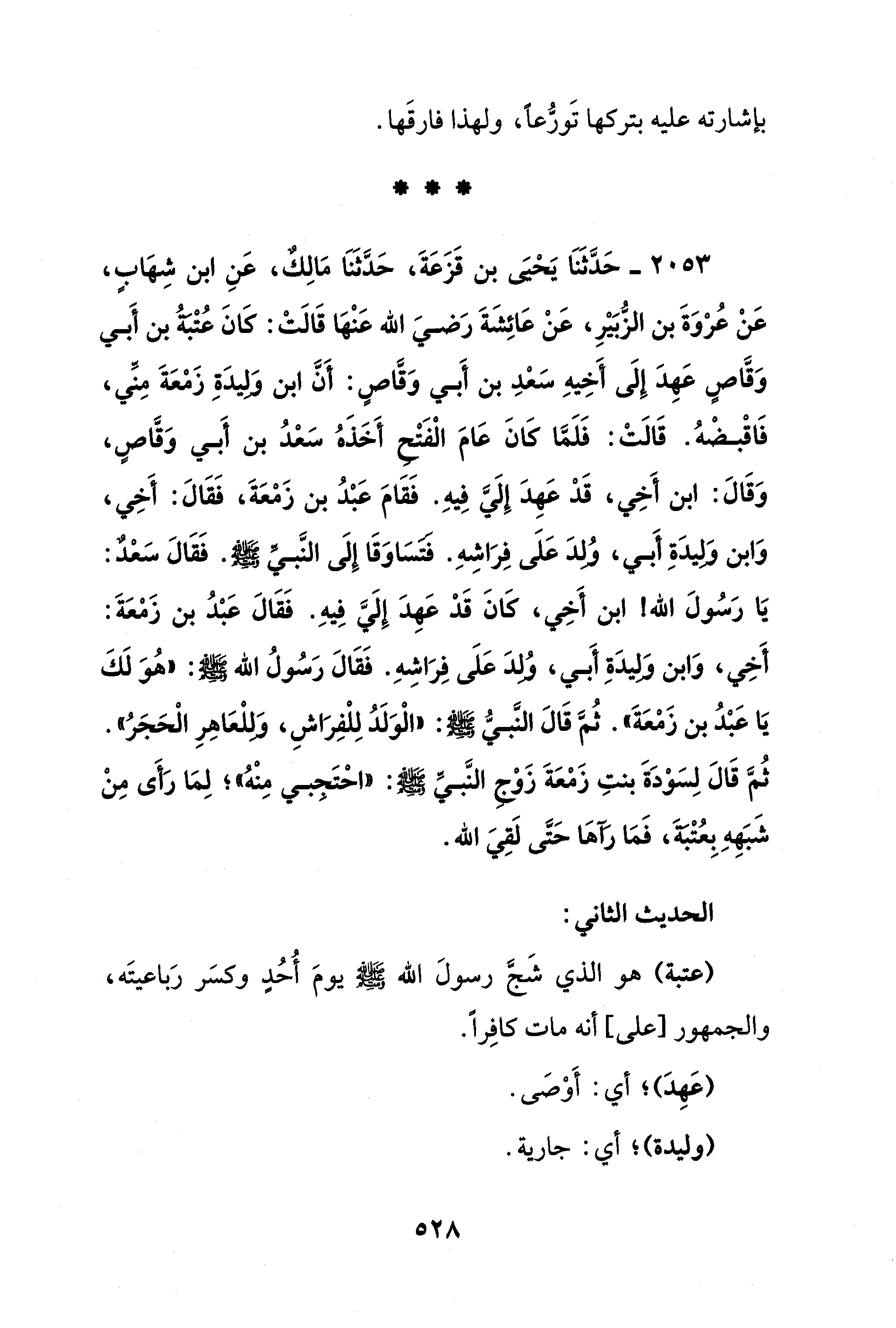 2053 - حَدَّثَنَا يَحيَى بن قَزَعَةَ، حَدَّثَنَا مَالكٌ، عَنِ ابن شِهابٍ، عَنْ عُرْوَةَ بن الزُّبَيْرِ، عَنْ عَائِشَةَ رَضيَ الله عَنْها قَالَتْ: كَانَ عُتْبةُ بن أَبي وَقَّاصٍ عَهِدَ إِلَى أَخِيهِ سَعْدِ بن أَبي وَقَّاصٍ: أَنَّ ابن وَليدَةِ زَمْعَةَ مِنِّي، فَاقْبضْهُ. قَالَتْ: فَلَمَّا كَانَ عَامَ الْفَتْح أَخَذَهُ سَعْدُ بن أَبي وَقَّاصٍ، وَقَالَ: ابن أَخِي، قَدْ عَهِدَ إِلَيَّ فِيهِ. فَقَامَ عَبْدُ بن زمعَةَ، فَقَالَ: أَخِي، وَابن وليدَةِ أَبي، وُلِدَ عَلَى فِرَاشِهِ. فتسَاوَقَا إِلَى النَّبيِّ - صلى الله عليه وسلم -. فَقَالَ سَعْدٌ: يَا رَسُولَ الله! ابن أَخِي، كَانَ قَدْ عَهِدَ إِلَيَّ فِيهِ. فَقَالَ عَبْدُ بن زَمْعَةَ: أَخِي، وَابن وَليدَةِ أَبي، وُلدَ عَلَى فِرَاشِهِ. فَقَالَ رَسُولُ الله - صلى الله عليه وسلم -: "هُوَ لَكَ يَا عَبْدُ بن زَمعَةَ". ثُمَّ قَالَ النَّبيُّ - صلى الله عليه وسلم -: "الْوَلَدُ لِلْفِرَاشِ، وَللْعَاهِرِ الْحَجَرُ". ثُمَّ قَالَ لِسَوْدَةَ بنتِ زَمْعَةَ زَوْجِ النَّبي - صلى الله عليه وسلم -: "احتَجبي مِنْهُ"؛ لِمَا رَأَى مِنْ شَبَهِهِ بِعُتْبةَ، فَمَا رآها حَتَّى لَقِيَ الله.