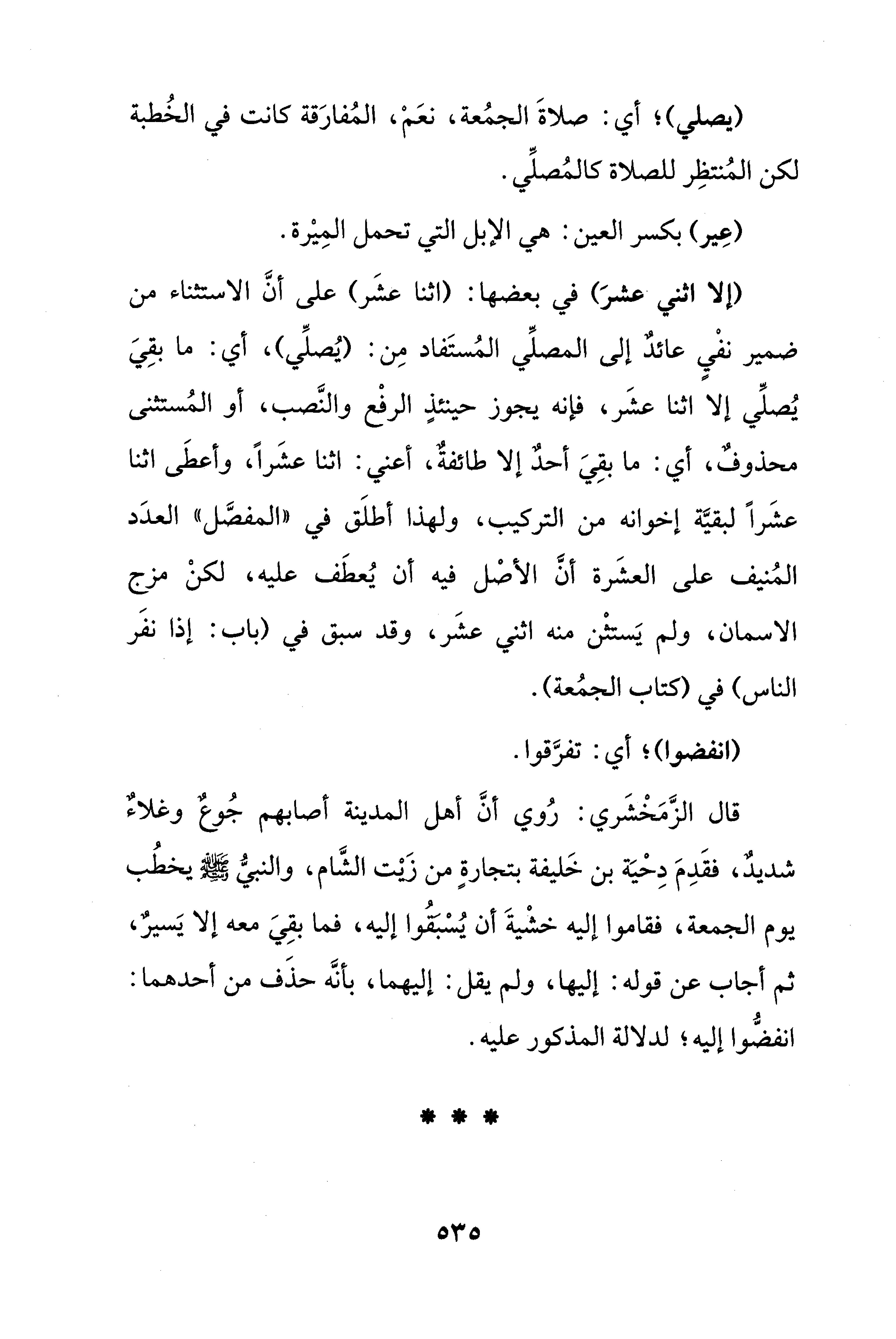 (إلا اثني عشرَ) في بعضها: (اثنا عشَر) على أنَّ الاستثناء من ضمير نفْيِ عائدٌ إلى المصلِّي المُستَفاد مِن: (يُصلِّي)، أي: ما بقِيَ يُصلِّي إلا اثنا عشَر، فإنه يجوز حينئذٍ الرفْع والنَّصب، أو المُستثنى محذوفٌ، أي: ما بقِيَ أحدٌ إلا طائفة، أعني: اثنا عشَرًا، وأعطَى اثنا عشَرًا لبقيَّة إخوانه من التركيب، ولهذا أطلَق في "المفصَّل" العدَد المُنيف على العشَرة أنَّ الأصْل فيه أن يُعطَف عليه، لكنْ مزج الاسمان، ولم يَستثْن منه اثني عشَر، وقد سبق في (باب: إذا نفَر الناس) في (كتاب الجمُعة).