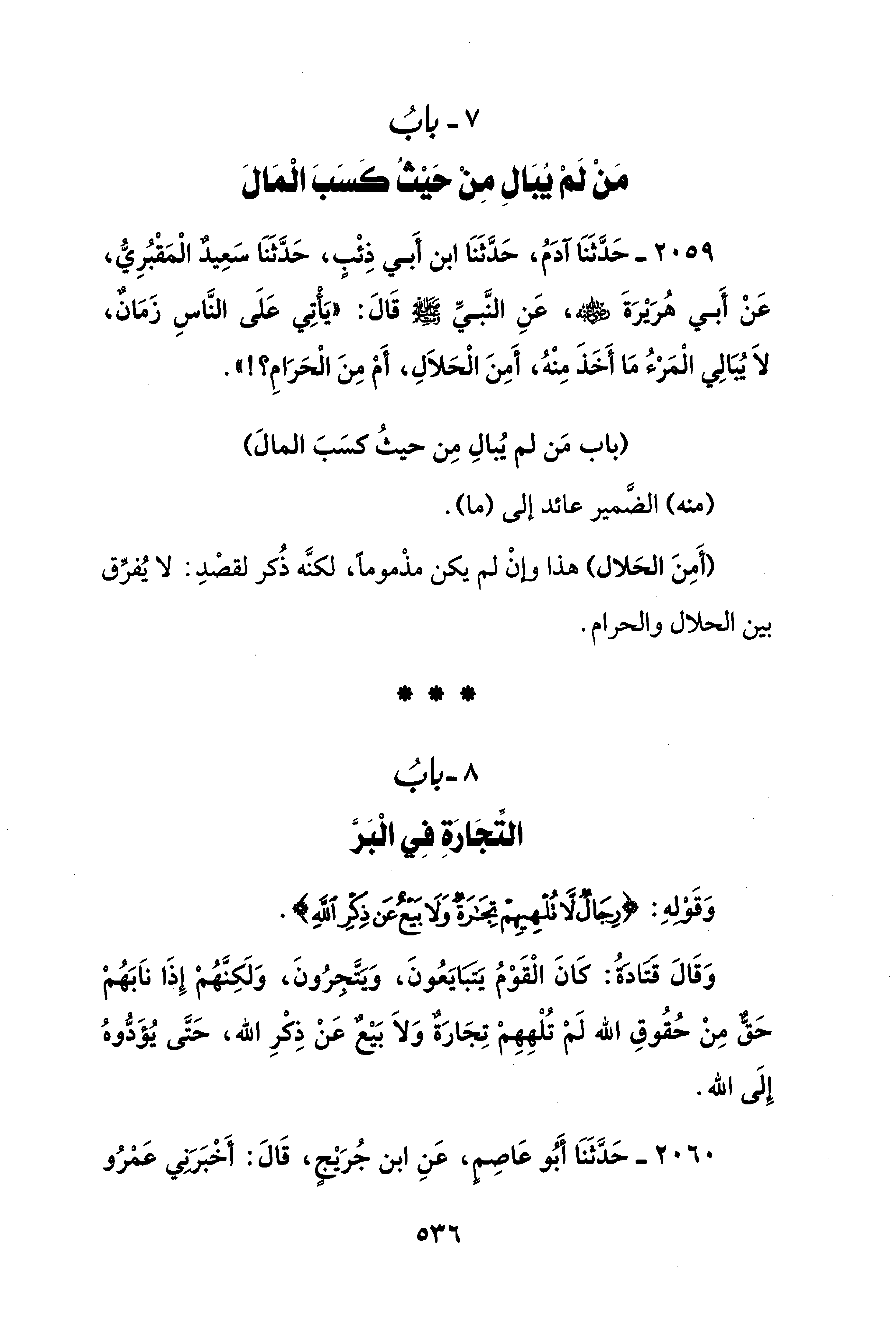 2059 - حَدَّثَنَا آدَمُ، حَدَّثَنَا ابن أَبي ذِئْبٍ، حَدَّثَنَا سَعِيدٌ الْمَقْبُرِيُّ، عَنْ أَبي هُرَيْرَةَ - رضي الله عنه -، عَنِ النَّبيِّ - صلى الله عليه وسلم - قَالَ: "يَأْتِي عَلَى النَّاسِ زَمَانٌ، لاَ يُبَالِي الْمرْءُ مَا أَخَذَ مِنْهُ، أَمِنَ الْحَلاَلِ، أَم مِنَ الْحَرام؟! ".