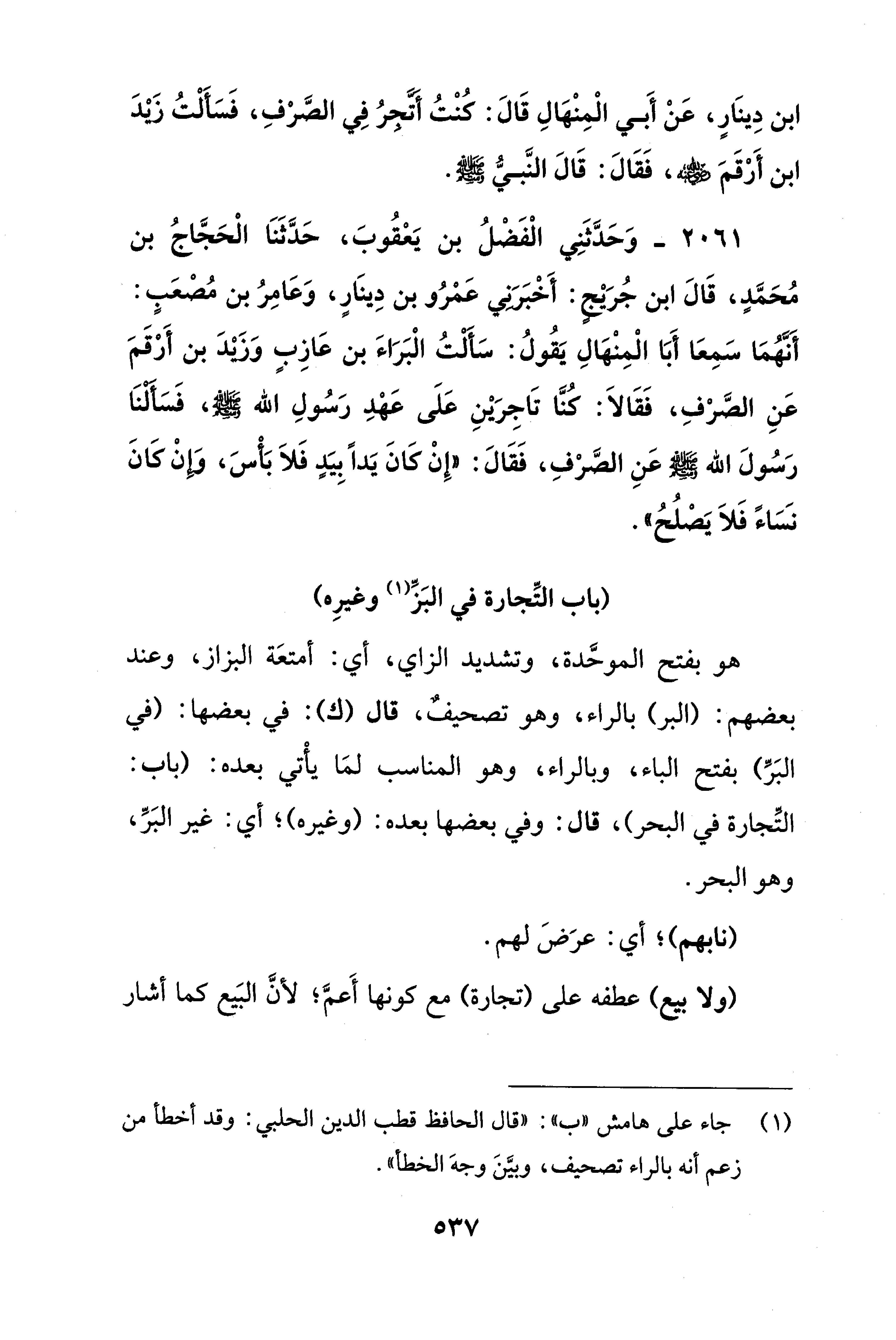 ابن دِينَارٍ، عَنْ أَبي الْمِنهالِ قَالَ: كُنْتُ أتَّجِرُ فِي الصَّرْفِ، فَسَأَلْتُ زيدَ ابن أَرْقَمَ - رضي الله عنه -، فَقَالَ: قَالَ النَّبيُّ - صلى الله عليه وسلم -.