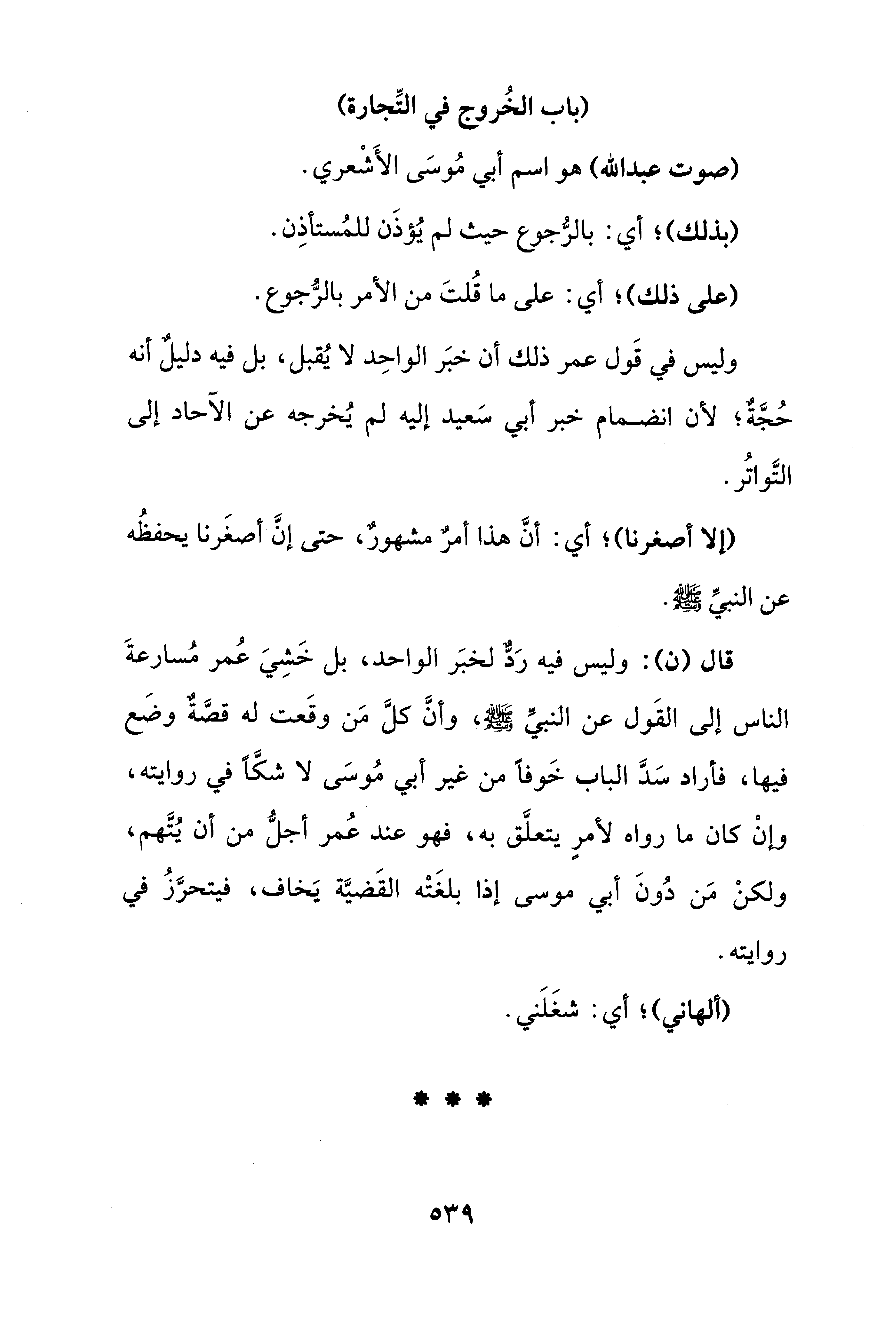 قال (ن): وليس فيه رَدٌّ لخبَر الواحد، بل خَشِيَ عُمر مُسارعةَ الناس إلى القَول عن النبي - صلى الله عليه وسلم -، وأنَّ كلَّ مَن وقَعت له قصَّةٌ وضَع فيها، فأراد سَدَّ الباب خَوفًا من غير أبي مُوسَى لا شكًّا في روايته، وإنْ كان ما رواه لأمرٍ يتعلَّق به، فهو عند عُمر أجلُّ من أن يُتَّهم، ولكنْ مَن دُونَ أبي موسى إذا بلغَتْه القَضيَّة يَخاف، فيتحرَّزُ في روايته.
