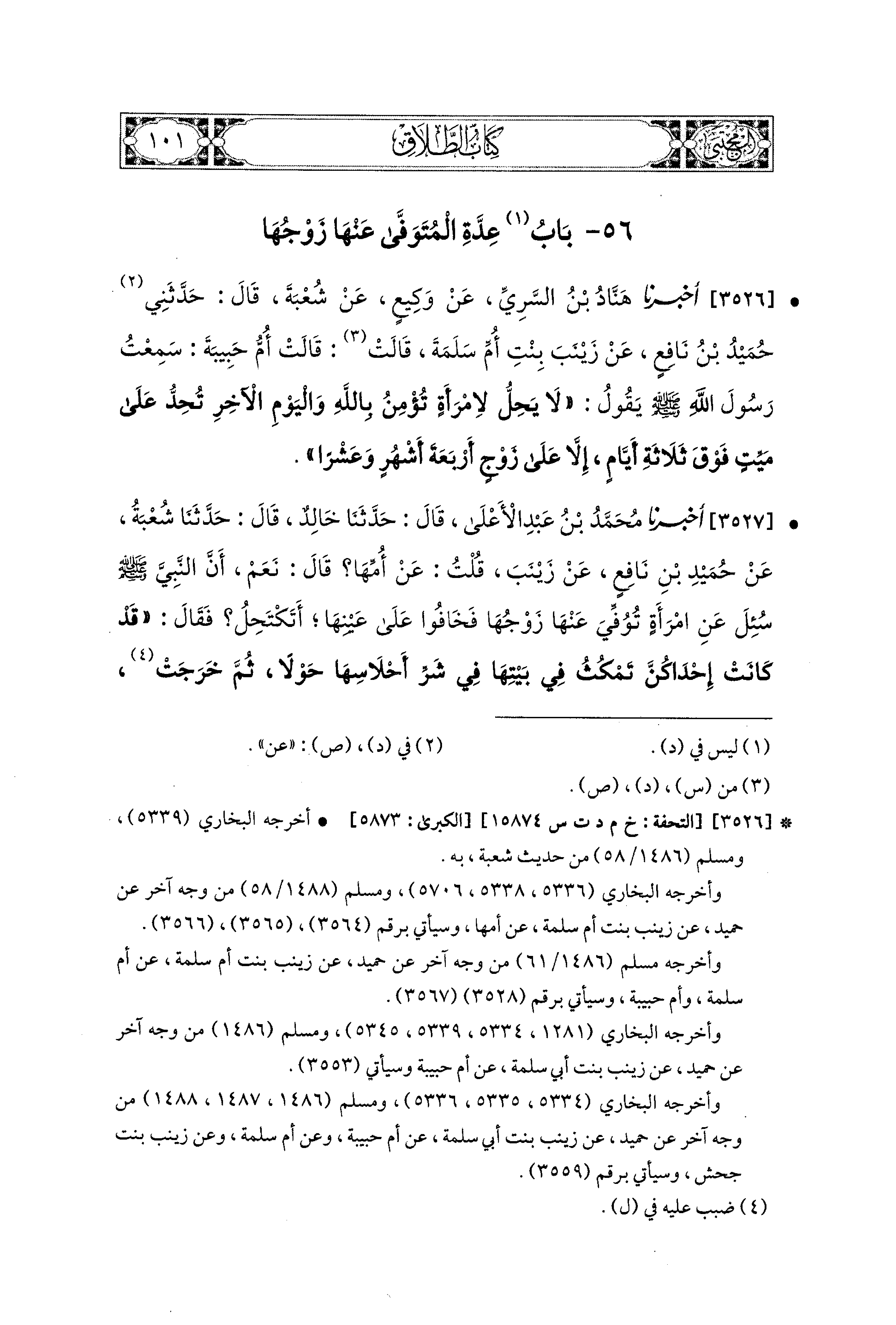 3526- أَخبَرَنا هَنَّادُ بْنُ السَّرِيِّ، عَن وَكِيعٍ، عَن شُعْبَةَ، قَالَ: حَدَّثَني حُمَيْدُ بْنُ نَافِعٍ، عَن زَيْنَبَ بِنْتِ أُمِّ سَلَمَةَ(1)، قَالَتْ أُمُّ حَبِيبَةَ: سَمِعْتُ رَسُولَ اللهِ صَلى الله عَليه وسَلم، يَقُولُ: لاَ يَحِلُّ لاِمْرَأَةٍ تُؤْمِنُ بِالله وَاليَوْمِ الآخِرِ تَحِدُّ عَلَى مَيِّتٍ فَوْقَ ثَلاَثَةِ أَيَّامٍ، إِلاَّ عَلَى زَوْجٍ أَرْبَعَةَ أَشْهُرٍ وَعَشْرًا.