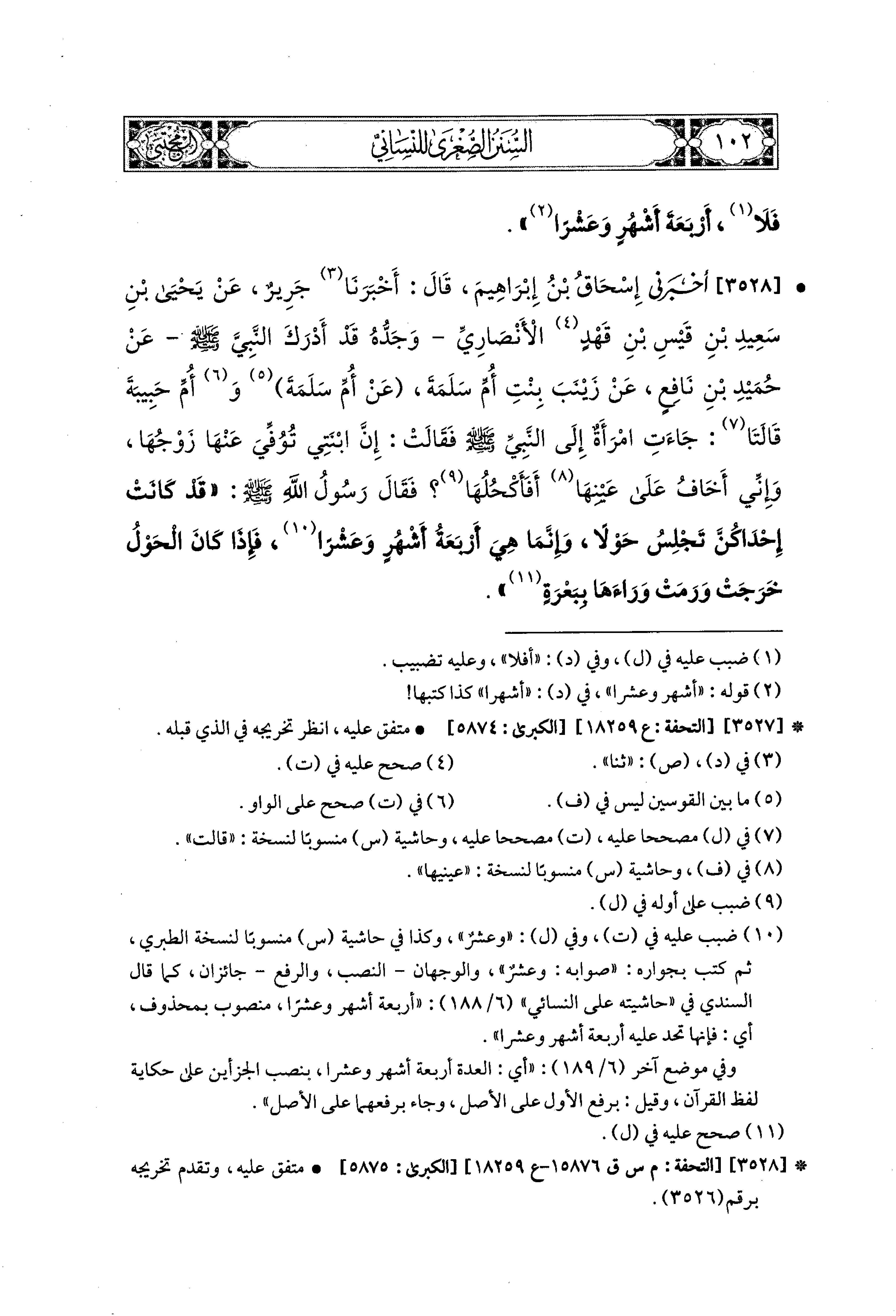 3528- أَخْبَرَني إِسحَاقُ بْنُ إِبراهِيمَ، قَالَ: أَخبَرنا جَرِيرٌ، عَن يَحيَى بْنِ سَعيدِ بْنِ قَيْسِ بْنِ قَهْدٍ الأَنصَارِيِّ، وَجَدُّهُ قَدْ أَدْرَكَ النَّبيَّ صَلى الله عَليه وسَلم، عَن حُمَيْدِ بْنِ نَافِعٍ، عَن زَيْنَبَ بِنْتِ أُمِّ سَلَمَةَ، عَن أُمِّ سَلَمَةَ، وَأُمِّ حَبِيبَةَ، قَالَتَا: جَاءَتِ امْرَأَةٌ إِلَى النَّبيِّ صَلى الله عَليه وسَلم فَقَالَتْ: إِنَّ ابْنَتِي تُوُفِّيَ عَنْهَا زَوْجُهَا، وَإِنِّي أَخَافُ عَلَى عَيْنِهَا أَفَأَكْحُلُهَا؟ فَقَالَ رَسُولُ اللهِ صَلى الله عَليه وسَلم: قَدْ كَانَتْ إِحْدَاكُنَّ تَجْلِسُ حَوْلاً، وَإِنَّمَا هِيَ أَرْبَعَةَ أَشْهُرٍ وَعَشْرًا، فَإِذَا كَانَ الحَوْلُ خَرَجَتْ وَرَمَتْ وَرَاءَهَا بِبَعْرَةٍ.