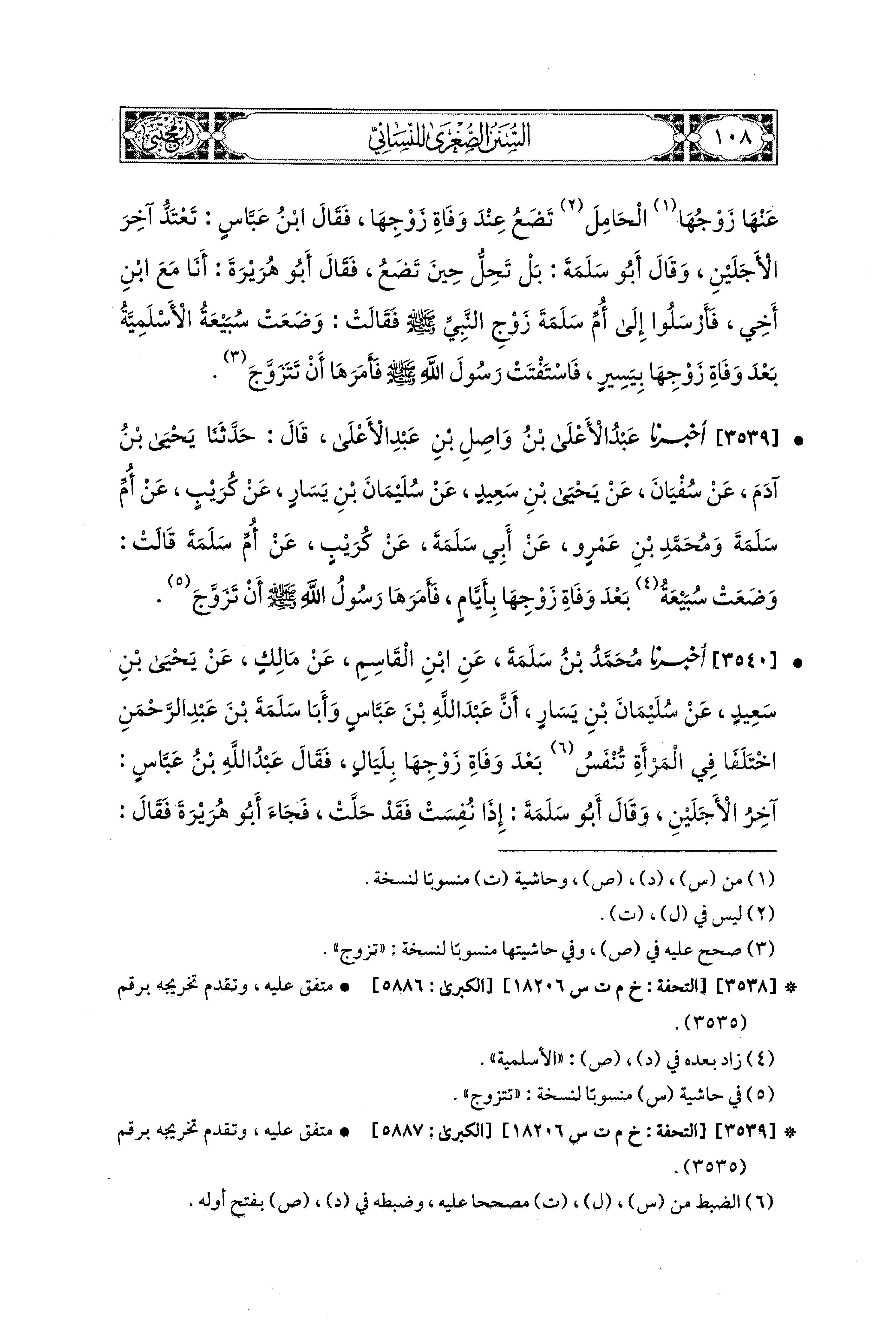 3540- أَخبَرَنا مُحَمد بْنُ سَلَمَةَ، عَنِ ابنِ القَاسِمِ، عَن مَالِكٍ، عَن يَحيَى بْنِ سَعيدٍ، عَن سُلَيمَانَ بْنِ يَسَارٍ، أَنَّ عَبدَ اللهِ بْنَ عَبَّاسٍ، وَأَبَا سَلَمَةَ بْنَ عَبدِ الرَّحمَنِ اخْتَلَفَا فِي المَرْأَةِ تُنْفَسُ بَعْدَ وَفَاةِ زَوْجِهَا بِلَيَالٍ، فَقَالَ عَبدُ اللهِ بْنُ عَبَّاسٍ: آخِرُ الأَجَلَيْنِ، وَقَالَ أَبو سَلَمَةَ: إِذَا نُفِسَتْ فَقَدْ حَلَّتْ، فَجَاءَ أَبو هُرَيرَةَ فَقَالَ: أَنَا مَعَ ابنِ أَخِي، يَعْني أَبَا سَلَمَةَ بْنَ عَبدِ الرَّحمَنِ، فَبَعَثُوا كُرَيْبًا مَوْلَى ابنِ عَبَّاسٍ، إِلَى أُمِّ سَلَمَةَ، يَسْأَلُهَا عَن ذَلِكَ، فَجَاءَهُمْ، فَأَخْبَرَهُمْ أَنَّهَا قَالَتْ: وَلَدَتْ سُبَيْعَةُ بَعْدَ وَفَاةِ زَوْجِهَا بِلَيَالٍ، فَذَكَرَتْ ذَلِكَ لِرَسُولِ اللهِ صَلى الله عَليه وسَلم، فَقَالَ: قَدْ حَلَلْتِ.