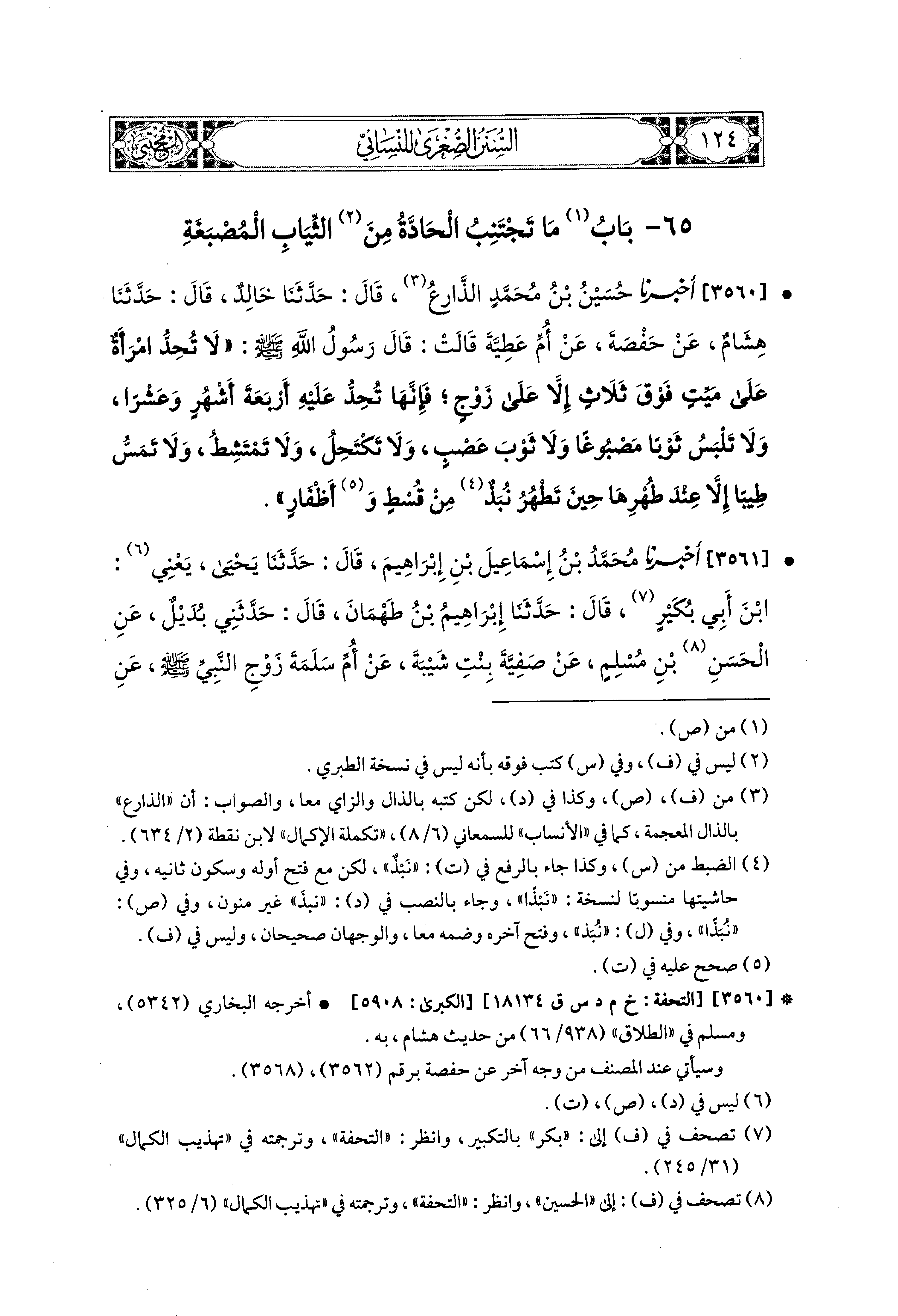 3560- أَخبَرَنا حُسَيْنُ بْنُ مُحَمدٍ الذارع، قال: حَدثنا خَالِدٌ، قال: حَدثنا هِشَامٌ، عَن حَفْصَةَ، عَن أُمِّ عَطِيَّةَ، قَالَتْ: قَالَ رَسُولُ اللهِ صَلى الله عَليه وسَلم: لاَ تَحِدُّ امْرَأَةٌ عَلَى مَيِّتٍ فَوْقَ ثَلاَثٍ إِلاَّ عَلَى زَوْجٍ، فَإِنَّهَا تَحِدُّ عَلَيْهِ أَرْبَعَةَ أَشْهُرٍ وَعَشْرًا وَلاَ تَلْبَسُ ثَوْبًا مَصْبُوغًا، وَلاَ ثَوْبَ عَصْبٍ، وَلاَ تَكْتَحِلُ، وَلاَ تَمْتَشِطُ، وَلاَ تَمَسُّ طِيبًا إِلاَّ عِنْدَ طُهْرِهَا، حِينَ تَطْهُرُ نُبَذٌ مِنْ قُسْطٍ وَأَظْفَارٍ.