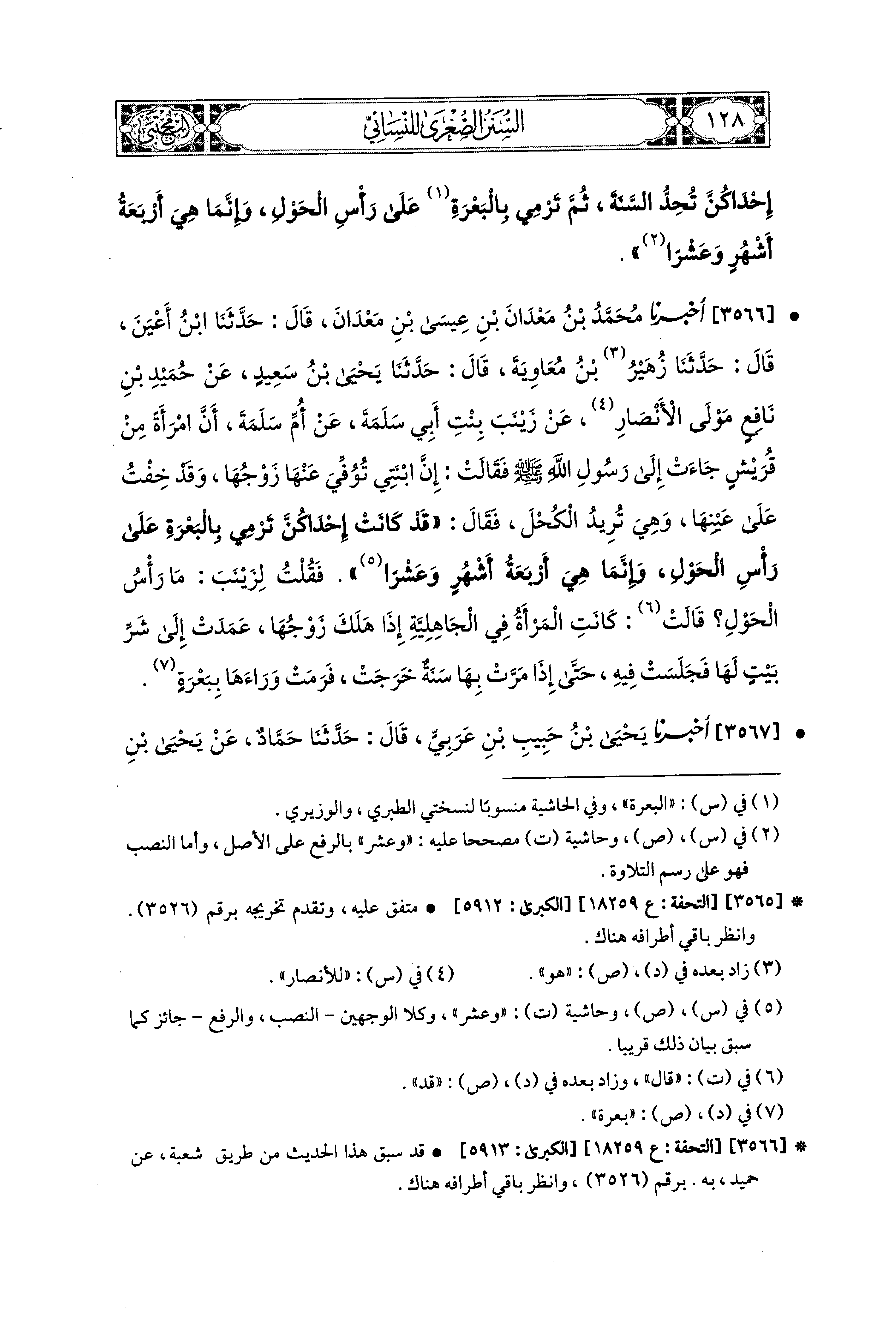 3567- أَخبَرَنا يَحيَى بْنُ حَبِيبِ بْنِ عَرَبِيٍّ، قال: حَدثنا حَمَّادٌ، عَن يَحيَى بْنِ سَعيدٍ، عَن حُمَيْدِ بْنِ نَافِعٍ، عَن زَيْنَبَ؛ أَنَّ امْرَأَةً سَأَلَتْ أُمَّ سَلَمَةَ، وَأُمَّ حَبِيبَةَ، أَتَكْتَحِلُ(1) فِي عِدَّتِهَا مِنْ وَفَاةِ زَوْجِهَا؟ فَقَالَتْ: أَتَتِ امْرَأَةٌ إِلَى النَّبيِّ(2) صَلى الله عَليه وسَلم فَسَأَلَتْهُ عَن ذَلِكَ؟ فَقَالَ: قَدْ كَانَتْ إِحْدَاكُنَّ فِي الجَاهِلِيَّةِ إِذَا تُوُفِّيَ عَنْهَا زَوْجُهَا أَقَامَتْ سَنَةً، ثُمَّ قَذَفَتْ خَلْفَهَا بِبَعْرَةٍ، ثُمَّ خَرَجَتْ، وَإِنَّمَا هِيَ أَرْبَعَةُ أَشْهُرٍ وَعَشْرًا حَتَّى يَنْقَضِيَ الأَجَلُ.