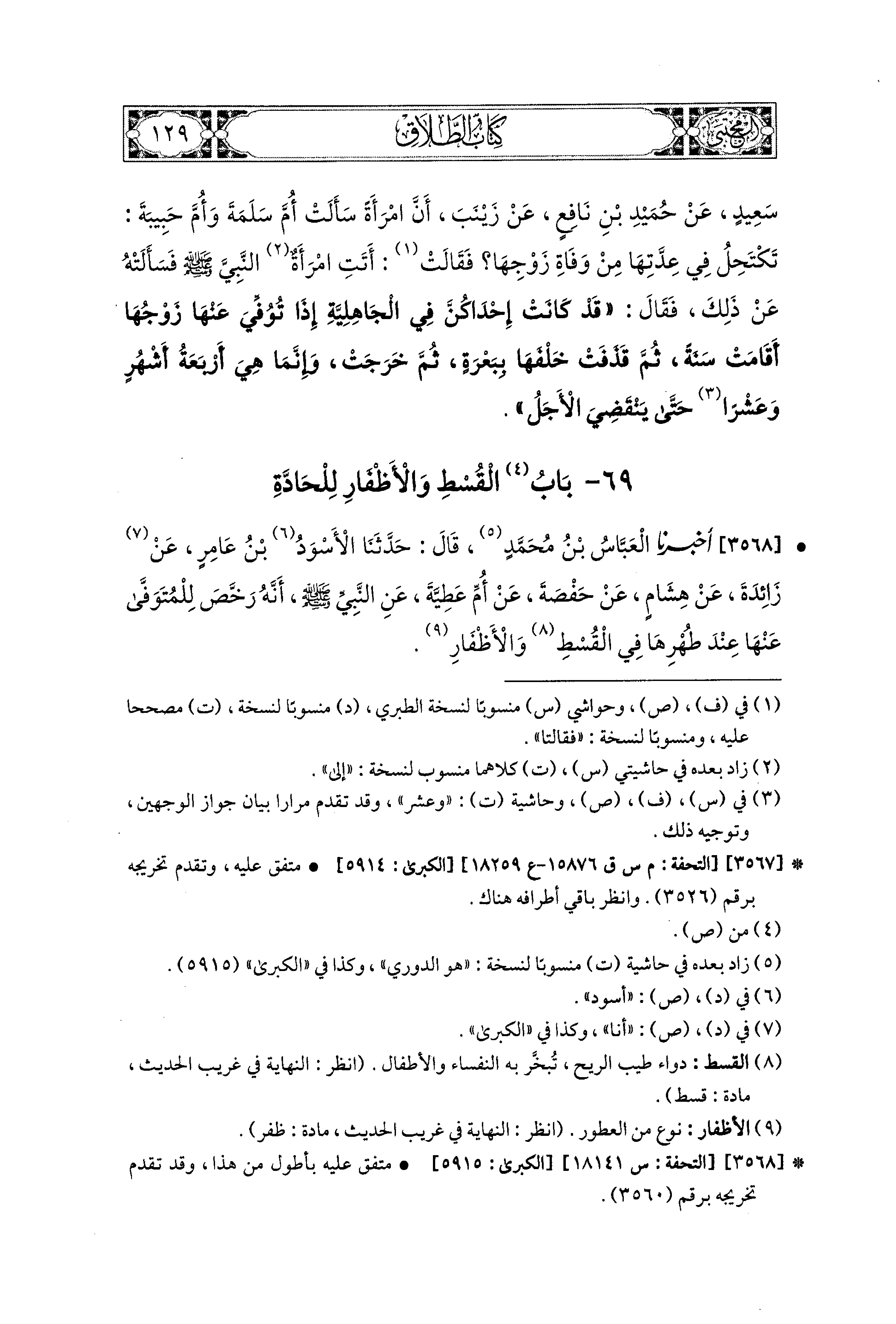 3568- أَخبَرَنا العَبَّاسُ بْنُ مُحَمدٍ، قال: حَدثنا الأَسْوَدُ بْنُ عَامِرٍ، عَن زَائِدَةَ، عَن هِشَامٍ، عَن حَفْصَةَ، عَن أُمِّ عَطِيَّةَ، عَنِ النَّبيِّ صَلى الله عَليه وسَلم أَنَّهُ رَخَّصَ لِلْمُتَوَفَّى عَنْهَا عِنْدَ طُهْرِهَا فِي القُسْطِ وَالأَظْفَارِ.