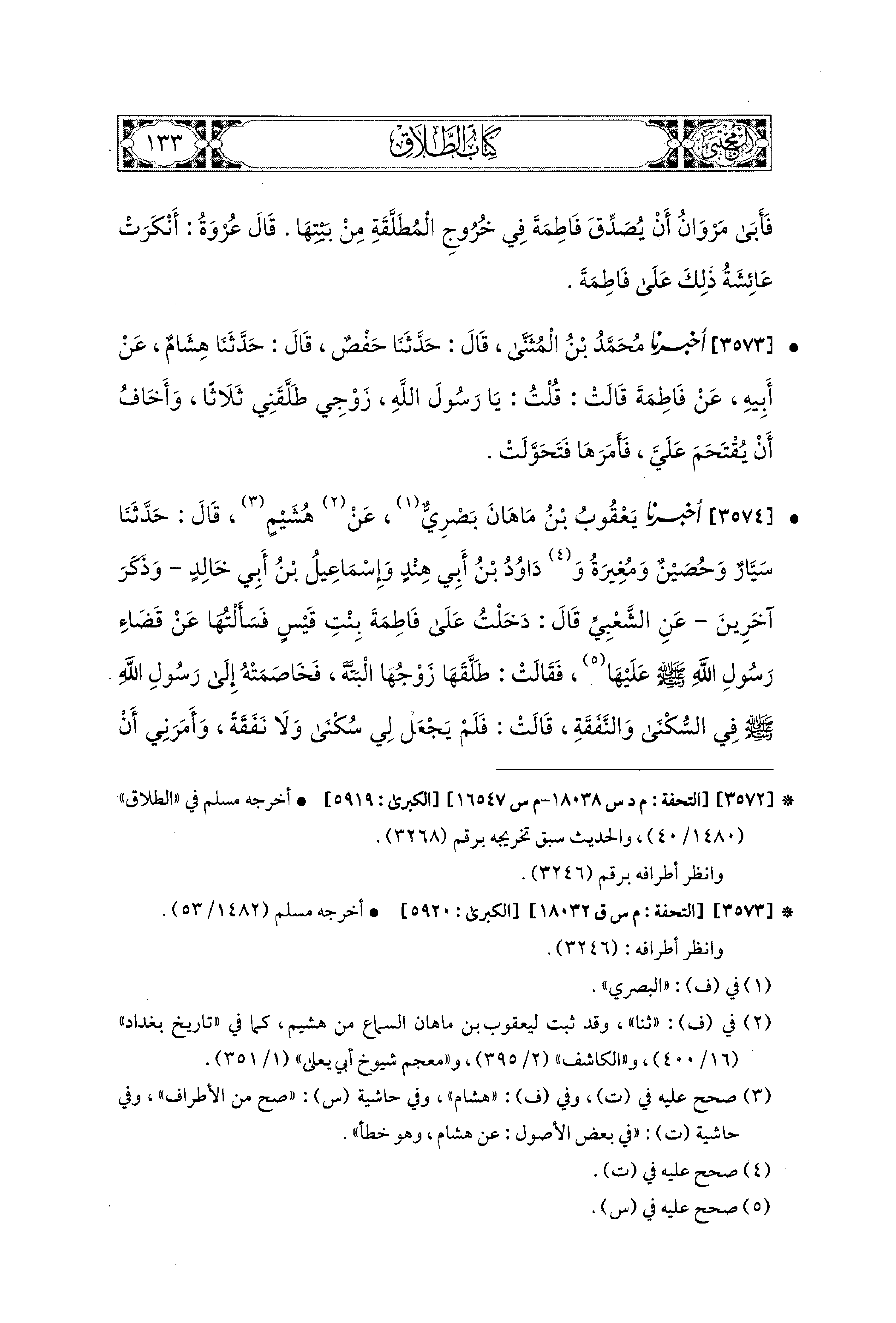 3573- أَخبَرَنا مُحَمد بْنُ المُثَنَّى، قال: حَدثنا حَفْصٌ، قال: حَدثنا هِشَامٌ، عَن أَبِيهِ، عَن فَاطِمَةَ، قَالَتْ: قُلْتُ: يَا رَسُولَ اللهِ، زَوْجِي طَلَّقَني ثَلاَثًا وَأَخَافُ أَنْ يُقْتَحَمَ عَلَيَّ، فَأَمَرَهَا فَتَحَوَّلَتْ.