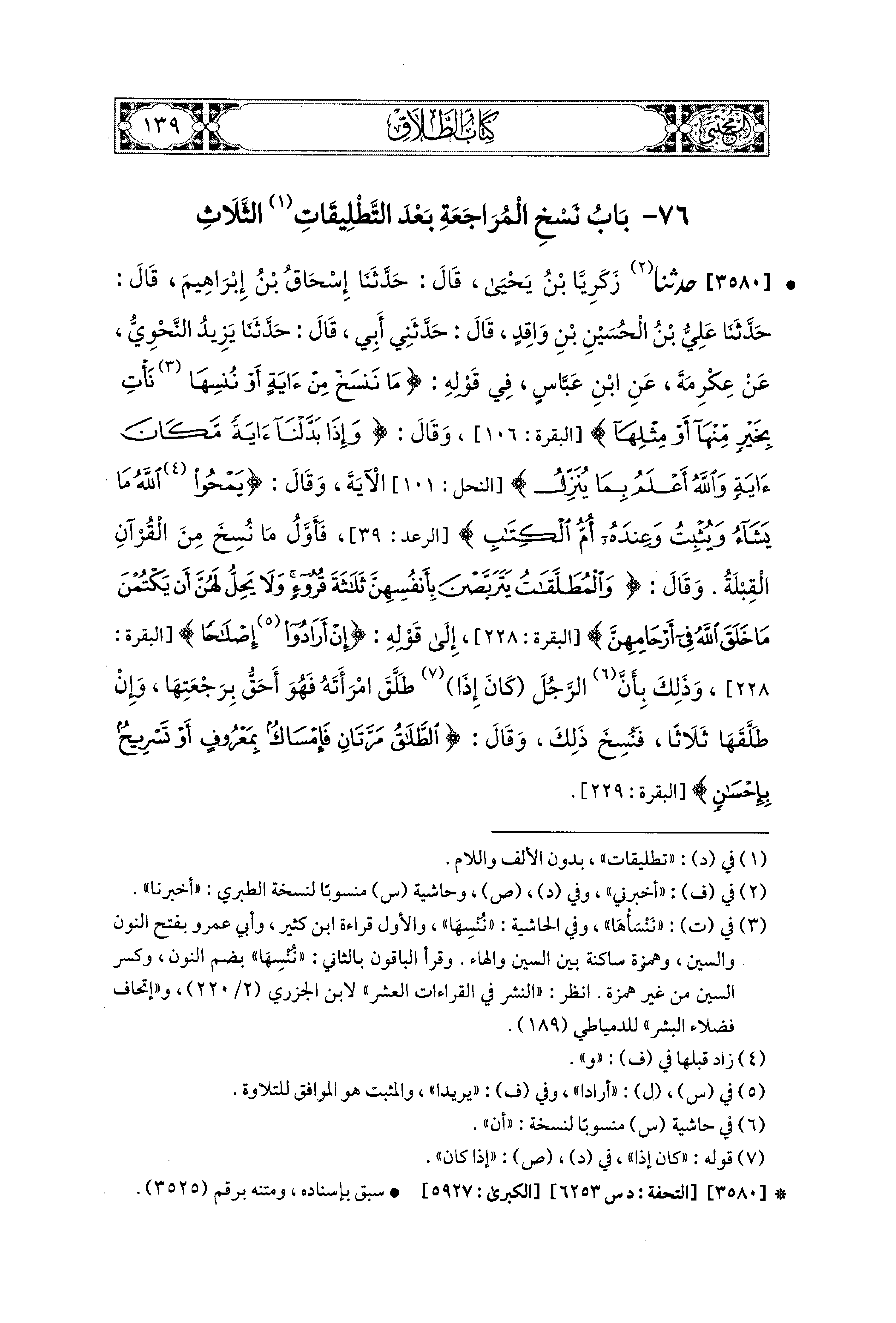 3580- حَدَّثَنَا زَكَرِيَّا بْنُ يَحيَى، قال: حَدثنا إِسحَاقُ بْنُ إِبراهِيمَ، قال: حَدثنا عَلِيُّ بْنُ الحُسَينِ بْنِ وَاقِدٍ، قَالَ: حَدَّثَني أَبِي، قال: حَدثنا يَزِيدُ النَّحْوِيُّ، عَن عِكْرِمَةَ، عَنِ ابنِ عَبَّاسٍ، فِي قَوْلِهِ: {مَا نَنْسَخْ مِنْ آيَةٍ، أَوْ نُنْسِهَا نَأْتِ بِخَيْرٍ مِنْهَا، أَوْ مِثْلِهَا} وَقَالَ: {وَإِذَا بَدَّلْنَا آيَةً مَكَانَ آيَةٍ وَاللهُ أَعْلَمُ بِمَا يُنَزِّلُ} الآيَةَ، وَقَالَ: {يَمْحُو اللهُ مَا يَشَاءُ وَيُثْبِتُ وَعِنْدَهُ أُمُّ الكِتَابِ} فَأَوَّلُ مَا نُسِخَ مِنَ القُرْآنِ القِبْلَةُ، وَقَالَ: {وَالمُطَلَّقَاتُ يَتَرَبَّصْنَ بِأَنْفُسِهِنَّ ثَلاَثَةَ قُرُوءٍ وَلاَ يَحِلُّ لَهُنَّ أَنْ يَكْتُمْنَ مَا خَلَقَ اللهُ فِي أَرْحَامِهِنَّ}، إِلَى قَوْلِهِ، {إِنْ أَرَادُوا إِصْلاَحًا} وَذَلِكَ بِأَنَّ الرَّجُلَ كَانَ إِذَا طَلَّقَ امْرَأَتَهُ فَهُوَ أَحَقُّ بِرَجْعَتِهَا وَإِنْ طَلَّقَهَا ثَلاَثًا، فَنَسَخَ ذَلِكَ، وَقَالَ: {الطَّلاَقُ مَرَّتَانِ فَإِمْسَاكٌ بِمَعْرُوفٍ، أَوْ تَسْرِيحٌ بِإِحْسَانٍ}.