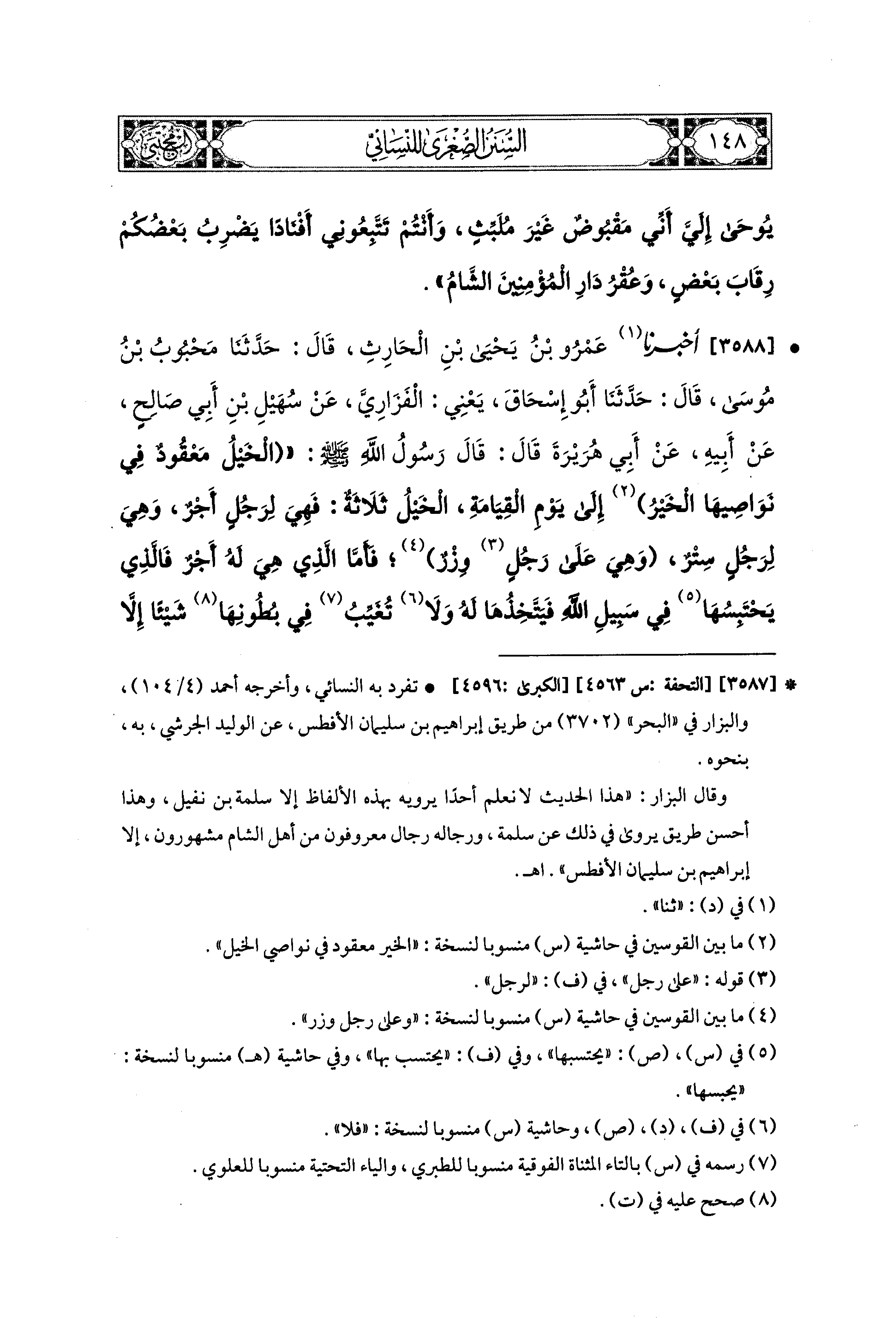 3588- أَخبَرَنا عَمْرُو بْنُ يَحيَى بْنِ الحَارِثِ، قال: حَدثنا مَحْبُوبُ بْنُ مُوسَى، قال: حَدثنا أَبو إِسحَاقَ، يَعْني الفَزَارِيَّ، عَن سُهَيْلِ بْنِ أَبِي صَالِحٍ، عَن أَبِيهِ، عَن أَبِي هُرَيرَةَ، قَالَ: قَالَ رَسُولُ اللهِ صَلى الله عَليه وسَلم: الخَيْلُ مَعْقُودٌ فِي نَوَاصِيهَا الخَيْرُ إِلَى يَوْمِ القِيَامَةِ، الخَيْلُ ثَلاَثَةٌ: فَهِيَ لِرَجُلٍ أَجْرٌ، وَهِيَ لِرَجُلٍ سَتْرٌ، وَهِيَ عَلَى رَجُلٍ وِزْرٌ، فَأَمَّا الَّذِي هِيَ لَهُ أَجْرٌ، فَالَّذِي يَحْتَبِسُهَا فِي سَبِيلِ اللهِ فَيَتَّخِذُهَا لَهُ، وَلاَ تُغَيِّبُ فِي بُطُونِهَا شَيْئًا، إِلاَّ كُتِبَ لَهُ بِكُلِّ شَيْءٍ غَيَّبَتْ فِي بُطُونِهَا أَجْرٌ، وَلَوْ عَرَضَتْ لَهُ مَرْجٌ ...، وَسَاقَ الحَدِيثَ.
