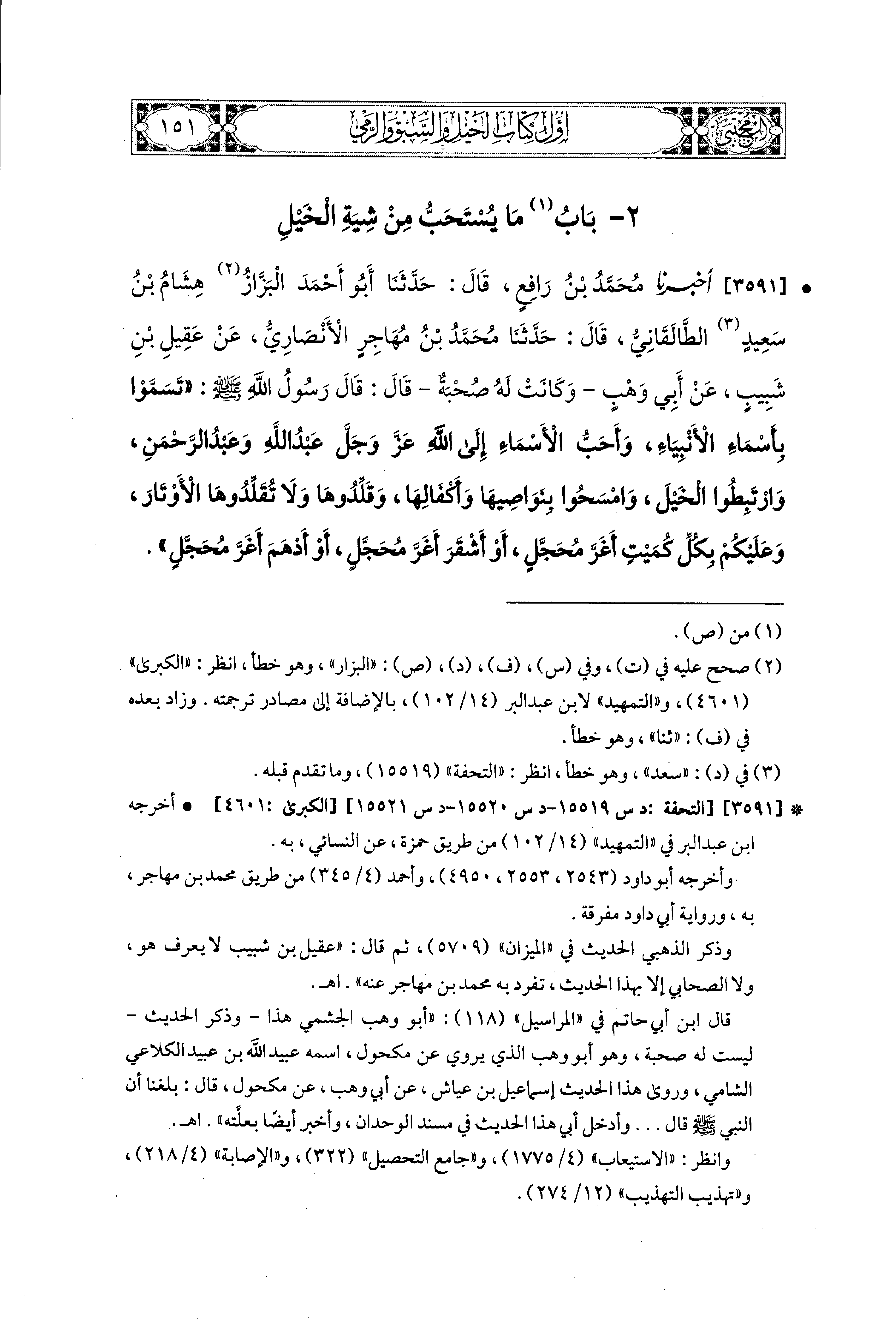 3591- أَخبَرَنا مُحَمد بْنُ رَافِعٍ، قال: حَدثنا أَبو أَحْمَدَ البَزَّازُ هِشَامُ بْنُ سَعيدٍ الطَّالقَانيُّ، قال: حَدثنا مُحَمدُ بْنُ مُهَاجِرٍ الأَنصَارِيُّ، عَن عَقِيلِ بْنِ شَبِيبٍ، عَن أَبِي وَهْبٍ، وَكَانَتْ لَهُ صُحْبَةٌ، قَالَ: قَالَ رَسُولُ اللهِ صَلى الله عَليه وسَلم: تَسَمَّوْا بِأَسْمَاءِ الأَنْبِيَاءِ، وَأَحَبُّ الأَسْمَاءِ إِلَى اللهِ عَزَّ وَجَلَّ، عَبدُ اللهِ، وَعَبدُ الرَّحمَنِ، وَارْتَبِطُوا الخَيْلَ، وَامْسَحُوا بِنَوَاصِيهَا وَأَكْفَالِهَا وَقَلِّدُوهَا، وَلاَ تُقَلِّدُوهَا الأَوْتَارَ، وَعَلَيْكُمْ بِكُلِّ كُمَيْتٍ أَغَرٍّ مُحَجَّلٍ، أَوْ أَشْقَرٍ أَغَرٍّ مُحَجَّلٍ، أَوْ أَدْهَمٍ أَغَرٍّ مُحَجَّلٍ.