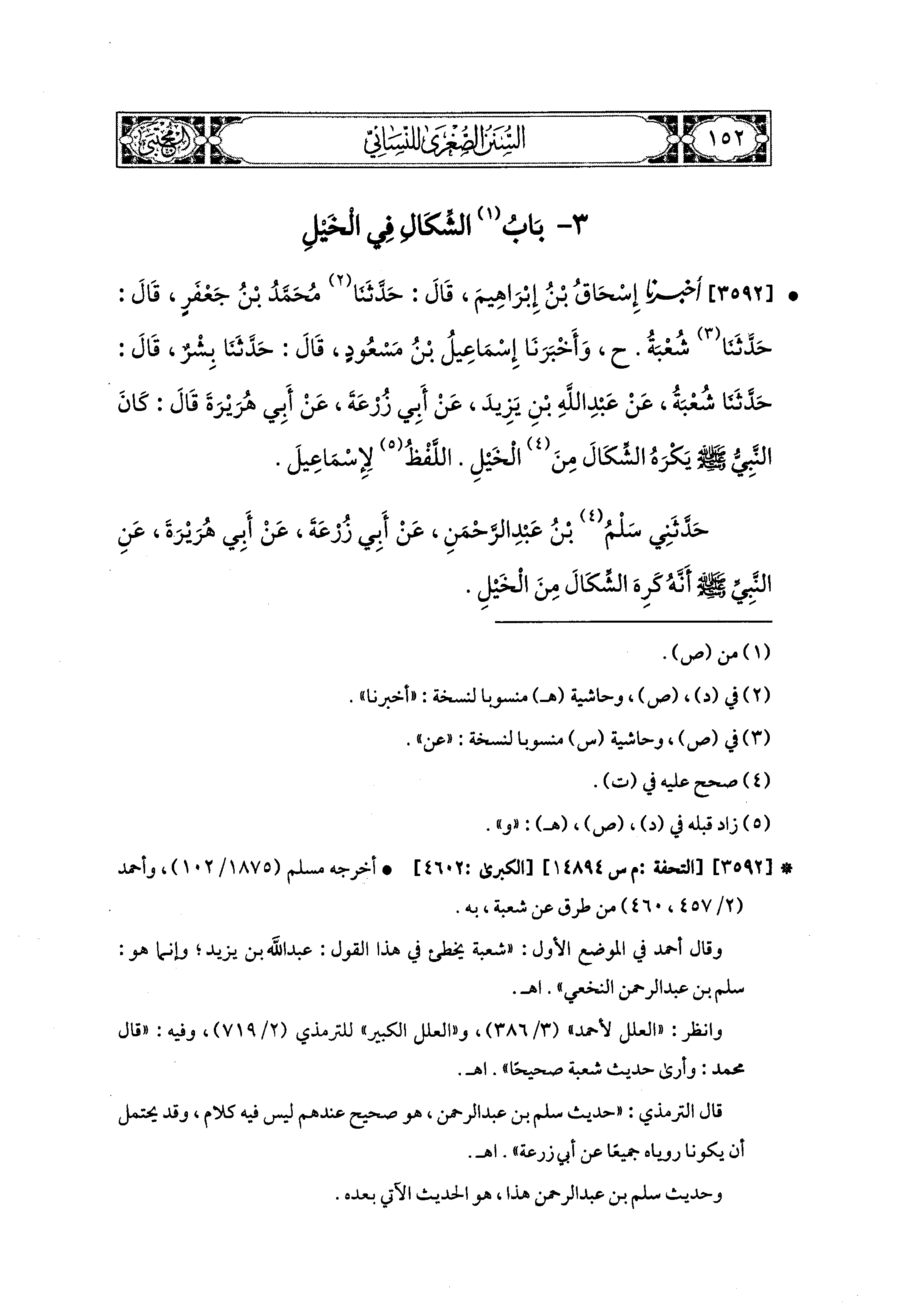3592- أَخبَرَنا إِسحَاقُ بْنُ إِبراهِيمَ، قال: حَدثنا مُحَمدُ بْنُ جَعْفَرٍ، قال: حَدثنا شُعْبَةُ (ح) وَأَخبَرنا إِسماعِيلُ بْنُ مَسْعُودٍ، قال: حَدثنا بِشْرٌ، قال: حَدثنا شُعْبَةُ، عَن عَبد اللهِ بن يَزِيدَ، عَن أَبِي زُرْعَةَ، عَن أَبِي هُرَيرَةَ، قَالَ: كَانَ النَّبيُّ صَلى الله عَليه وسَلم، يَكْرَهُ الشِّكَالَ مِنَ الخَيْلِ.