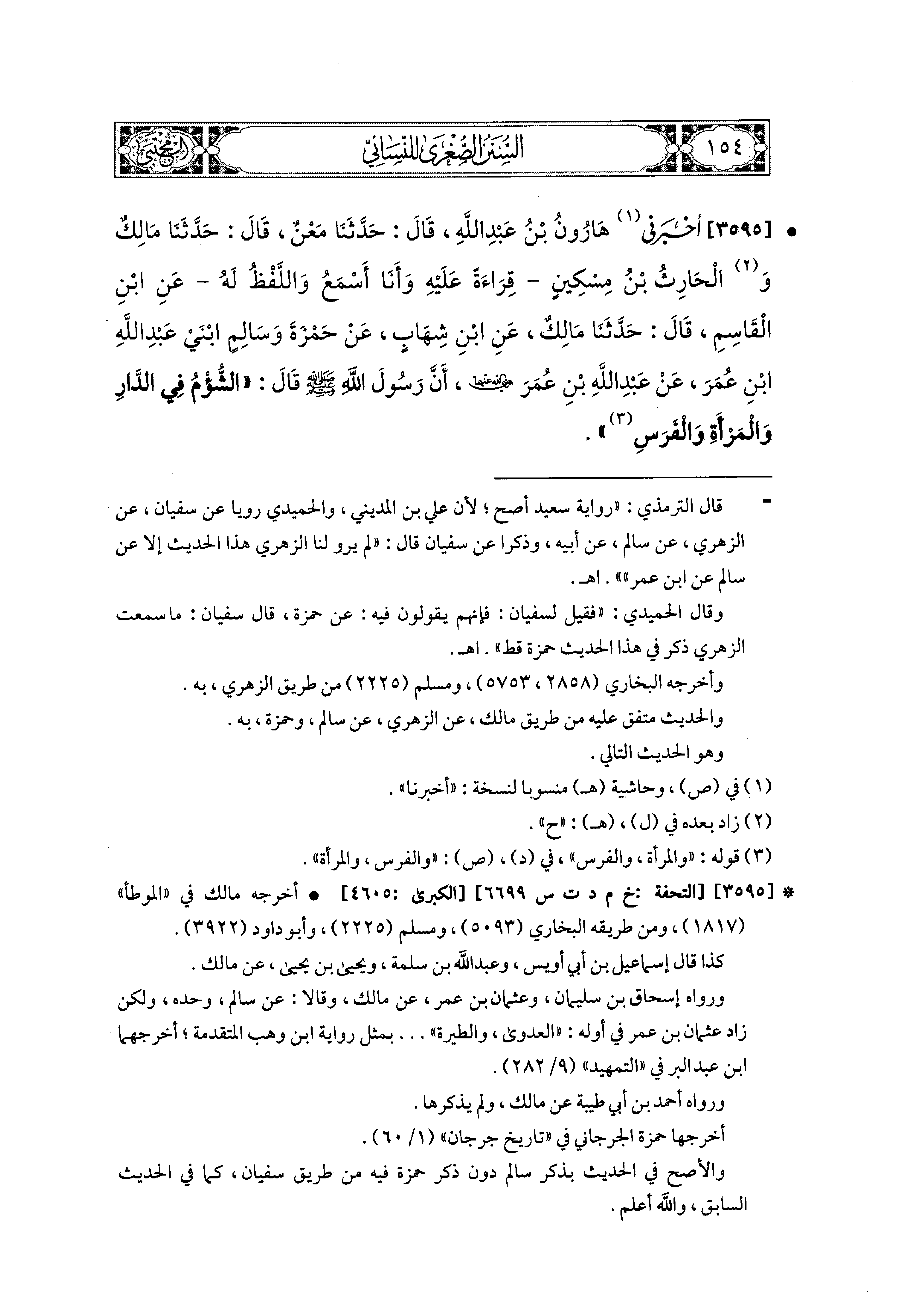3595- أَخْبَرَني هَارُونُ بْنُ عَبدِ اللهِ، قال: حَدثنا مَعْنٌ، قال: حَدثنا مَالِكٌ، وَالحَارِثُ بْنُ مِسْكِينٍ، قِرَاءَةً عَلَيْهِ وَأَنَا أَسْمَعُ، وَاللَّفْظُ لَهُ، عَنِ ابنِ القَاسِمِ، قال: حَدثنا مَالِكٌ، عَنِ ابنِ شِهَابٍ، عَن حَمْزَةَ، وَسَالِمٍ، ابْنَيْ عَبدِ اللهِ بْنِ عُمَرَ، عَن عَبد اللهِ بن عُمَرَ، رَضِيَ اللهُ عَنْهُمَا؛ أَنَّ رَسُولَ اللهِ صَلى الله عَليه وسَلم قَالَ: الشُّؤْمُ فِي الدَّارِ وَالمَرْأَةِ وَالفَرَسِ.