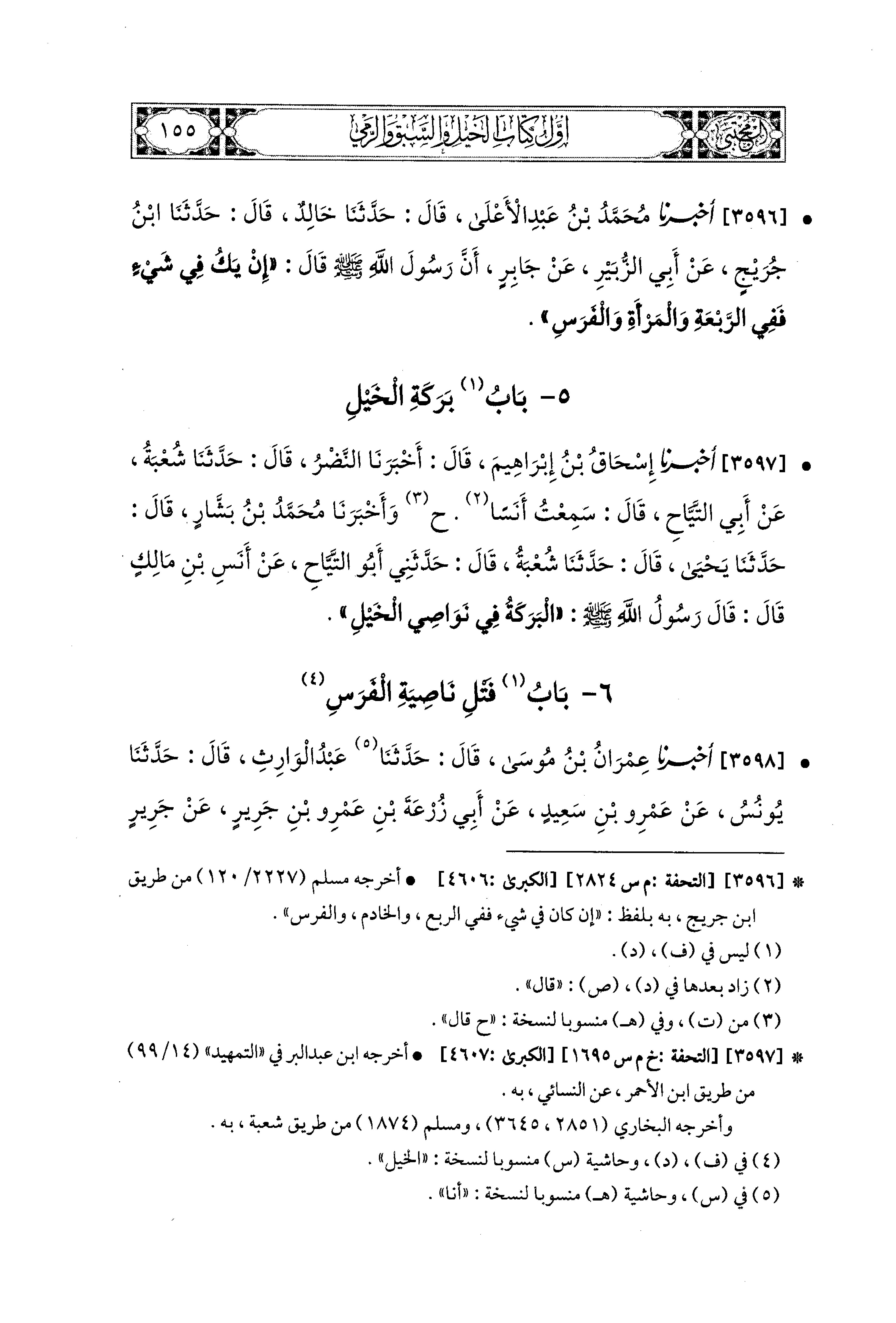 3598- أَخبَرَنا عِمْرَانُ بْنُ مُوسَى، قال: حَدثنا عَبدُ الوَارِثِ، قال: حَدثنا يُونُسُ، عَن عَمْرِو بْنِ سَعيدٍ، عَن أَبِي زُرْعَةَ بْنِ عَمْرِو بْنِ جَرِيرٍ، عَن جَرِيرٍ، قَالَ: رَأَيْتُ رَسُولَ اللهِ صَلى الله عَليه وسَلم يَفْتِلُ نَاصِيَةَ فَرَسٍ بَيْنَ إِصْبَعَيْهِ، وَيَقُولُ: الخَيْلُ مَعْقُودٌ فِي نَوَاصِيهَا الخَيْرُ إِلَى يَوْمِ القِيَامَةِ: الأَجْرُ وَالغَنيمَةُ.