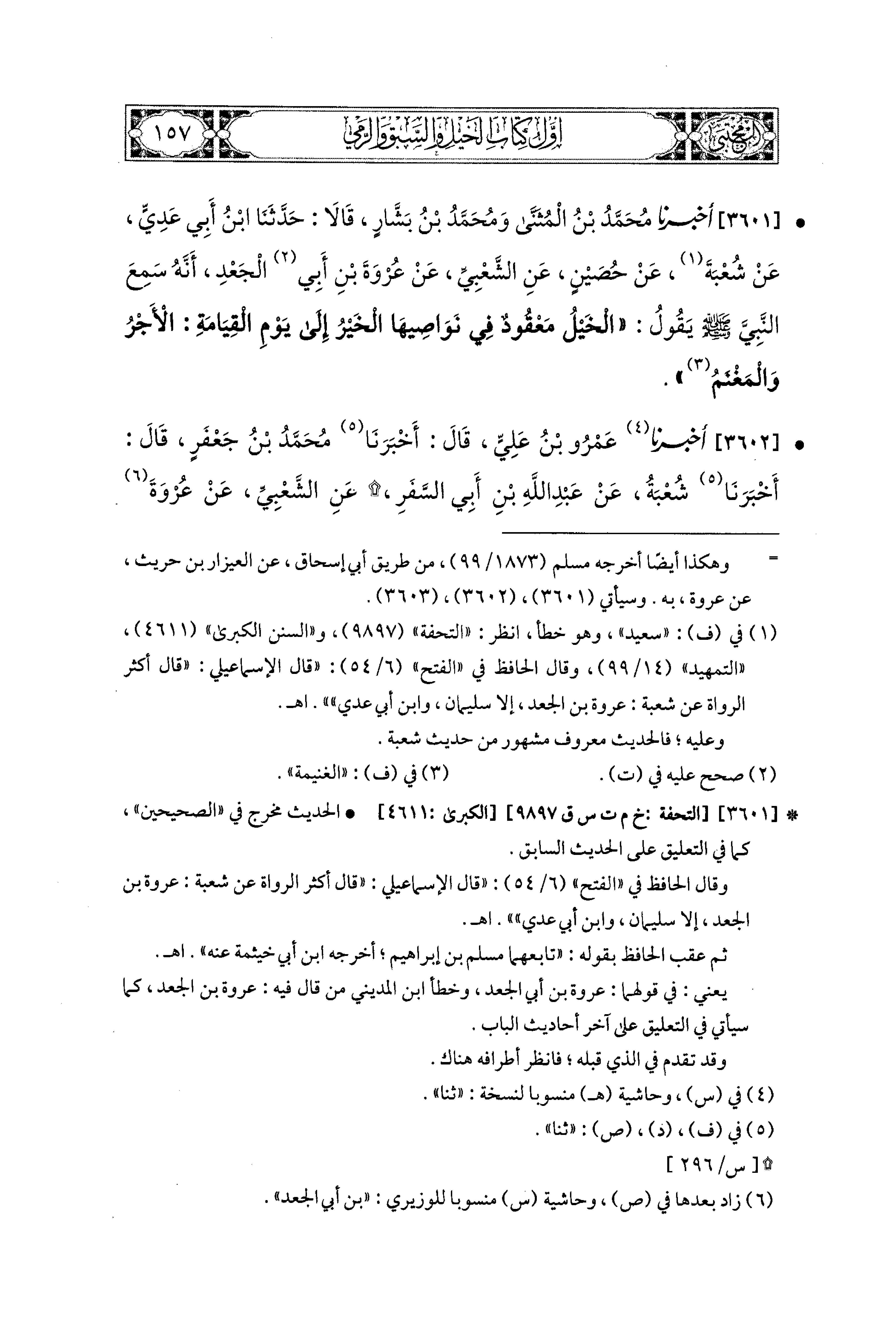 3602- أَخبَرَنا عَمْرُو بْنُ عَلِيٍّ، قَالَ: أَخبَرنا مُحَمدُ بْنُ جَعْفَرٍ، قَالَ: أَخبَرنا شُعْبَةُ، عَن عَبد اللهِ بن أَبِي السَّفَرِ، عَنِ الشَّعْبِيِّ، عَن عُرْوَةَ، قَالَ: سَمِعْتُ رَسُولَ اللهِ صَلى الله عَليه وسَلم يَقُولُ: الخَيْلُ مَعْقُودٌ فِي نَوَاصِيهَا الخَيْرُ إِلَى يَوْمِ القِيَامَةِ: الأَجْرُ وَالمَغْنَمُ.