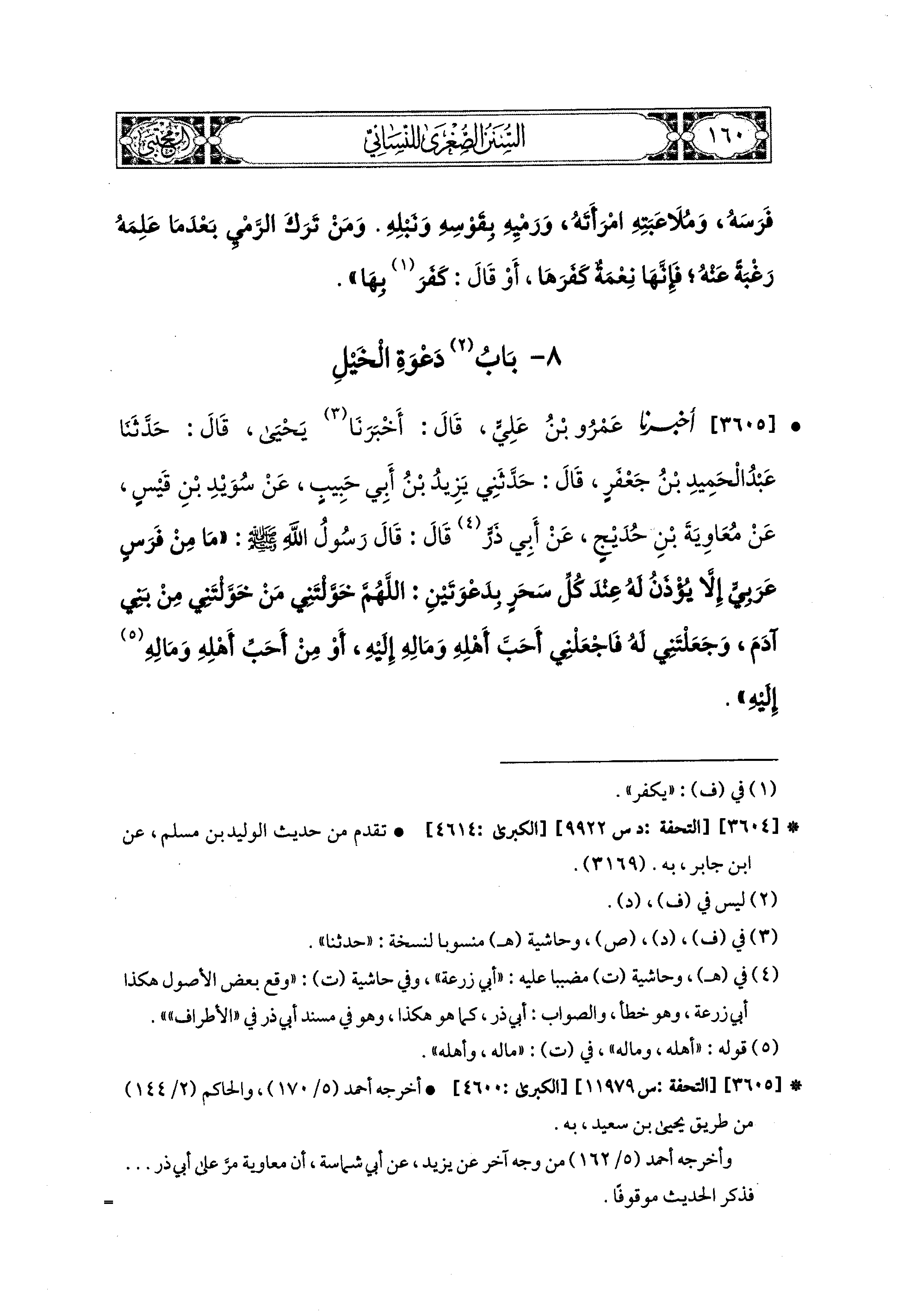 3605- أَخبَرَنا عَمْرُو بْنُ عَلِيٍّ، قَالَ: أَخبَرنا يَحيَى، قال: حَدثنا عَبدُ الحَميدِ بْنُ جَعْفَرٍ، قَالَ: حَدَّثَني يَزِيدُ بْنُ أَبِي حَبِيبٍ، عَن سُوَيْدِ بْنِ قَيْسٍ، عَن مُعَاوِيَةَ بْنِ حُدَيْجٍ، عَن أَبِي ذَرٍّ، قَالَ: قَالَ رَسُولُ اللهِ صَلى الله عَليه وسَلم: مَا مِنْ فَرَسٍ عَرَبِيٍّ إِلاَّ يُؤْذَنُ لَهُ عِنْدَ كُلِّ سَحَرٍ بِدَعْوَتَيْنِ: اللهُمَّ خَوَّلْتَني مَنْ خَوَّلْتَني مِنْ بَني آدَمَ وَجَعَلْتَني لَهُ، فَاجْعَلْني أَحَبَّ أَهْلِهِ وَمَالِهِ إِلَيْهِ، أَوْ مِنْ أَحَبِّ أَهْلِهِ وَمَالِهِ إِلَيْهِ.
