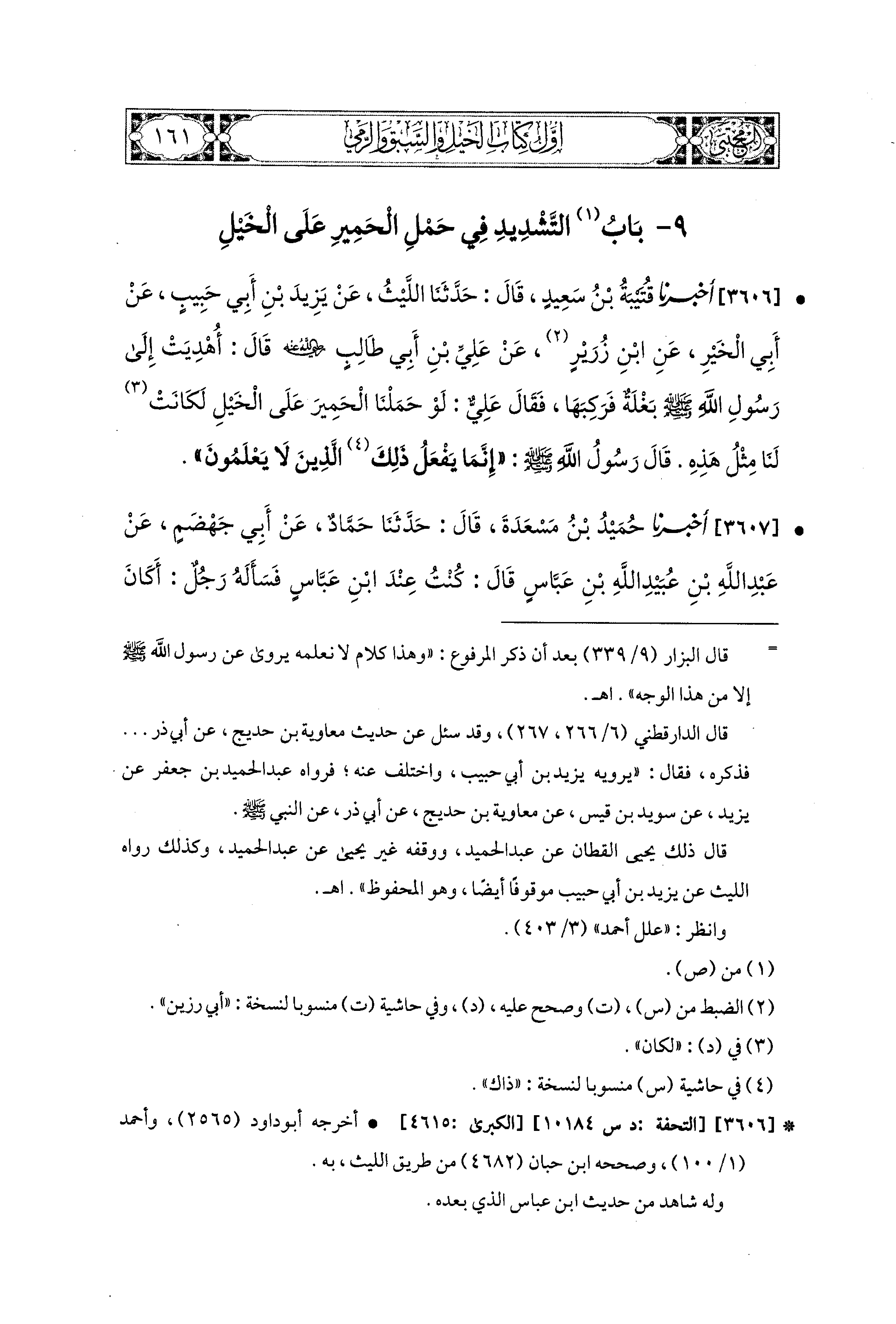 3606- أَخبَرَنا قُتَيبَةُ بْنُ سَعيدٍ، قال: حَدثنا اللَّيْثُ، عَن يَزِيدَ بْنِ أَبِي حَبِيبٍ، عَن أَبِي الخَيْرِ، عَنِ ابنِ زُرَيْرٍ، عَن عَلِيِّ بْنِ أَبِي طَالِبٍ، رَضِيَ اللهُ عَنْهُ، قَالَ: أُهْدِيَتْ إِلَى رَسُولِ اللهِ صَلى الله عَليه وسَلم بَغْلَةٌ، فَرَكِبَهَا، فَقَالَ عَلِيٌّ: لَوْ حَمَلْنَا الحَميرَ عَلَى الخَيْلِ لَكَانَتْ لَنَا مِثْلَ هَذِهِ، قَالَ رَسُولُ اللهِ صَلى الله عَليه وسَلم: إِنَّمَا يَفْعَلُ ذَلِكَ الَّذِينَ لاَ يَعْلَمُونَ.