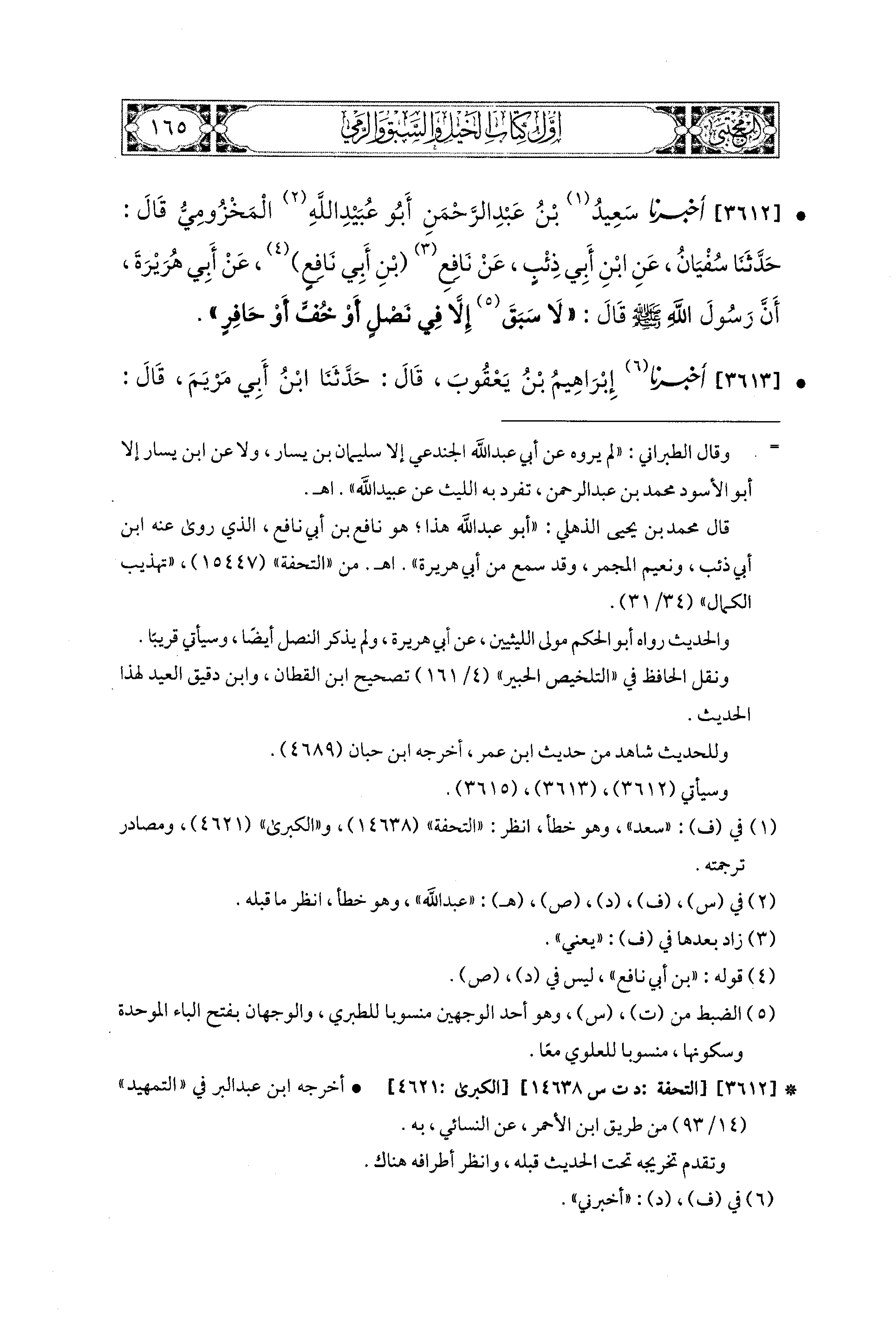 3612- أَخبَرَنا سَعيدُ بْنُ عَبدِ الرَّحمَنِ أَبو عُبَيدِ اللهِ المَخْزُوميُّ، قال: حَدثنا سُفْيَانُ، عَنِ ابنِ أَبِي ذِئْبٍ، عَن نَافِعِ بْنِ أَبِي نَافِعٍ، عَن أَبِي هُرَيرَةَ، أَنَّ رَسُولَ اللهِ صَلى الله عَليه وسَلم قَالَ: لاَ سَبَقَ إِلاَّ فِي نَصْلٍ، أَوْ خُفٍّ، أَوْ حَافِرٍ.