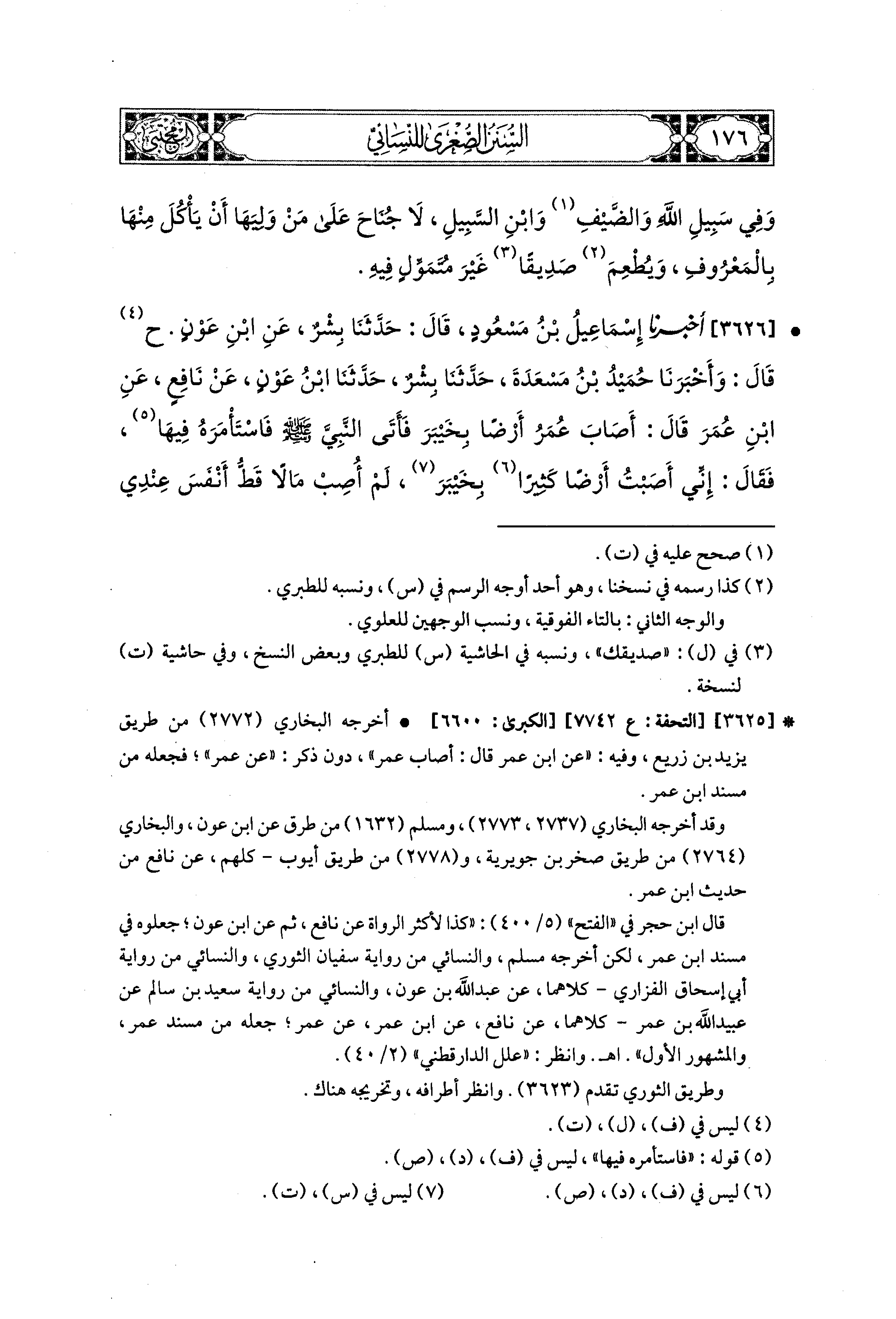 3626- أَخبَرَنا إِسماعِيلُ بْنُ مَسْعُودٍ، قال: حَدثنا بِشْرٌ، عَنِ ابنِ عَوْنٍ، (ح) قَالَ: وَأَخبَرنا حُمَيْدُ بْنُ مَسْعَدَةَ، قال: حَدثنا بِشْرٌ، حَدثنا ابْنُ عَوْنٍ، عَن نَافِعٍ، عَنِ ابنِ عُمَرَ، قَالَ: أَصَابَ عُمَرُ أَرْضًا بِخَيْبَرَ، فَأَتَى النَّبيَّ صَلى الله عَليه وسَلم فَاسْتَأْمَرَهُ فِيهَا، فَقَالَ: إِنِّي أَصَبْتُ أَرْضًا بخيبر لَمْ أُصِبْ (1) مَالاً قَطُّ أَنْفَسَ عِنْدِي مِنْهُ، فَمَا تَأْمُرُ فِيهَا؟ (2) قَالَ: إِنْ شِئْتَ حَبَّسْتَ أَصْلَهَا وَتَصَدَّقْتَ بِهَا، فَتَصَدَّقَ بِهَا عَلَى أَنَّهُ لاَ تُبَاعُ، وَلاَ تُوهَبُ، فَتَصَدَّقَ بِهَا فِي الفُقَرَاءِ وَالقُرْبَى، وَفِي الرِّقَابِ، وَفِي سَبِيلِ اللهِ، وَابْنِ السَّبِيلِ، وَالضَّيْفِ، لاَ جُنَاحَ، يَعْني، عَلَى مَنْ وَلِيَهَا أَنْ يَأْكُلَ، أَوْ يُطْعِمَ صَدِيقًا، غَيْرَ مُتَمَوِّلٍ.