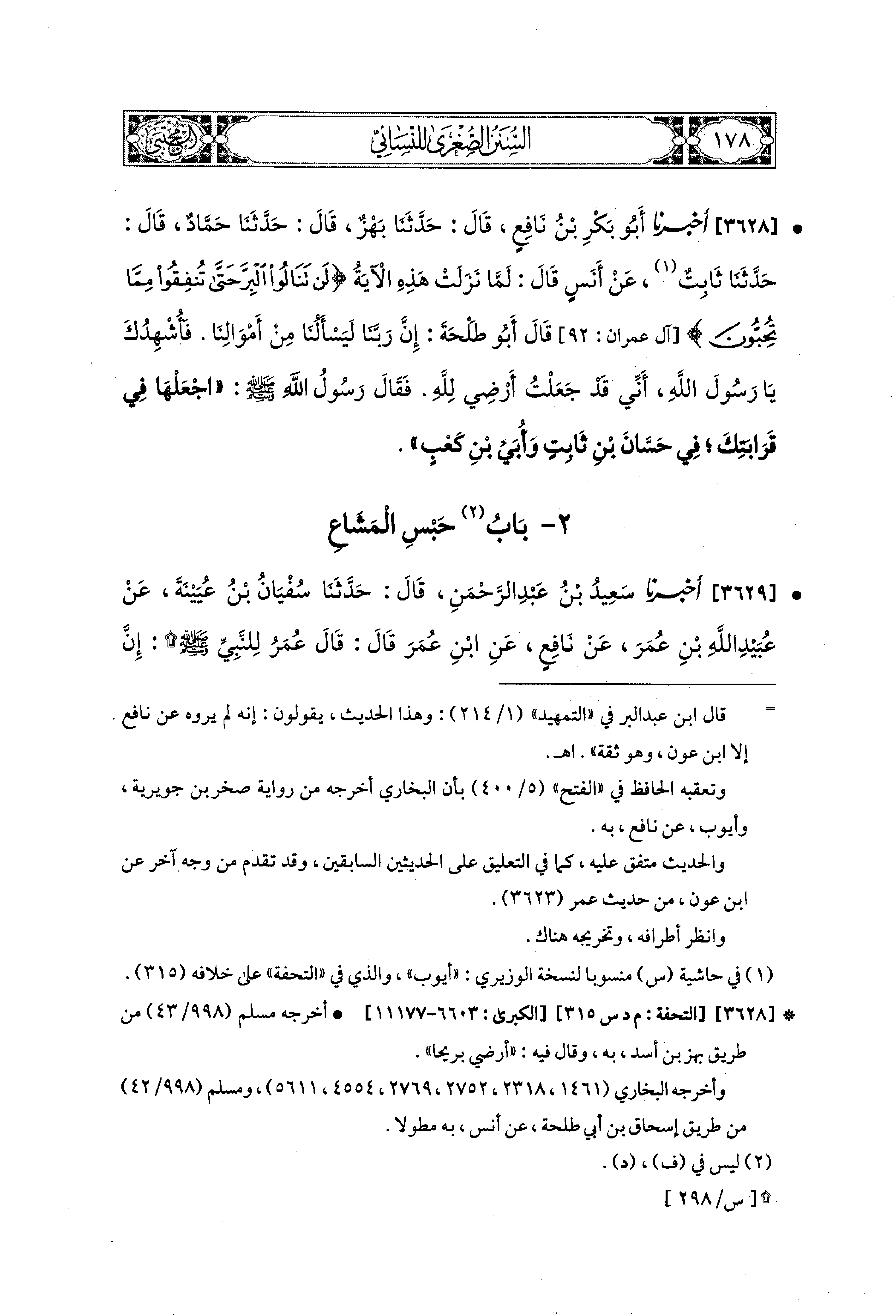3628- أَخبَرَنا أَبو بَكْرِ بْنُ نَافِعٍ، قال: حَدثنا بَهْزٌ، قال: حَدثنا حَمَّادٌ، قال: حَدثنا ثَابِتٌ، عَن أَنَسٍ، قَالَ: لَمَّا نَزَلَتْ هَذِهِ الآيَةُ {لَنْ تَنَالُوا البِرَّ حَتَّى تُنْفِقُوا مِمَّا تُحِبُّونَ}، قَالَ أَبو طَلْحَةَ: إِنَّ رَبَّنَا لَيَسْأَلُنَا عَن أَمْوَالِنَا، فَأُشْهِدُكَ يَا رَسُولَ اللهِ، أَنِّي قَدْ جَعَلْتُ أَرْضِي لِلَّهِ، فَقَالَ رَسُولُ اللهِ صَلى الله عَليه وسَلم: اجْعَلْهَا فِي قَرَابَتِكَ فِي حَسَّانَ بْنِ ثَابِتٍ وَأُبَيِّ بْنِ كَعْبٍ.