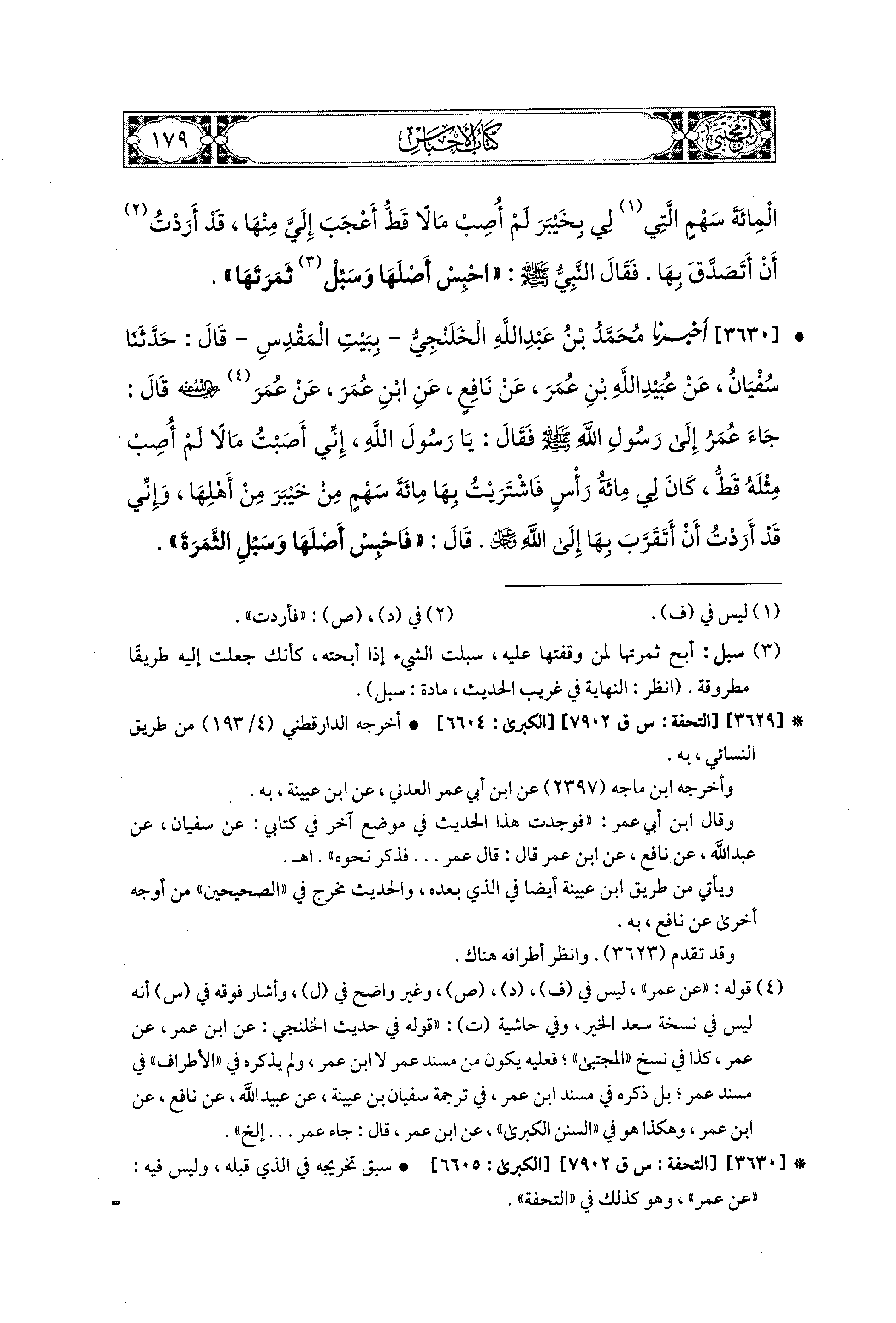 3630- أَخبَرَنا مُحَمد بْنُ عَبدِ اللهِ الخَلَنْجِيُّ، بِبَيْتِ المَقْدِسِ، قال: حَدثنا سُفْيَانُ، عَن عُبَيدِ اللهِ بْنِ عُمَرَ، عَن نَافِعٍ، عَنِ ابنِ عُمَرَ، رَضِيَ اللهُ عَنْهُ، قَالَ: جَاءَ عُمَرُ (1) إِلَى رَسُولِ اللهِ صَلى الله عَليه وسَلم فَقَالَ: يَا رَسُولَ اللهِ، إِنِّي أَصَبْتُ مَالاً لَمْ أُصِبْ مِثْلَهُ قَطُّ، كَانَ لِي مِئَةُ رَأْسٍ فَاشْتَرَيْتُ بِهَا مِئَةَ سَهْمٍ مِنْ خَيْبَرَ مِنْ أَهْلِهَا، وَإِنِّي قَدْ أَرَدْتُ أَنْ أَتَقَرَّبَ بِهَا إِلَى اللهِ عَزَّ وَجَلَّ، قَالَ: فَاحْبِسْ أَصْلَهَا، وَسَبِّلِ الثَّمَرَةَ.
