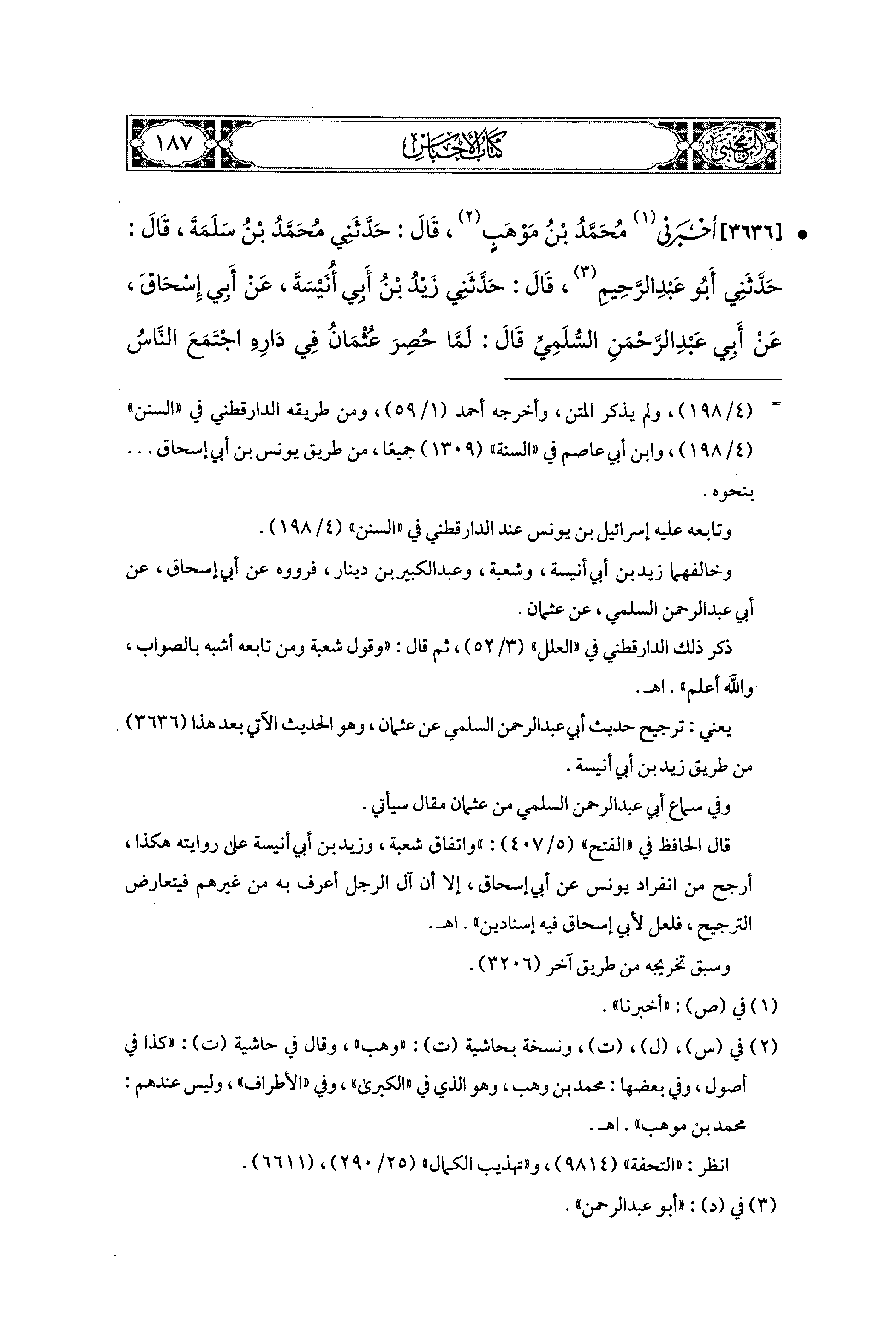 3636- أَخْبَرَني مُحَمدُ بْنُ وَهْبٍ (1), قَالَ: حَدَّثَني مُحَمدُ بْنُ سَلَمَةَ، قَالَ: حَدَّثَني أَبو عَبدِ الرَّحِيمِ، قَالَ: حَدَّثَني زَيْدُ بْنُ أَبِي أُنَيْسَةَ، عَن أَبِي إِسحَاقَ، عَن أَبِي عَبدِ الرَّحمَنِ السَّلَميِّ، قَالَ: لَمَّا حُصِرَ عُثمَانُ فِي دَارِهِ، اجْتَمَعَ النَّاسُ حَوْلَ دَارِهِ، قَالَ: فَأَشْرَفَ عَلَيْهِمْ، وَسَاقَ الحَدِيثَ.