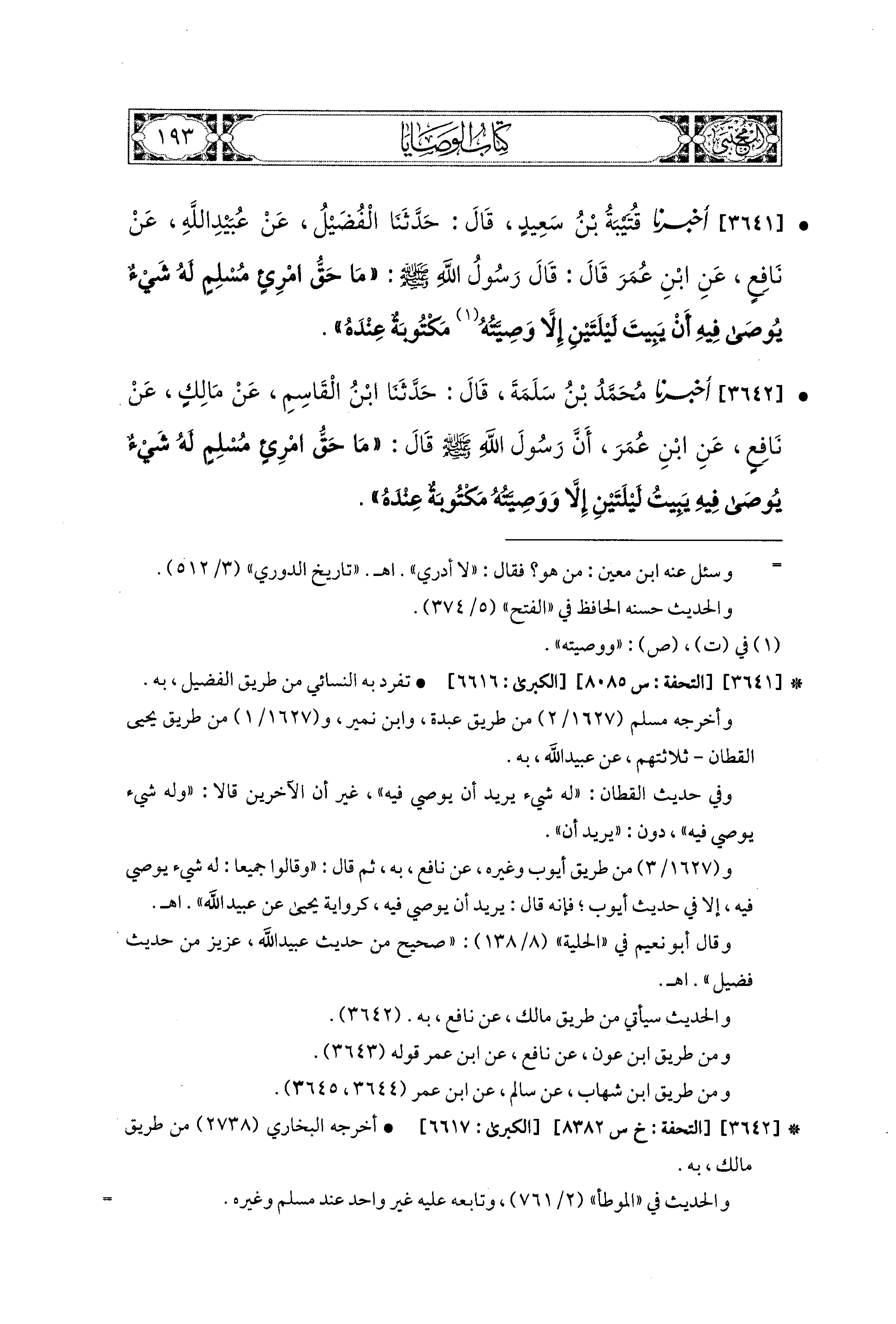 3641- أَخبَرَنا قُتَيبَةُ بْنُ سَعيدٍ، قال: حَدثنا الفُضَيْلُ، عَن عُبَيدِ اللهِ، عَن نَافِعٍ، عَنِ ابنِ عُمَرَ، قَالَ: قَالَ رَسُولُ اللهِ صَلى الله عَليه وسَلم: مَا حَقُّ امْرِئٍ مُسْلِمٍ لَهُ شَيْءٌ يُوصَى فِيهِ أَنْ يَبِيتَ لَيْلَتَيْنِ، إِلاَّ وَوَصِيَّتُهُ مَكْتُوبَةٌ عِنْدَهُ.