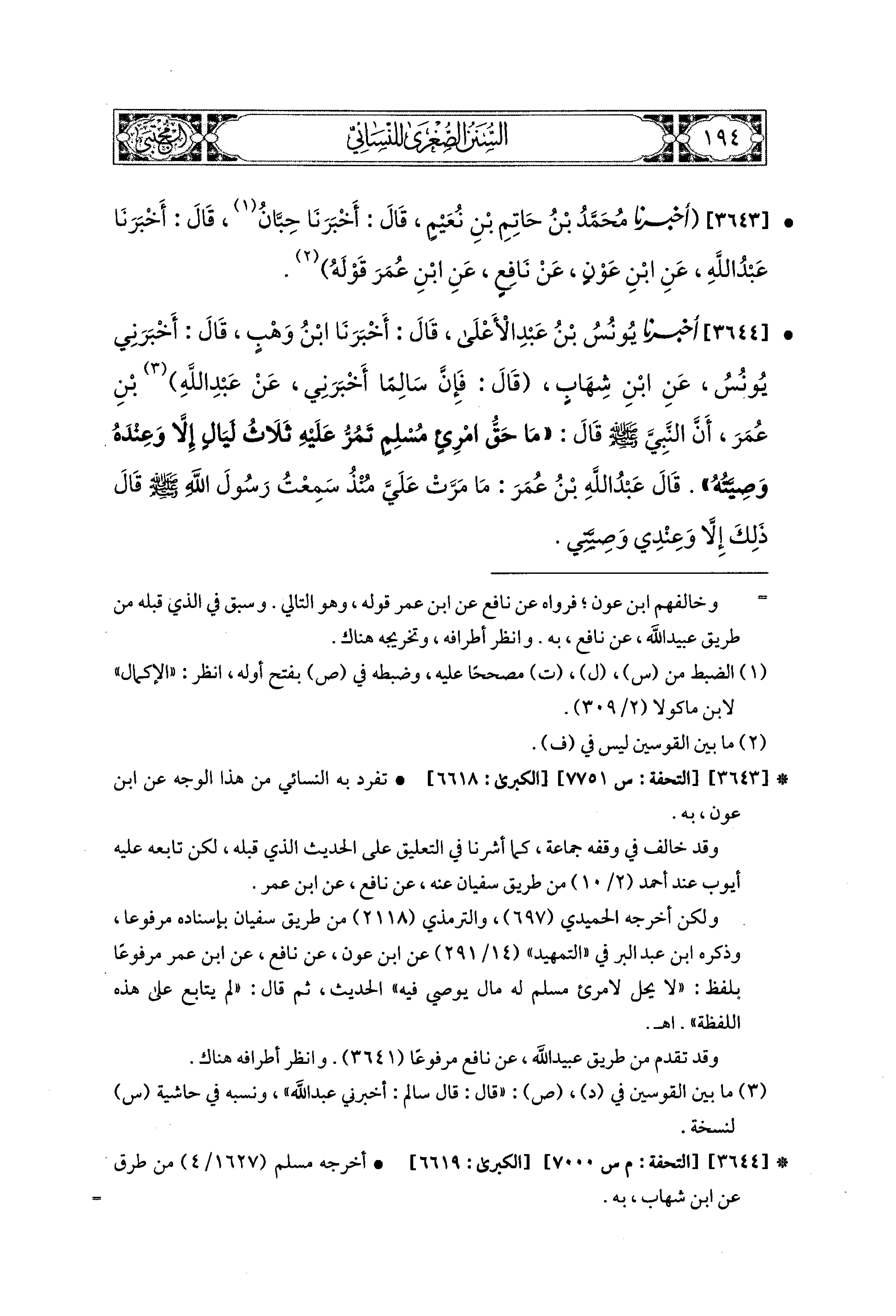 3644- أَخبَرَنا يُونُسُ بن عَبدِ الأَعلَى، قَالَ: أَخبَرنا ابْنُ وَهْبٍ، قَالَ: أَخْبَرَني يُونُسُ، عَنِ ابنِ شِهَابٍ، قَالَ: فَإِنَّ سَالِمًا أَخْبَرَني، عَن عَبد اللهِ بن عُمَرَ، أَنَّ النَّبيَّ صَلى الله عَليه وسَلم قَالَ: مَا حَقُّ امْرِئٍ مُسْلِمٍ، تَمُرُّ عَلَيْهِ ثَلاَثُ لَيَالٍ، إِلاَّ وَعِنْدَهُ وَصِيَّتُهُ.