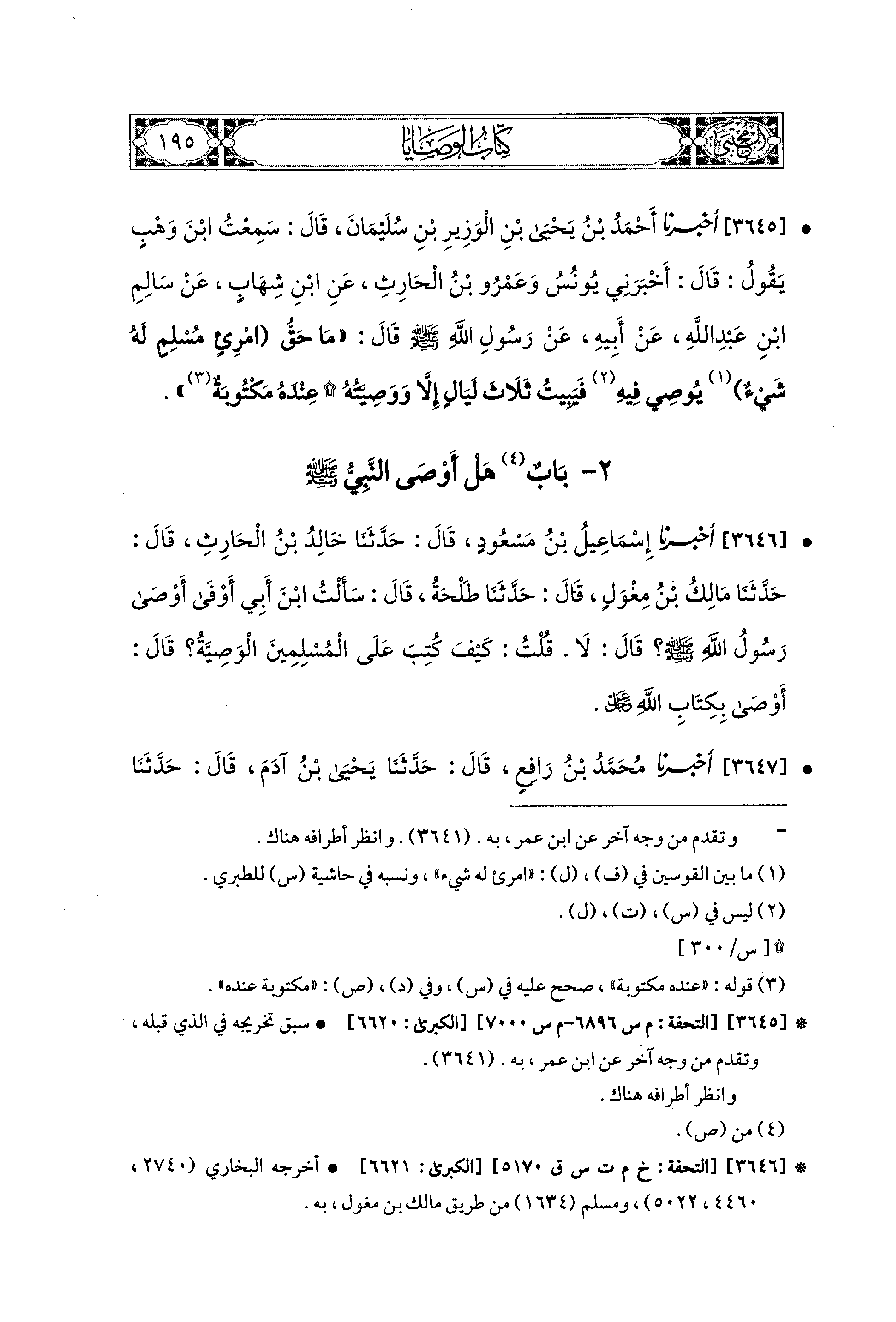 3645- أَخبَرَنا أَحْمَدُ بْنُ يَحيَى بْنِ الوَزِيرِ بْنِ سُلَيمَانَ، قَالَ: سَمِعْتُ ابْنَ وَهْبٍ، قَالَ:(1) أَخْبَرَني يُونُسُ، وَعَمْرُو بْنُ الحَارِثِ، عَنِ ابنِ شِهَابٍ، عَن سَالِمِ بْنِ عَبدِ اللهِ، عَن أَبِيهِ، عَن رَسُولِ اللهِ صَلى الله عَليه وسَلم قَالَ: مَا حَقُّ امْرِئٍ مُسْلِمٍ لَهُ شَيْءٌ يُوصَى فِيهِ فَيَبِيتُ ثَلاَثَ لَيَالٍ، إِلاَّ وَوَصِيَّتُهُ عِنْدَهُ مَكْتُوبَةٌ.