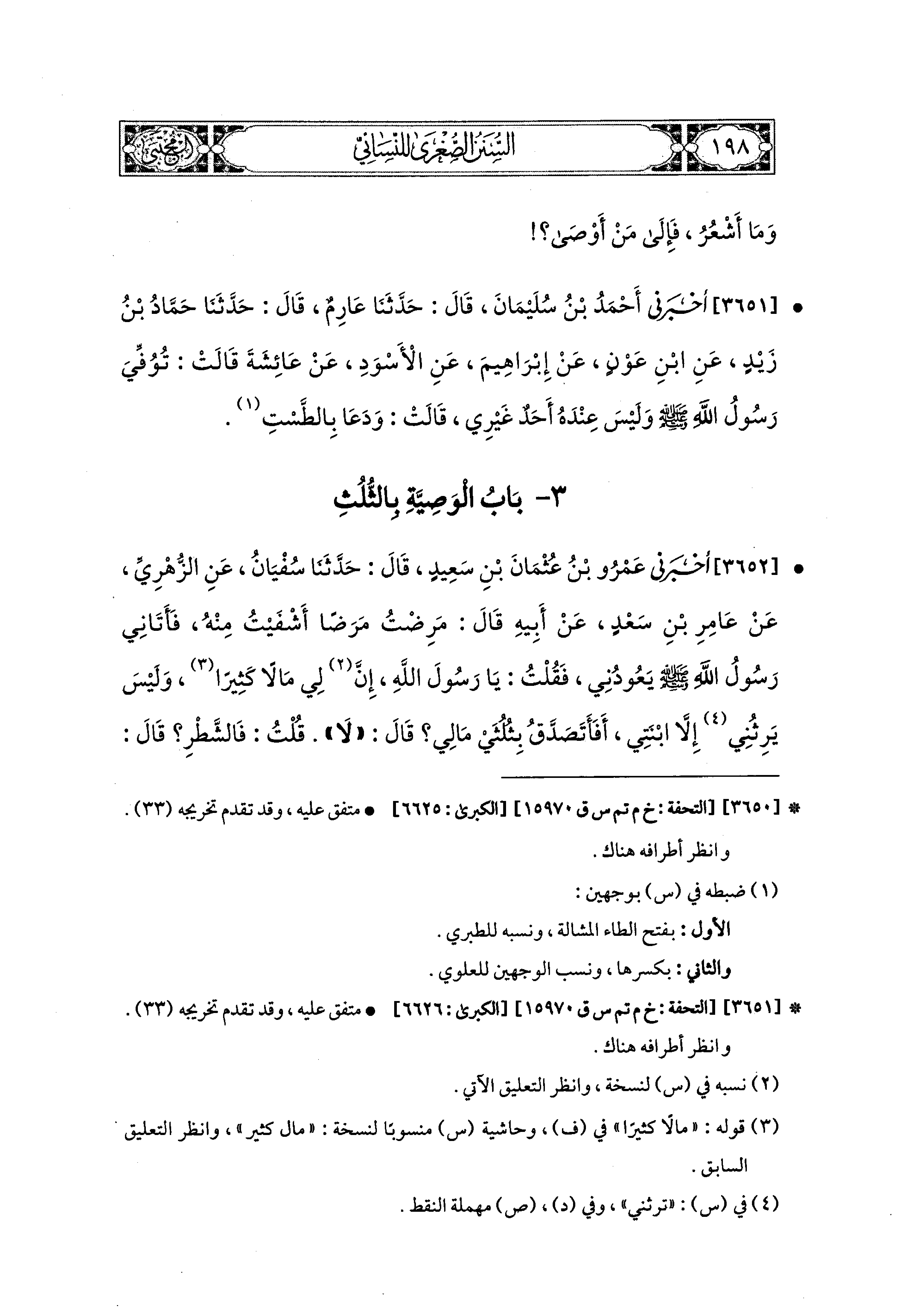 3652- أَخْبَرَني عَمْرُو بْنُ عُثمَانَ بْنِ سَعيدٍ، قال: حَدثنا سُفْيَانُ، عَنِ الزُّهْرِيِّ، عَن عَامِرِ بْنِ سَعْدٍ، عَن أَبِيهِ، قَالَ: مَرِضْتُ مَرَضًا أَشْفَيْتُ مِنْهُ، فَأَتَاني رَسُولُ اللهِ صَلى الله عَليه وسَلم يَعُودُني، فَقُلْتُ: يَا رَسُولَ اللهِ، إِنَّ لِي مَالاً كَثِيرًا، وَلَيْسَ يَرِثُني إِلاَّ ابْنَتِي، أَفَأَتَصَدَّقُ بِثُلُثَيْ مَالِي؟ قَالَ: لاَ، قُلْتُ: فَالشَّطْرَ؟ قَالَ: لاَ، قُلْتُ: فَالثُّلُثَ؟ قَالَ: الثُّلُثَ، وَالثُّلُثُ كَثِيرٌ، إِنَّكَ أَنْ تَتْرُكَ وَرَثَتَكَ أَغْنيَاءَ خَيْرٌ لَهُمْ مِنْ أَنْ تَتْرُكَهُمْ عَالَةً يَتَكَفَّفُونَ النَّاسَ.