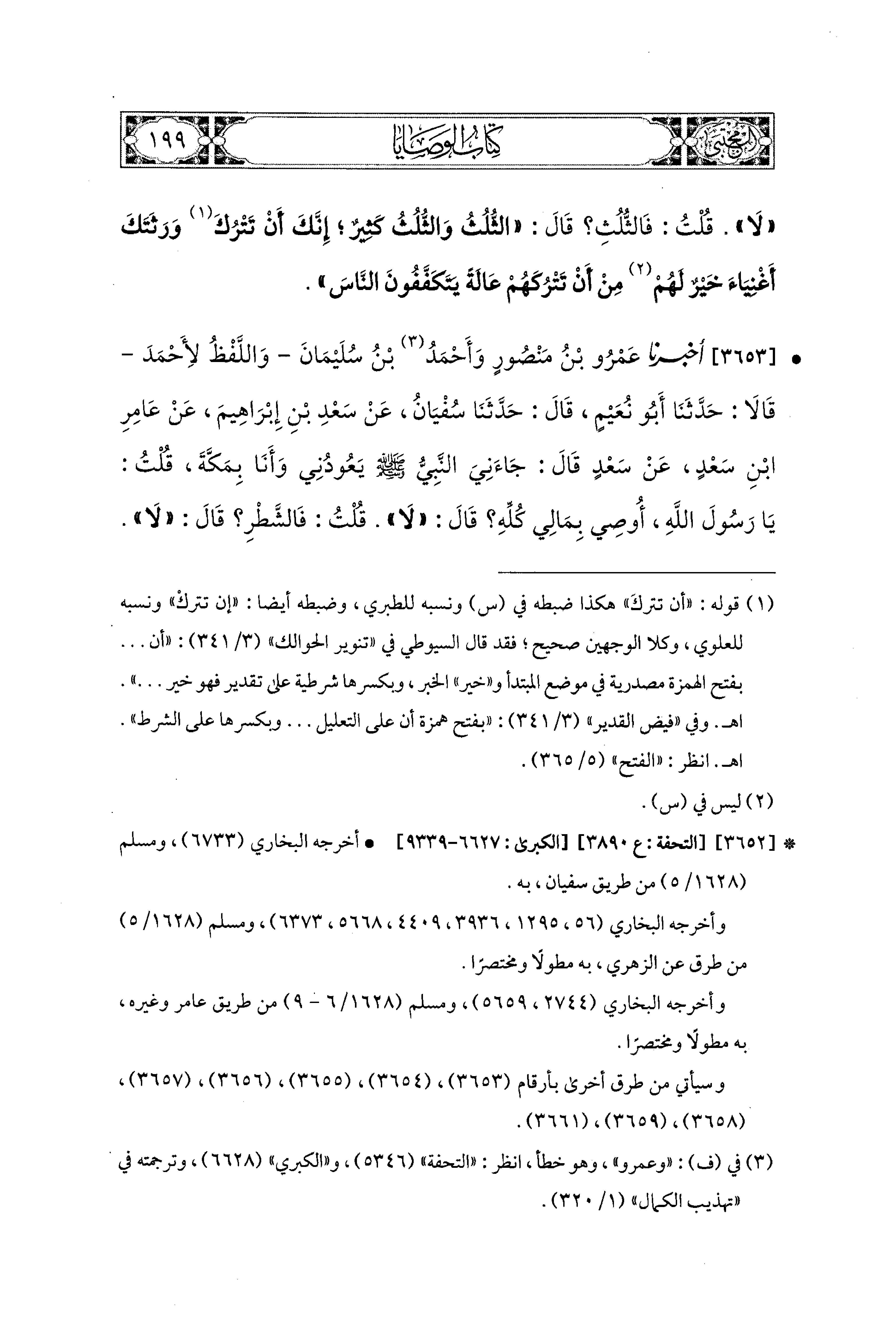 3653- أَخبَرَنا عَمْرُو بْنُ مَنْصُورٍ، وَأَحْمَدُ بْنُ سُلَيمَانَ، وَاللَّفْظُ لأَحْمَدَ قَالاَ: حَدَّثَنَا أَبو نُعَيْمٍ، قال: حَدثنا سُفْيَانُ، عَن سَعْدِ بْنِ إِبراهِيمَ، عَن عَامِرِ بْنِ سَعْدٍ، عَن سَعْدٍ، قَالَ: جَاءَني النَّبيُّ صَلى الله عَليه وسَلم يَعُودُني وَأَنَا بِمَكَّةَ، قُلْتُ: يَا رَسُولَ اللهِ، أُوصِي بِمَالِي كُلِّهِ؟ قَالَ: لاَ، قُلْتُ: فَالشَّطْرَ؟ قَالَ: لاَ، قُلْتُ: فَالثُّلُثَ؟ قَالَ: الثُّلُثَ، وَالثُّلُثُ كَثِيرٌ، إِنَّكَ أَنْ تَدَعَ وَرَثَتَكَ أَغْنيَاءَ خَيْرٌ مِنْ أَنْ تَدَعَهُمْ عَالَةً يَتَكَفَّفُونَ النَّاسَ، يَتَكَفَّفُونَ فِي أَيْدِيهِمْ.