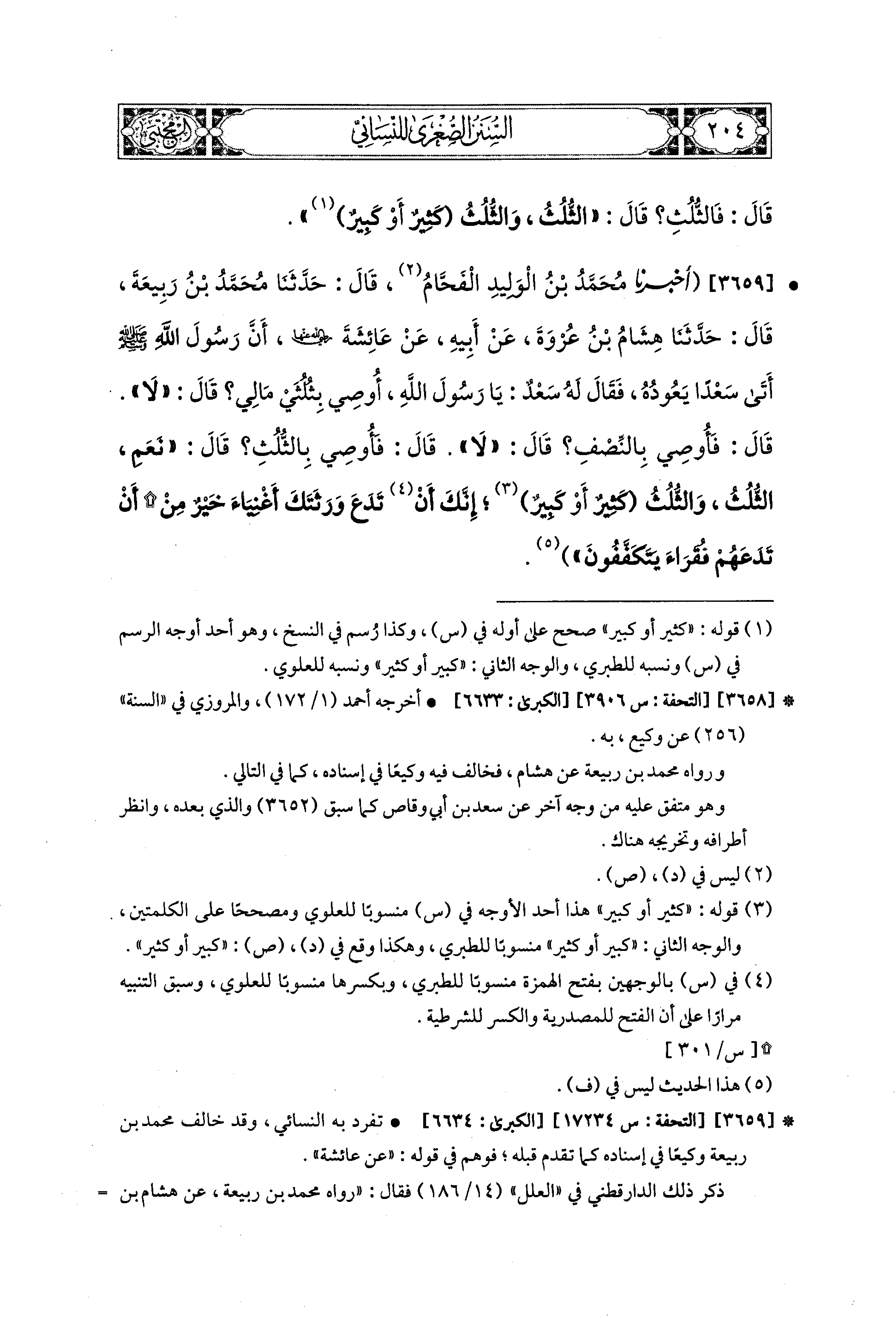 3659- أَخبَرَنا مُحَمد بْنُ الوَلِيدِ الفَحَّامُ، قال: حَدثنا مُحَمدُ بْنُ رَبِيعَةَ، قال: حَدثنا هِشَامُ بْنُ عُرْوَةَ، عَن أَبِيهِ، عَن عَائِشَةَ رضي الله عنها، أَنَّ رَسُولَ اللهِ صَلى الله عَليه وسَلم أَتَى سَعْدًا يَعُودُهُ، فَقَالَ لَهُ سَعْدٌ: يَا رَسُولَ اللهِ، أُوصِي بِثُلُثَيْ مَالِي؟ قَالَ: لاَ، قَالَ: فَأُوصِي بِالنِّصْفِ؟ قَالَ: لاَ، قَالَ: فَأُوصِي بِالثُّلُثِ؟ قَالَ: نَعَمْ، الثُّلُثَ، وَالثُّلُثُ كَثِيرٌ، أَوْ كَبِيرٌ، إِنَّكَ أَنْ تَدَعَ وَرَثَتَكَ أَغْنيَاءَ خَيْرٌ مِنْ أَنْ تَدَعَهُمْ فُقَرَاءَ يَتَكَفَّفُونَ.