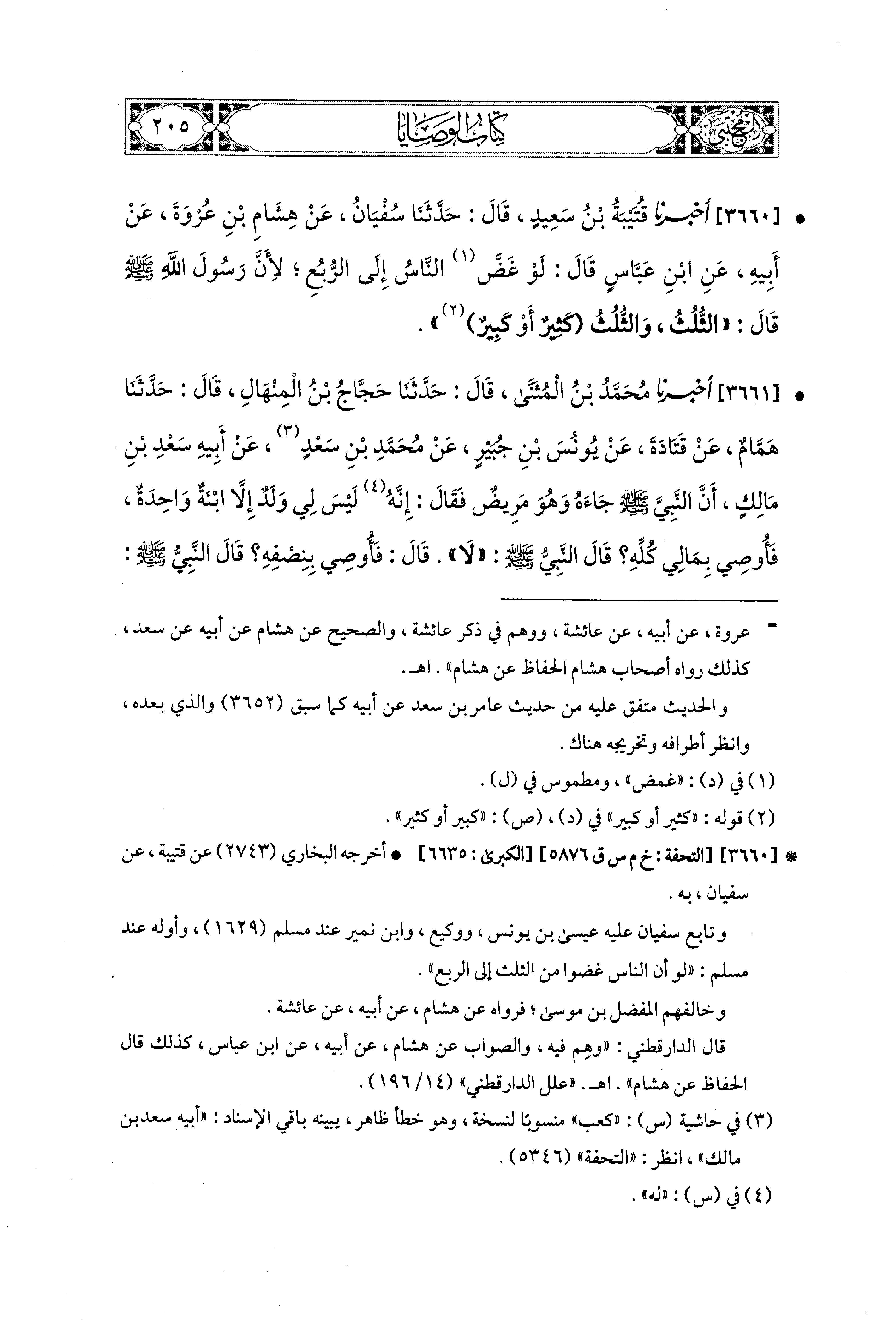 3660- أَخبَرَنا قُتَيبَةُ بْنُ سَعيدٍ، قال: حَدثنا سُفْيَانُ، عَن هِشَامِ بْنِ عُرْوَةَ، عَن أَبِيهِ، عَنِ ابنِ عَبَّاسٍ، قَالَ: لَوْ غَضَّ النَّاسُ إِلَى الرُّبُعِ لأَنَّ رَسُولَ اللهِ صَلى الله عَليه وسَلم قَالَ: الثُّلُثَ، وَالثُّلُثُ كَثِيرٌ، أَوْ كَبِيرٌ.