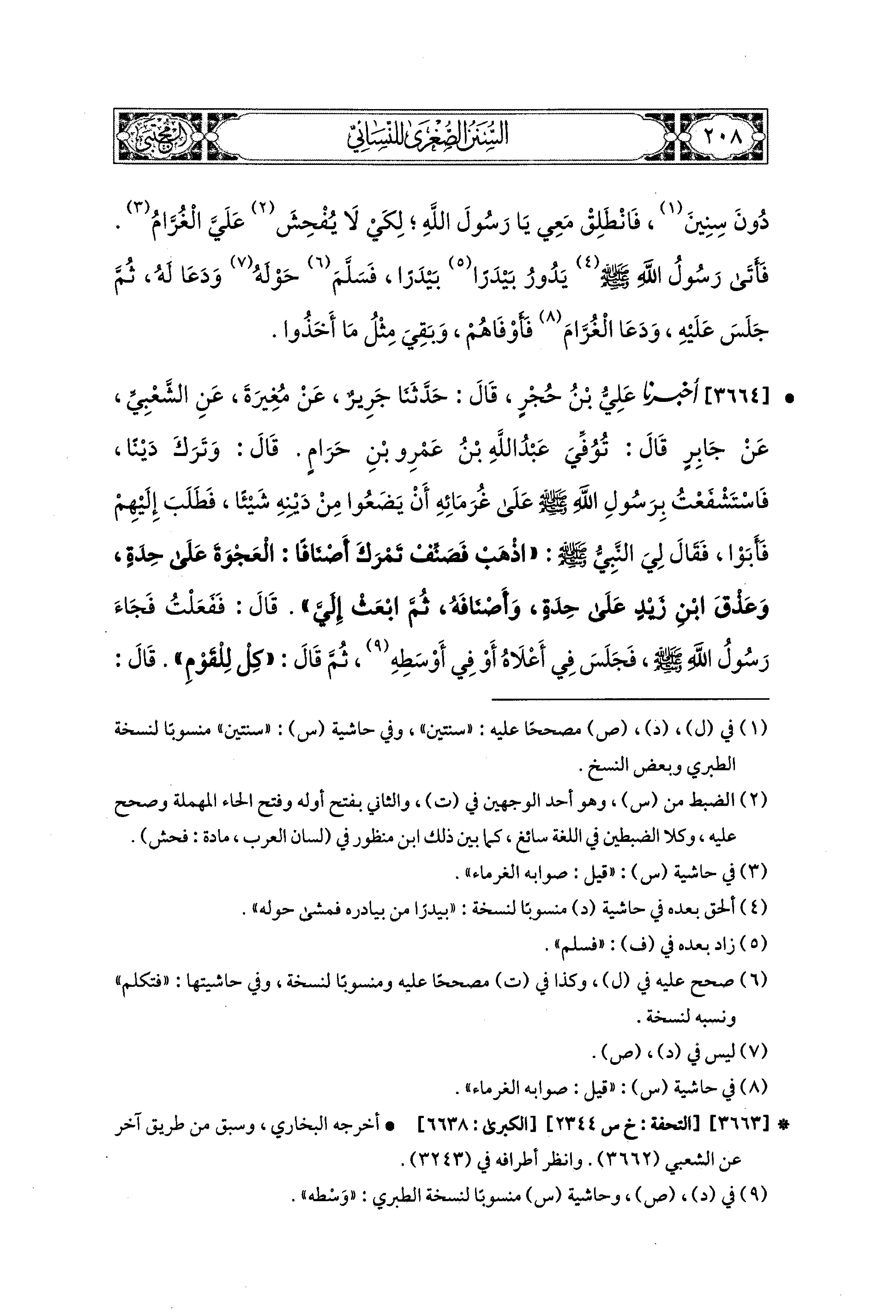 3664- أَخبَرَنا عَلِيُّ بْنُ حُجْرٍ، قال: حَدثنا جَرِيرٌ، عَن مُغِيرَةَ، عَنِ الشَّعْبِيِّ، عَن جَابِرٍ، قَالَ: تُوُفِّيَ عَبدُ اللهِ بْنُ عَمْرِو بْنِ حَرَامٍ، قَالَ: وَتَرَكَ دَيْنًا فَاسْتَشْفَعْتُ بِرَسُولِ اللهِ صَلى الله عَليه وسَلم عَلَى غُرَمَائِهِ أَنْ يَضَعُوا مِنْ دَيْنِهِ شَيْئًا، فَطَلَبَ إِلَيْهِمْ فَأَبَوْا، فَقَالَ لِي النَّبيُّ صَلى الله عَليه وسَلم: اذْهَبْ فَصَنِّفْ تَمْرَكَ أَصْنَافًا، العَجْوَةَ عَلَى حِدَةٍ، وَعِذْقَ ابنِ زَيْدٍ عَلَى حِدَةٍ، وَأَصْنَافَهُ ثُمَّ ابْعَثْ إِلَيَّ، قَالَ: فَفَعَلْتُ، فَجَاءَ رَسُولُ اللهِ صَلى الله عَليه وسَلم، فَجَلَسَ فِي أَعْلاَهُ، أَوْ فِي أَوْسَطِهِ، ثُمَّ قَالَ: كِلْ لِلْقَوْمِ، قَالَ: فَكِلْتُ لَهُمْ حَتَّى أَوْفَيْتُهُمْ، ثُمَّ بَقِيَ تَمْرِي كَأَنْ لَمْ يَنْقُصْ مِنْهُ شَيْءٌ.
