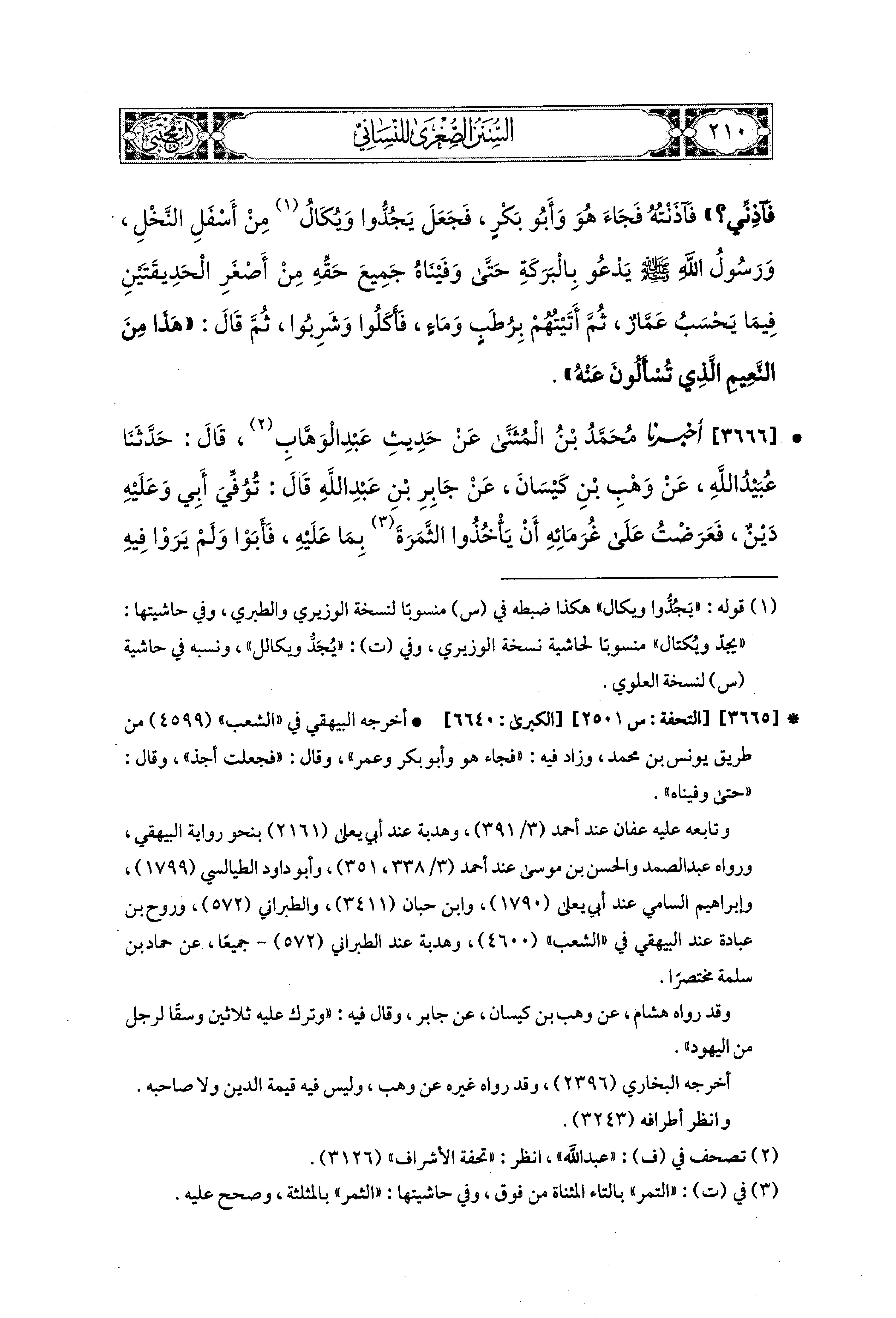 3666- أَخبَرَنا مُحَمد بْنُ المُثَنَّى، عَن حَدِيثِ عَبدِ الوَهَّابِ، قال: حَدثنا عُبَيدُ اللهِ، عَن وَهْبِ بْنِ كَيْسَانَ، عَن جَابِرِ بْنِ عَبدِ اللهِ، قَالَ: تُوُفِّيَ أَبِي وَعَلَيْهِ دَيْنٌ، فَعَرَضْتُ عَلَى غُرَمَائِهِ أَنْ يَأْخُذُوا الثَّمَرَةَ بِمَا عَلَيْهِ فَأَبَوْا، وَلَمْ يَرَوْا فِيهِ وَفَاءً، فَأَتَيْتُ رَسُولَ اللهِ صَلى الله عَليه وسَلم فَذَكَرْتُ ذَلِكَ لَهُ، قَالَ: إِذَا جَدَدْتَهُ فَوَضَعْتَهُ فِي المِرْبَدِ فَآذِنِّي، فَلَمَّا جَدَدْتُهُ وَوَضَعْتُهُ فِي المِرْبَدِ أَتَيْتُ رَسُولَ اللهِ صَلى الله عَليه وسَلم، فَجَاءَ وَمَعَهُ أَبو بَكْرٍ وَعُمَرُ، فَجَلَسَ عَلَيْهِ وَدَعَا بِالبَرَكَةِ، ثُمَّ قَالَ: ادْعُ غُرَمَاءَكَ فَأَوْفِهِمْ، قَالَ: فَمَا تَرَكْتُ أَحَدًا لَهُ عَلَى أَبِي دَيْنٌ إِلاَّ قَضَيْتُهُ، وَفَضَلَ لِي ثَلاَثَةَ عَشَرَ وَسْقًا، فَذَكَرْتُ ذَلِكَ لَهُ فَضَحِكَ، وَقَالَ: ائْتِ أَبَا بَكْرٍ وَعُمَرَ، فَأَخْبِرْهُمَا ذَلِكَ، فَأَتَيْتُ أَبَا بَكْرٍ وَعُمَرَ فَأَخْبَرْتُهُمَا، فَقَالاَ: قَدْ عَلِمْنَا إِذْ صَنَعَ رَسُولُ اللهِ صَلى الله عَليه وسَلم مَا صَنَعَ أَنَّهُ سَيَكُونُ ذَلِكَ.