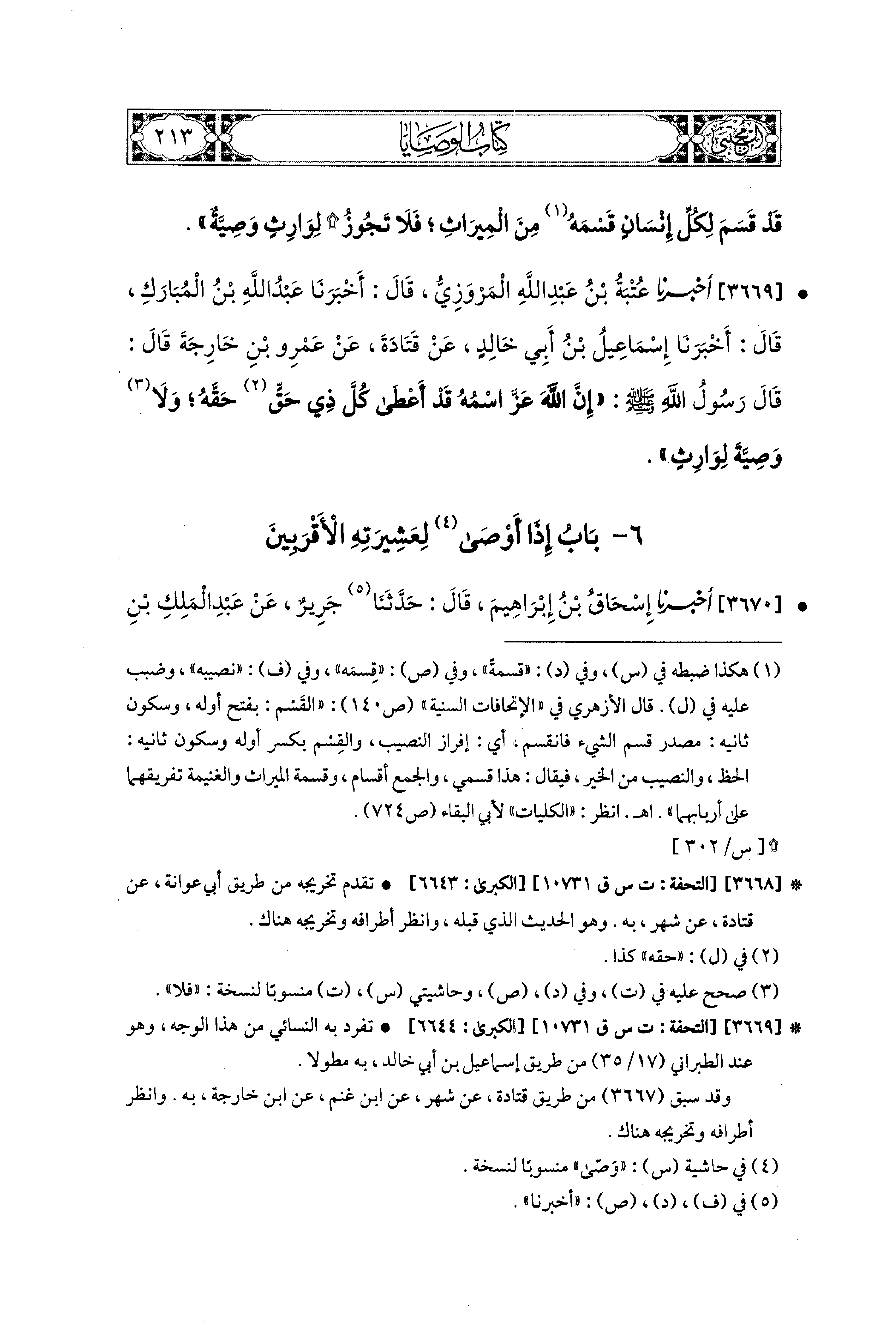 3669- أَخبَرَنا عُتْبَةُ بْنُ عَبدِ اللهِ المَرْوَزِيُّ، قَالَ: أَخبَرنا عَبدُ اللهِ بْنُ المُبَارَكِ، قَالَ: أَخبَرنا إِسماعِيلُ بْنُ أَبِي خَالِدٍ، عَن قَتَادَةَ، عَن عَمْرِو بْنِ خَارِجَةَ، قَالَ: قَالَ رَسُولُ اللهِ صَلى الله عَليه وسَلم: إِنَّ اللهَ عَزَّ اسْمُهُ قَدْ أَعْطَى كُلَّ ذِي حَقٍّ حَقَّهُ، وَلاَ وَصِيَّةَ لِوَارِثٍ.