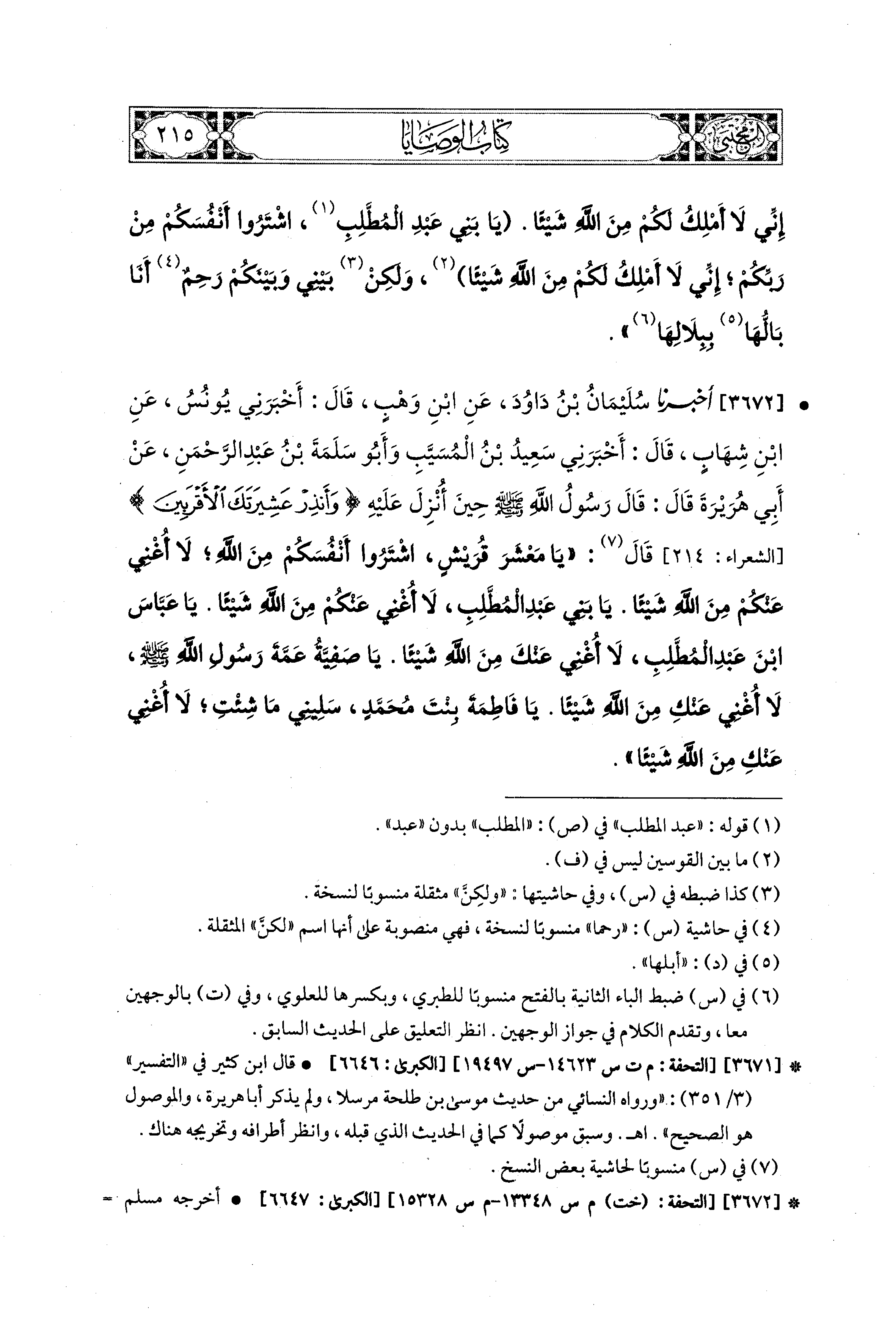 3672- أَخبَرَنا سُلَيمَانُ بْنُ دَاوُدَ، عَنِ ابنِ وَهْبٍ، قَالَ: أَخْبَرَني يُونُسُ، عَنِ ابنِ شِهَابٍ، قَالَ: أَخْبَرَني سَعيدُ بْنُ المُسَيَّبِ، وَأَبو سَلَمَةَ بْنُ عَبدِ الرَّحمَنِ، عَن أَبِي هُرَيرَةَ، قَالَ: قَالَ رَسُولُ اللهِ صَلى الله عَليه وسَلم حِينَ أُنْزِلَ عَلَيْهِ {وَأَنْذِرْ عَشِيرَتَكَ الأَقْرَبِينَ}، قَالَ: يَا مَعْشَرَ قُرَيْشٍ اشْتَرُوا أَنْفُسَكُمْ مِنَ اللهِ، لاَ أُغْني عَنْكُمْ مِنَ اللهِ شَيْئًا، يَا بَني عَبدِ المُطَّلِبِ، لاَ أُغْني عَنْكُمْ مِنَ اللهِ شَيْئًا، يَا عَبَّاسُ بْنَ عَبدِ المُطَّلِبِ، لاَ أُغْني عَنْكَ مِنَ اللهِ شَيْئًا، يَا صَفِيَّةُ عَمَّةَ رَسُولِ اللهِ صَلى الله عَليه وسَلم، لاَ أُغْني عَنْكِ مِنَ اللهِ شَيْئًا، يَا فَاطِمَةُ بِنْتَ مُحَمدٍ، سَلِيني مَا شِئْتِ، لاَ أُغْني عَنْكِ مِنَ اللهِ شَيْئًا.