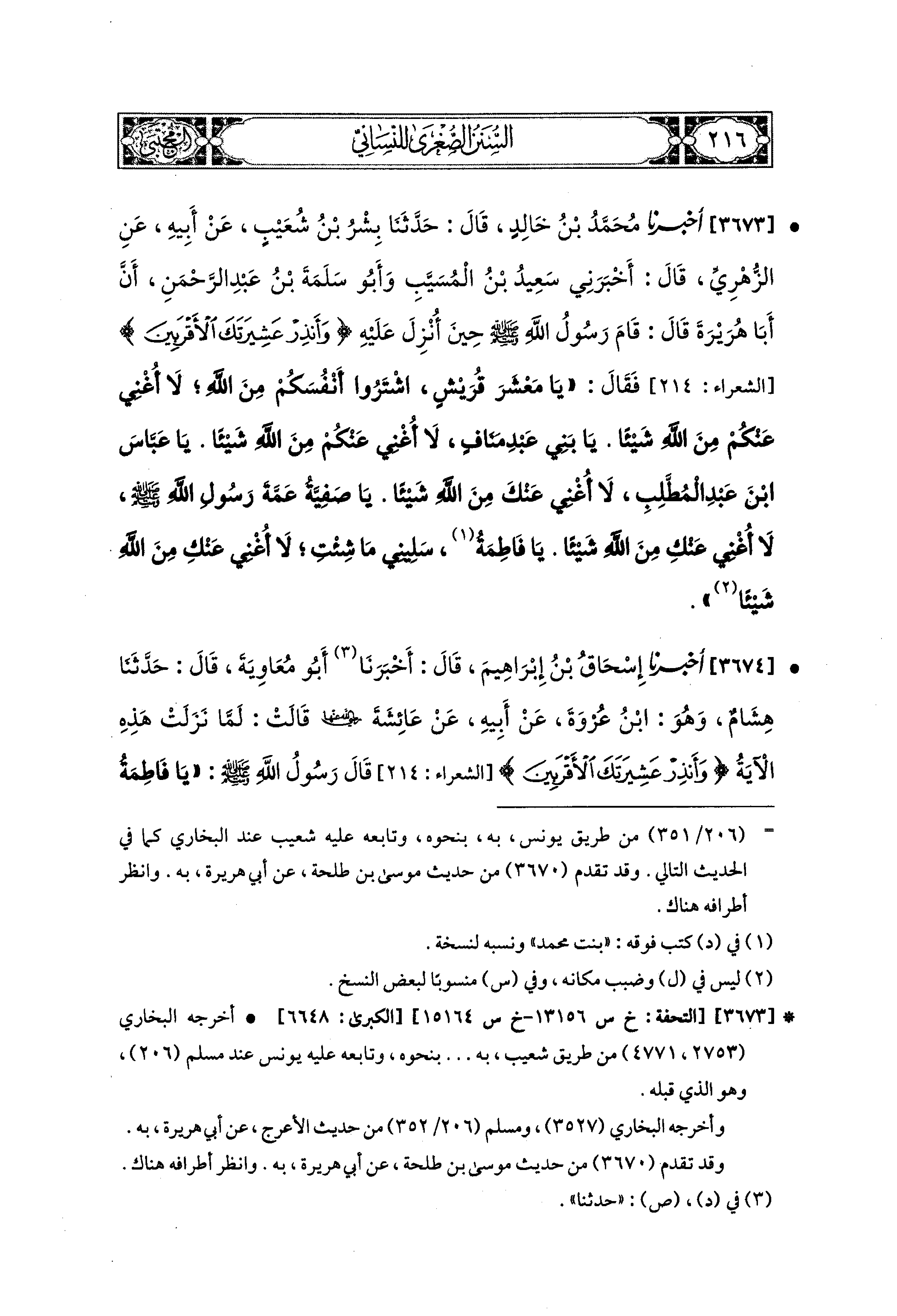3673- أَخبَرَنا مُحَمد بْنُ خَالِدٍ، قال: حَدثنا بِشْرُ بْنُ شُعَيبٍ، عَن أَبِيهِ، عَنِ الزُّهْرِيِّ، قَالَ: أَخْبَرَني سَعيدُ بْنُ المُسَيَّبِ، وَأَبو سَلَمَةَ بْنُ عَبدِ الرَّحمَنِ، أَنَّ أَبَا هُرَيرَةَ، قَالَ: قَامَ رَسُولُ اللهِ صَلى الله عَليه وسَلم حِينَ أُنْزِلَ عَلَيْهِ {وَأَنْذِرْ عَشِيرَتَكَ الأَقْرَبِينَ} فَقَالَ: يَا مَعْشَرَ قُرَيْشٍ، اشْتَرُوا أَنْفُسَكُمْ مِنَ اللهِ، لاَ أُغْني عَنْكُمْ مِنَ اللهِ شَيْئًا، يَا بَني عَبدِ مَنَافٍ، لاَ أُغْني عَنْكُمْ مِنَ اللهِ شَيْئًا، يَا عَبَّاسُ بْنَ عَبدِ المُطَّلِبِ، لاَ أُغْني عَنْكَ مِنَ اللهِ شَيْئًا، يَا صَفِيَّةُ عَمَّةَ رَسُولِ اللهِ صَلى الله عَليه وسَلم، لاَ أُغْني عَنْكِ مِنَ اللهِ شَيْئًا، يَا فَاطِمَةُ، سَلِيني مَا شِئْتِ لاَ أُغْني عَنْكِ مِنَ اللهِ شَيْئًا.