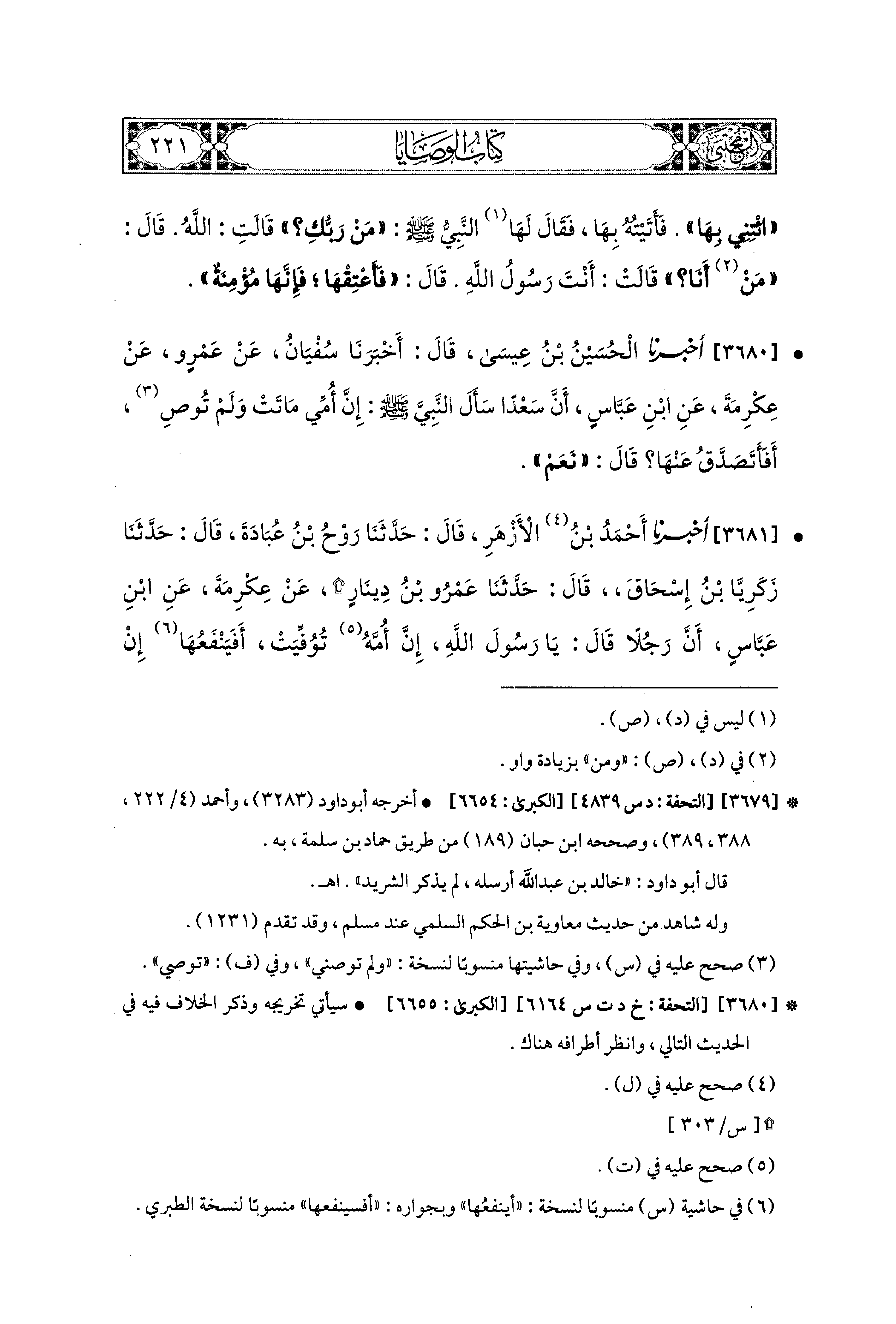 3681- أَخبَرَنا أَحْمَدُ بْنُ الأَزْهَرِ، قال: حَدثنا رَوْحُ بْنُ عُبَادَةَ، قال: حَدثنا زَكَرِيَّا بْنُ إِسحَاقَ، قال: حَدثنا عَمْرُو بْنُ دِينَارٍ، عَن عِكْرِمَةَ، عَنِ ابنِ عَبَّاسٍ؛ أَنَّ رَجُلاً قَالَ: يَا رَسُولَ اللهِ، إِنَّ أُمَّهُ تُوُفِّيَتْ أَفَيَنْفَعُهَا إِنْ تَصَدَّقْتُ عَنْهَا؟ قَالَ: نَعَمْ، قَالَ: فَإِنَّ لِي مَخْرَفًا وَأُشْهِدُكَ أَنِّي قَدْ تَصَدَّقْتُ بِهِ عَنْهَا.